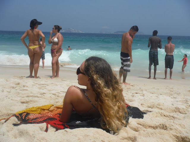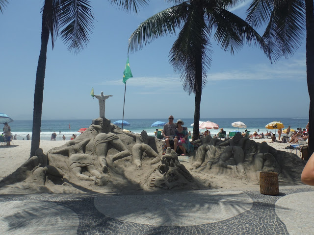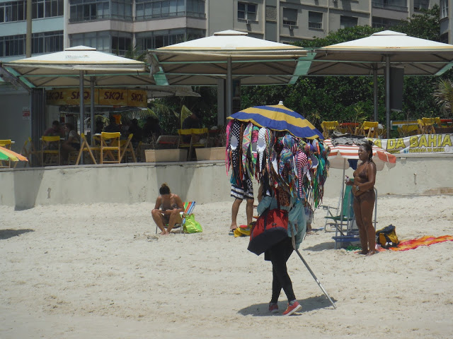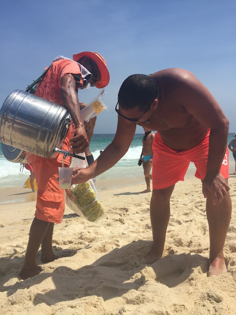 לאורך החוף יש תחנות הצלה ממוספרות, אז לקחנו אובר לתחנה מס' 3 בחוף קופקבנה. הלכנו לאורך החוף, הצטלמנו עם פסלי החול היפים, שתינו מי קוקוס וטיילנו לאורך המים. היה יום חג והחוף היה מלא במקומיים, זוגות ומשפחות. הלכנו ברגל עד תחנת הצלה 9 בחוף איפנמה ( זה לוקח זמן, המרחק לא קטן) שם פגשנו את שלומית, איציק ונויה שבילו בחוף מהבוקר. שכרנו כסאות ושמשיה (26 ריאל) ופשוט הסתלבטנו. אחד הדברים הנחמדים בחופי ברזיל זו התעבורה הבלתי פוסקת של רוכלים. אפשר לשבת במקום אחד ולבנות מחטיפים, גלידות, שתיה, קוקטיילים, גבינה מותכת, מי קוקוס ועוד, ולקנות בגדי ים, משקפי שמש, תכשיטים זולים, פראו ועוד, כל זה בלי לזוז מהמקום!