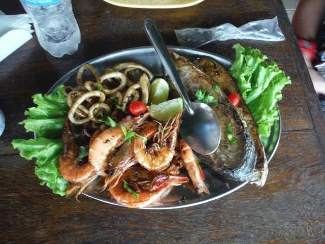 מרחק הליכה קצר משם ישבנו במסעדה על המים לארוחת צהרים, כשבנוסף לפלטת פירות ים ודגים מרהיבה, קיבלנו גם קרם הגנה נגד יתושים, שיהיה.