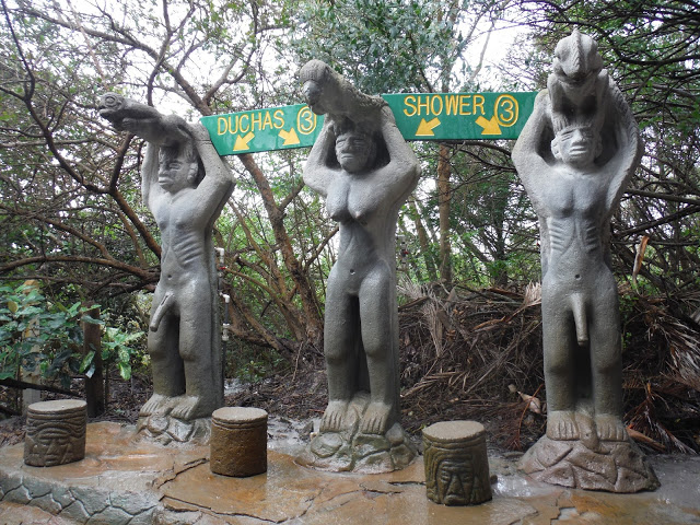 עשינו את סיבוב ההליכה סביב איזור הבריכות החמות, ראינו קיטור שיוצא מהאדמה, בוץ מבעבע, בריכות מים רותחים… והריח. האמת? מגניב ביותר! למזלנו היה יום נעים יחסית ואפילו ירד קצת גשם. לא יכולה לדמיין כמה חם במקום הזה כשחם ויבש. לקטע הזה מומלץ לבוא בנעליים סגורות. קצת חבל שאין הסברים. אחרי הסיור הקצר (15-20 דקות) התפשטנו לבגדי הים ונכנסנו לבריכת בוץ. התמרחנו היטב בבוץ חם וחיכינו שיתייבש קצת. ניגשנו למקלחות להישטף ושם חיכתה לנו הפתעה מצחיקה – המקלחות בצורת פסלים של שני גברים ואשה… ערומים! שטפנו את הבוץ ונכנסנו לבריכות החמות. יש אחת קרה (נראה לכם?) אחת פושרת (התחלנו בה) ואחת חמה (הכי פינוק). בסוף ייבשנו את עצמנו, והחלפנו בגדים לאור פנס האייפון. במקום אין מגבות אז צריך להביא אתכם. לנו לא היו, אבל היו לנו שני פראו (סדיני חוף) שהצלחנו להתנגב איתם.
