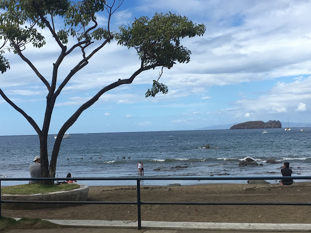 חשבנו להתחיל את היום בחוף של העיר הקרובה – פלאיה דל קוקו Playa del Coco. נסענו משהו כמו חצי שעה מהמלון, ואפילו מצאנו חניה, אבל כשהתקרבנו לחוף ראינו שיש המון שקנאים במים. ואין מצב שמיקה חולקת חוף עם שקנאים. וחוץ מזה העיירה די ג'יפה, מלא ספקי תיירות שקופצים עליך מכל פינה, חנויות שוק של קשקושים לתיירים, וסך הכל לא לטעמנו המפונק. אז עשינו אחורה פנה, קניתי טישרט לאוסף בחנות של ההארד רוק קפה וחזרנו למלון.