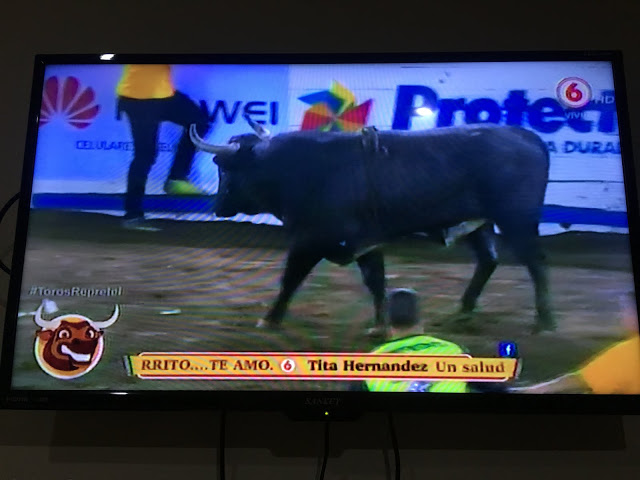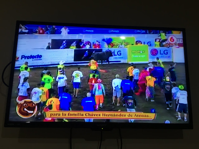 בחזרה לקח אותנו הבעלים של השייט, קוסטריקני ממוצא אירופאי (גרמני?) שדיבר אנגלית מעולה. הוא סיפר לנו על האיזור שמתמחה בחקלאות של סוכר וגידול דגי טילאפה בבריכות, וגם הסביר לנו שהמבנה העגול שעברנו בדרך הוא אצטדיון למלחמות שוורים – מנהג שהספרדים הביאו לאיזור. בערב צפינו במלחמות השוורים בטלוויזיה. לא הורגים את השור אבל מעצבנים אותו עשרות אנשים בזירה. די עצוב.