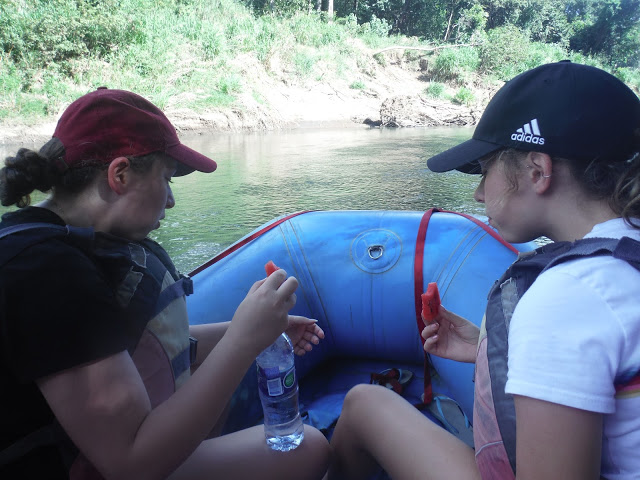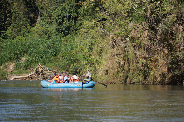 ממש קצת בהמשך הכביש נמצאת המסעדה ממנה יצאנו לשייט. גם אם אתם לא יוצאים לשייט, שווה לעצור לאכול שם. הנוף מהמם והאוכל סבבה. על העץ שליד המסעדה ראינו איגואנה ענקית, סמל לבאות – האיזור מלא, אבל מלא באיגואנות. הארוחה שהיתה כלולה בדיל עם השייט היתה קצת יותר מושקעת מהרגיל וכללה בנוסף לעוף עם אורז הסטנדרטי גם סלט וגלידה. יש אפשרות לעשות קודם שייט ואז ארוחה או קודם ארוחה ואז שייט. אנחנו תאמנו מראש באימייל כמה ימים לפני ושילמנו במקום. לשייט אפשר לבחור בין רפטינג אתגרי לשייט רגוע, ואנחנו בחרנו בשני. לקחו אותנו ברכב לנקודת היציאה של השייט, שם קיבלנו חגורות הצלה ויצאנו לדרך בסירת גומי. בשייט הזה לא נרטבים, רק הנעליים – נעם היה עם קרוקס, אני עם נעלי ים והבנות בכפכפים. השייט נע בעצלתיים עם הנהר כשמדי פעם יש כמה אבנים שגורמות לאדוה קטנה. הכי רגוע שיש. המדריך שגם ניווט הראה לנו המון בעלי חיים, מלא איגואנות, ציפורים, תנינים וקופים שואגים שישנו שנ״צ. באמצע הדרך עצרנו להפסקת מים ופירות קרים שהמדריך שלף. היה קצת חם אבל מקסים ממש. חוויה כיפית, רק חבל שהאנגלית של המדריך היתה חלשה יחסית למדריכים אחרים שנתקלנו בהם.