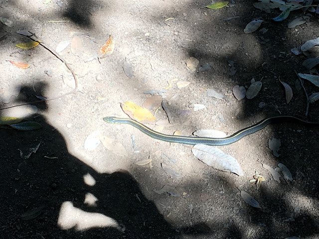 בדרך פגשנו נחש צעיר מתחמם לו בשמש. השלט בכניסה זיהה אותו כ- Garter Snake (וגוגל תרגם לנחש בירית מצוי). לא מסוכן. צילמנו ונתנו לו לעבור בשקט. ראינו גם קצת פרחים, ושמענו נקר. אריה הרים לשמחתי לא פגשנו, אם כי השלטים בכניסה מרמזים על קיומם באיזור.