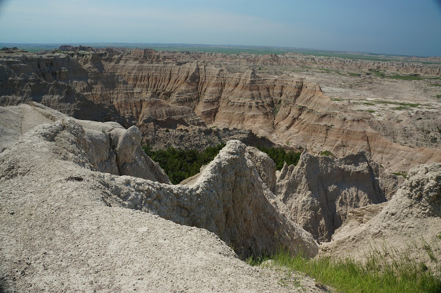 כיוון שאתמול חזרנו מאוחר אחרי יום ארוך, ישנו קצת יותר ויצאנו בערך בעשר. נסענו כשעה עד הכניסה לפארק האדמות הרעות – הבדלנדס Badlands. בניגוד לערבה הירוקה שמסביב, הבדלנדס הם שממה מדברית, אבל מרהיבה ממש. נסענו לאורך כביש 240 החוצה את הפארק עם עצירות מדי פעם. הפארק מלא בנופים מדהימים מתקופות גאולוגיות שונות, ויש המון מקומות עצירה מסודרים לתמונות. יש גם מסלולים להליכה, לא עשינו מסלולים קשים אלא רק את מסלול המאובנים שמלמד על בעלי חיים פרהיסטוריים שנמצאו בפארק ומה קרה להם מאז – חלקם נכחדו, חלקם התאימו עצמם לתנאי הסביבה המשתנים (אבולוציה), וחלקם עברו מקום כמו התנינים. יש גם מקום לעצור לראות שכונה של נבחניות.