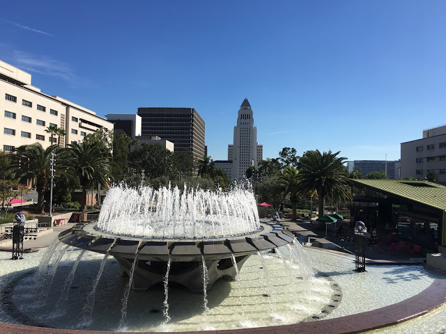 המשכנו במעלה הרחוב והצצנו בבנין הקונצרטים על שם וולט דיסני Walt Disney Concert Hall ובגינת הגג. בתוך הבניין אי אפשר היה לסייר בגלל קונצרט אבל הבנתי שהוא מרשים, ואם אתם חובבי מוסיקה קלאסית, אומרים שהאקוסטיקה מעלפת. משם ירדנו דרך גן גראנד Grand Park לכיוון בניין העיריה. בימי השבוע (שני עד שישי) אפשר לעלות לתצפית בקומה ה-26, כיוון שהיינו בסופ"ש נאלץ לשמור את זה לביקור אחר.