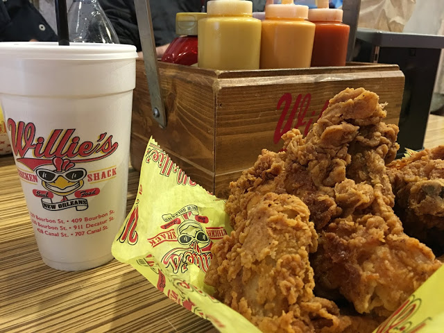 נסענו בחזרה עם השאטל החינמי לכיוון המלון, והלכנו לאכול צהרים ב- Willie's Chicken Shack רשת מזון מהיר שמתמחה בעוף מטוגן, עוד מנה דרומית ידועה. היה מאד טעים וזול, אבל מאד מטוגן. משם הצשכנו לכיוון נהר המיסיסיפי, הלכנו קצת לאורך הנהר והחלטנו להכנס לאקווריום Audubon Aquarium of the Americas. ראינו סרט ממש בינוני על הוריקן קתרינה, הסרט היה ישן והסיפור משונה. חבל, זה נושא מעניין וחשוב. אם אתם הולכים, תנסו את אחד הסרטים האחרים. האקווריום יפה (ויש בו פינגווינים!) אבל לא מאד גדול, ויחסית יקר. עם ילדים צעירים הייתי שמה אותו יותר גבוה במדד התועלת, אבל אנחנו קצת התאכזבנו מהקוטן יחסית למחיר. יש באיזור גם גן חיות וחממת חרקים של אותה עמותה, ויש כרטיס משולב.