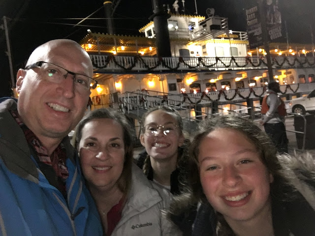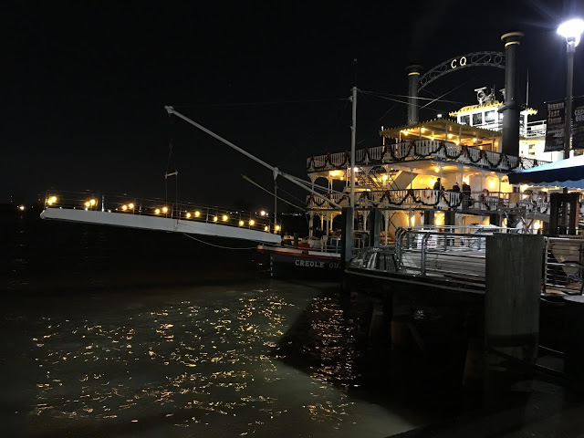 חזרנו למלון לנוח קצת ולהתארגן לארוחת ערב חגיגית לחג המולד בספינה עם מוסיקה Creole Queen. על המיסיסיפי יש מספר ספינות מסורתיות עם הגלגל הגדול מאחורה, והן נוסעות גם בשעות היום, וגם בשעות הערב. ביום אפשר לקבל סיור מודרך עם הסברים, ובערב, ארוחה עם מוסיקה. השייט היה נעים מאד, האוכל לא היה גורמה מתוחכם אבל היה טעים, והוגש בבופה ללא הגבלה, וכלל גם שתיה קלה, שתיה חמה וקינוחים. עבור משקאות אלכוהולים נדרש תשלום בנפרד. ההרכב שניגן היה מבוגר יחסית וחמוד, והיו אפילו כמה זוגות מבוגרים יותר שרקדו על הרחבה הקטנה. יצאנו גם החוצה לכמה דקות לראות את הנוף אבל קפאנו מקור, אז חזרנו מהר פנימה. היו בעיר המון ארוחות חגיגיות ומפוארות לכבוד חג המולד, אבל כיוון שהילדות לא אוכלות דברים מתוחכמים, השייט הזה התאים לנו בול.