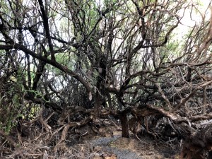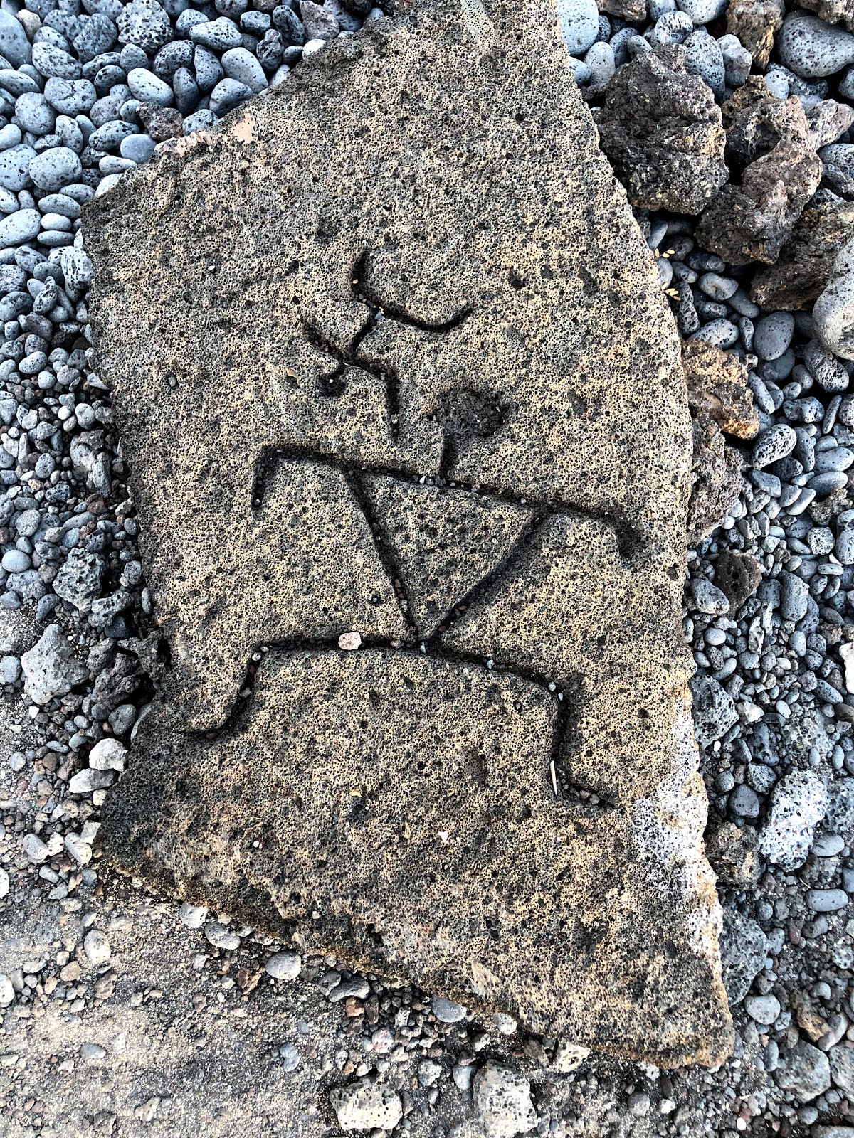 בדרך חזרה לכיוון קונה עצרנו בעוד נקודת ציון מעניינת – פארק הפטרוגליפים Puakō Petroglyph Park. נוסעים לכיוון ריזורט Mauna Lani ועוקבים אחרי השלטים. הכביש מסתיים במגרש חניה ליד החוף. משם אפשר לרדת לחוף (המלא בשברי אלמוגים וממש יפה) או למצוא את הפינה בה מתחיל המסלול למשטח הפטרוגליפים. הפטרוגליפים הם ציורים פרימיטבים שנעשו בסלע הלבה, ייעודם ומקורם לא ידוע, אבל הם נותנם הצצה לעולם עתיק ורחוק. בתחילת המסלול יש איזור נגיש עם דוגמיות של הציורים. המסלול 0.7 מייל (מעל קילומטר) לכל כיוון, התחיל ביער סבוך עם קוצים ושורשים על האדמה. ואנחנו בכפכפים. אז הלכנו כמה עשרות מטרים לפני שהבנו שאנחנו לא מצויידים כמו שצריך ללכת מייל וחצי בכזה שטח ועשינו אחורה פנה. פיספוס של חוסר התארגנות.