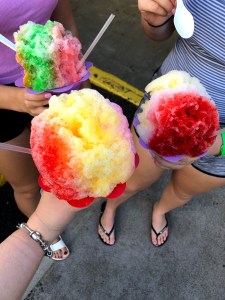 במהלך הנסיעה לשייט עברנו בזריזות ליד עוד פסל של המלך King Kamehameha, שנמצא פה כיוון שזהו מקום הולדתו. אז עשינו גיחה זריזה לצלם, ואז נסענו עם האפליקציה דרך מזג אויר משתנה (הידעתם שבאי הגדול אפשר למצוא 8 איזורי אקלים שונים, כולל מדבר וטרופי?) עד עיר הבוקרים Waimea ובחזרה אל החוף לאכול Shave Ice מרענן ב- Anuenue Ice Cream & Shave Ice. זהו קינוח מקומי אהוב מאד, מתוק מאד, טעים מאד ומרענן מאד, המבוסס על קרח מגורד מבלוק וסירופים מתוקים צבעוניים. אנחנו מתים על זה. היה תור די ארוך אבל חיכינו בסבלנות, היה שווה את זה.
