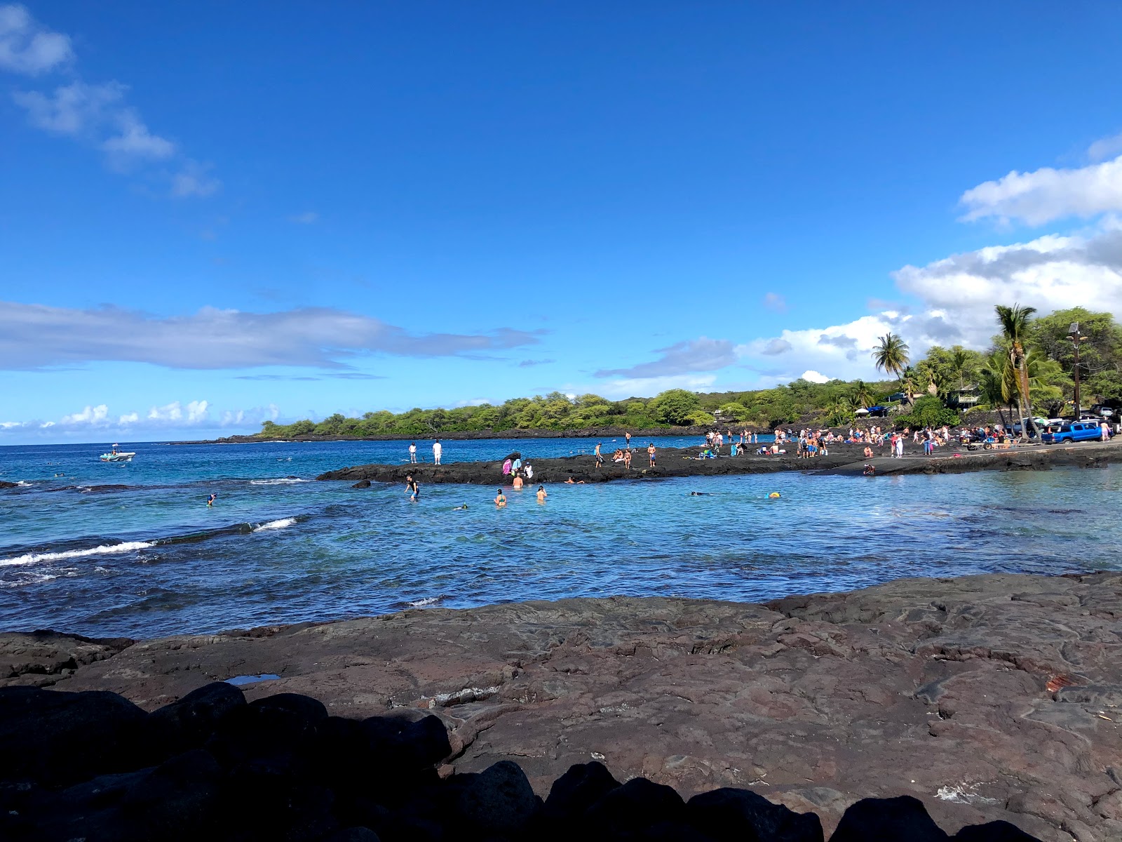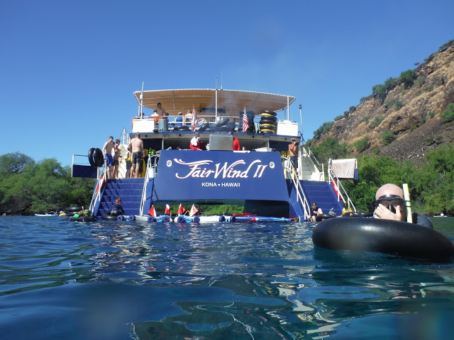 יום שכולו הוזמן מראש, והיה מוצלח מאד. החלק הראשון של היום כלל שייט ספינה לצורך שנורקל במפרץ Kealakekua בו אפשר לראות גם את עמוד הזכרון לקפטן קוק, האירופאי הראשון שהגיע לאיי הוואי ושינה את גורלם. הוא גם נהרג במקום על ידי המקומיים, בגלל חוסר הבנה תרבותי בעיקר (הם גנבו לו סירה, הוא ניסה לחטוף את הצ'יף הראשי שנחשב כמעט אלוהים והמקומיים לא קיבלו את זה יפה), סיפור מעניין. המפרץ נחשב אחד המקומות המוצלחים לשנורקל בגלל שוניות אלמוגים, מים צלולים ושפע דגה, אבל אין אליו גישה קלה מהכביש, אפשר לחנות רחוק ולרדת ברגל או להגיע בשייט. יש ברשת המון אופציות לשייט ושנורקל, בכל מיני קומבינציות ואופרציות, החל מקייאק בשיוט עצמאי, דרך סירות גומי, יאכטה להשכרה ועד הסירות הגדולות וההמוניות יותר. כיוון שאני לא מרגישה טוב על מים, העדפתי לקחת את הסירה הגדולה יותר, ובחרנו בשייט של חברת Fair Winds שכולל גם ארוחת בוקר, ארוחת צהרים, וכל ציוד השנורקל שאפשר לדמיין.