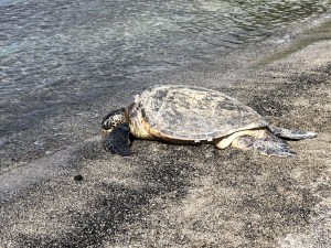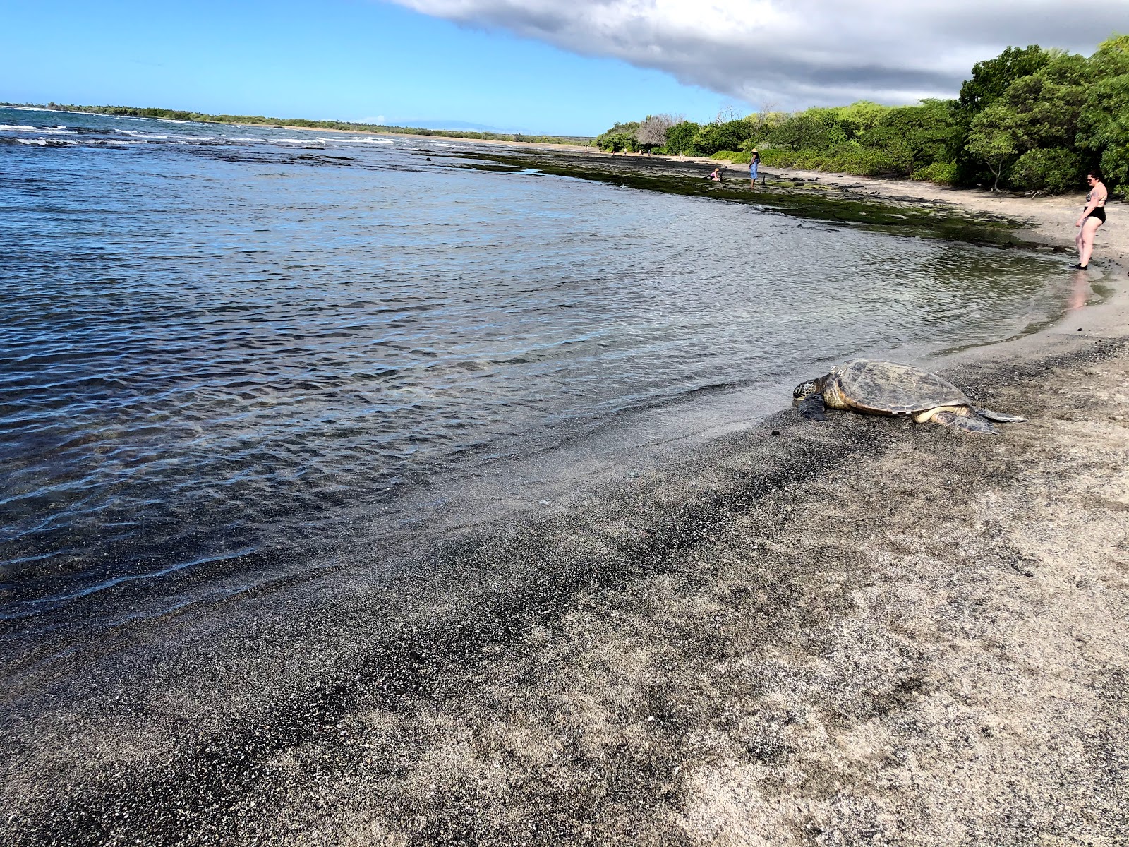 6 ימים בהוואי ועוד לא ראינו צב! אז סיימנו את המסע בביקור בפארק Kaloko-Honokohau שקראתי שיתכן ויהיו בו צבי ים. נסענו לכניסה הראשית של הפארק, ושם שוחחנו עם הריינג'ר שהסביר שאפשר ללכת (בשמש) כ-20 דקות ממרכז המבקרים לכיוון החוף, אבל יש עוד כניסה, צדדית, מהמרינה, שממנה ההליכה לחוף רק 5 דקות. אז נכנסנו לאוטו וחזרנו לנמל לכיוון המסעדה, רק הפעם המשכנו עד סוף הכביש לחניון שבקצה הימני שלו יש שער כניסה לפארק הלאומי. משם באמת 5 דקות הליכה עד החוף (המקסים והרגוע), בו ראינו בריכות טבעיות ו.. צבי ים על החוף ובמים. Mission accomplished.