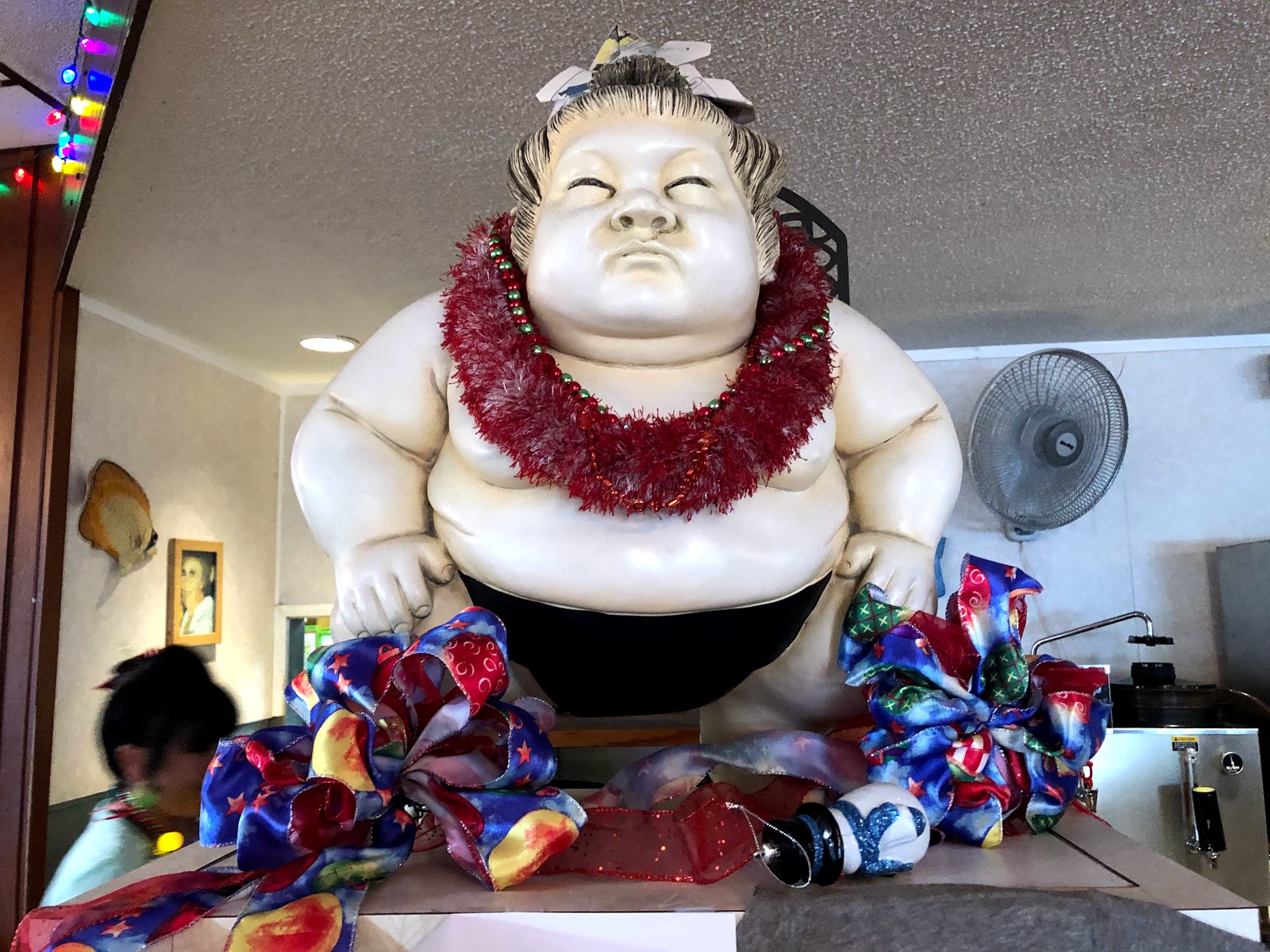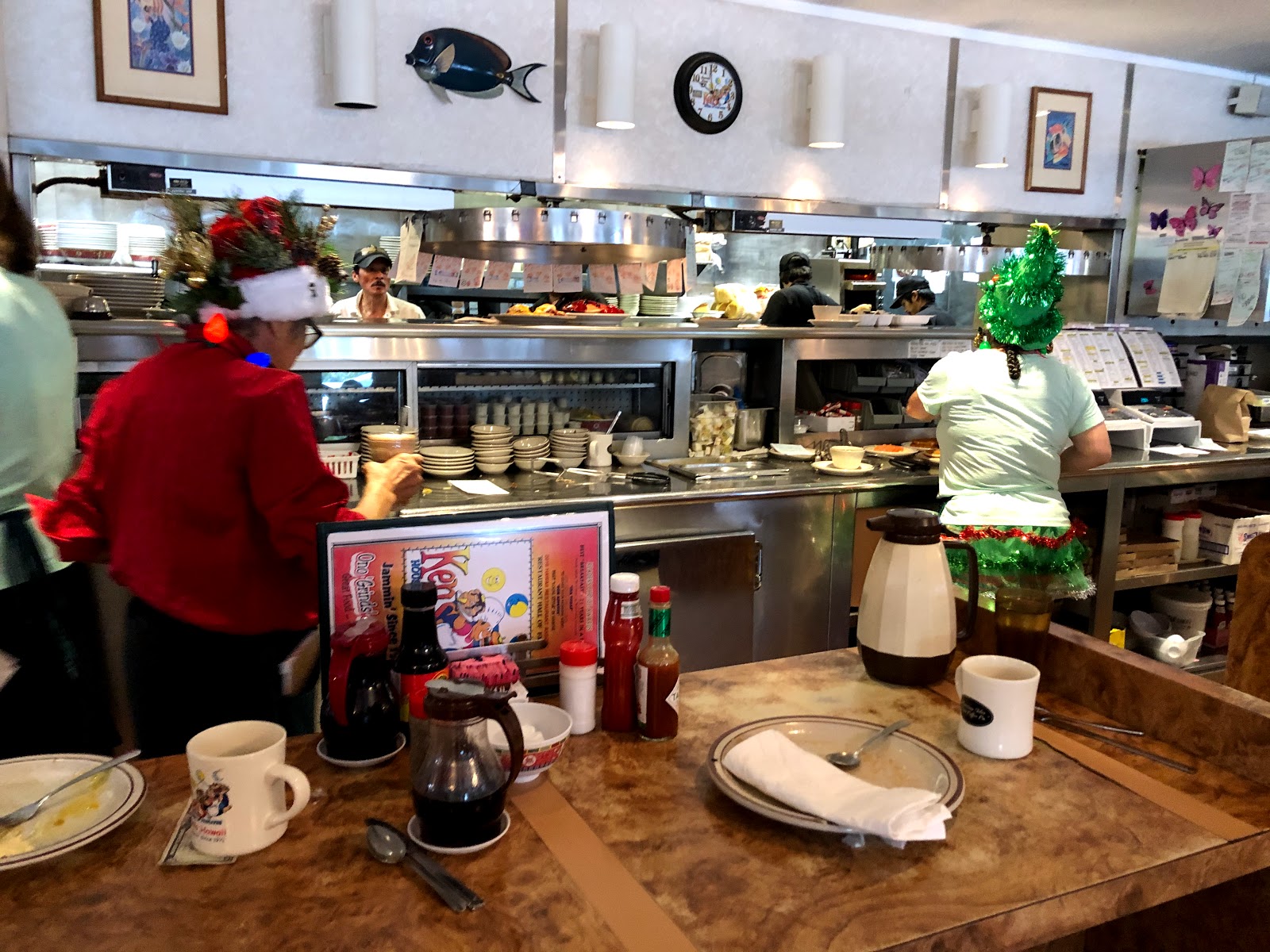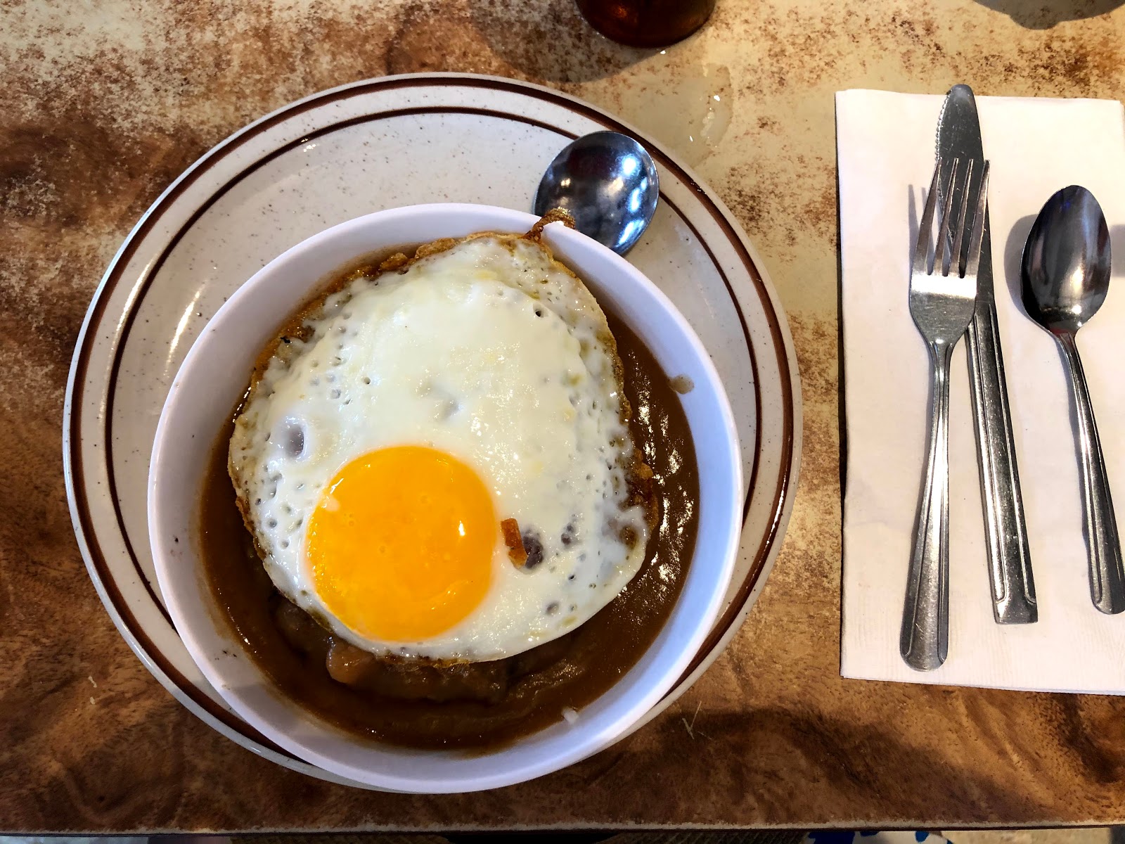 חג מולד, כמעט הכל סגור, אנחנו עוזבים את הילו ומתחילים את הנסיעה לקאילואה-קונה דרך החלק הדרומי של האי. התחלנו בארוחת בוקר באחד המסעדות היחידות שהיו פתוחות (הם פתוחים 24/7 כל השנה) Ken's House of Pancakes. אוכל דיינר טיפוסי, חביתות, פנקייקים וכדומה, אבל אני החלטתי לנסות את המאכל המקומי – לוקו מוקו loco moco – קערת אורז, קציצת המבורגר (או לוף spam, דג, טופו), ביצת עין ורוטב. האמת? טעים!
