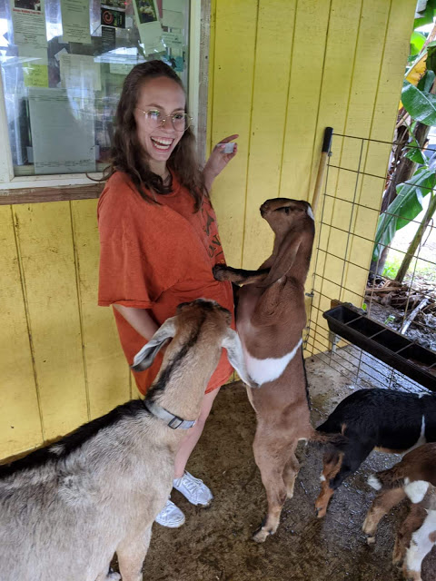 לא ברור לי איך זה קרה, אבל למשפחה שלנו יש חולשה לעיזים. אחד הדברים האהובים על איה זה האכלת עיזים, ונעם ידוע באהבתו לסלפי עם עז. מיקה לעומת זאת, לא תתקרב לעז אם ישלמו לה אבל בכל זאת החלטנו לבקר בחוות העיזים הקטנה אך חמודה מאד Honomu Goat Dairy. לצערנו איך שהגענו התחיל לרדת גשם, אז הביקור הצטמצם לסככה שמאחורי החנות, אבל עדיין היה כיף. אפשר לקנות אוכל לעיזים, ולקחת בהשאלה חולצה כדי לא להתלכלך. בחנות יש שלל מוצרי עז כמו גבינות, ממתקים מחלב עז וקוסמטיקה.