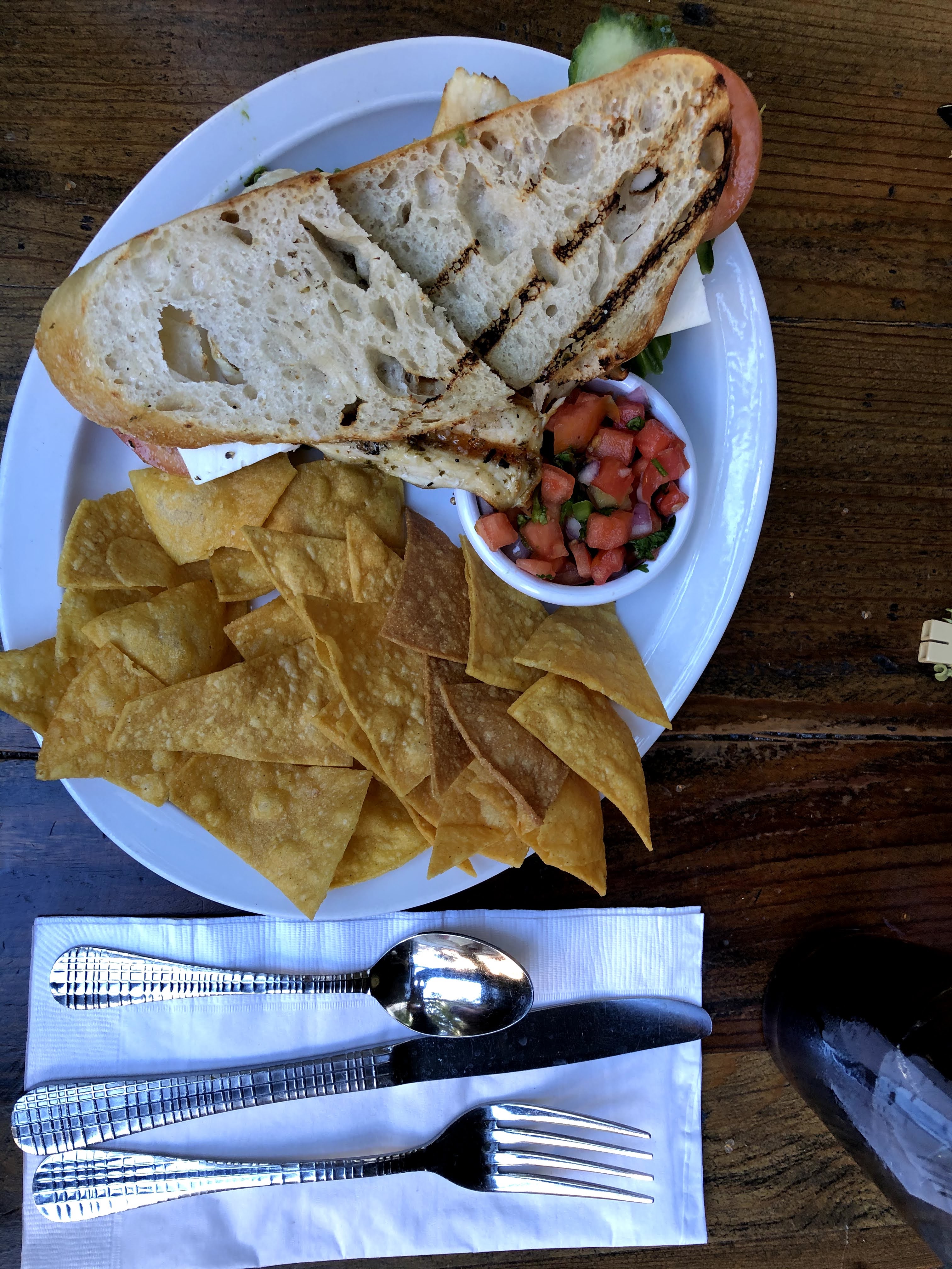 בחזור עצרנו במרפיז לארוחת צהרים מאוחרת במסעדה חמודה עם פטיו גדול Grounds. ישבנו בפטיו ונהנינו מתפריט הצהרים שכלל בעיקר סנדוויצ'ים, סלטים ומרק, מאד טעים, אסטטי ומודרני, לא אוכל של דיינר שמנוני. קיווינו גם להסתובב קצת ברחוב הראשי של מרפיז, אבל בעודנו ממתינים לאוכל הגיעה בעלת המקום לבקש מאיתנו לשלם כבר עכשיו, כי עוד מעט תהיה הפסקת חשמל. יובש בשילוב רוחות חזקות שצפויות בתחזית הם מתכון גרוע במיוחד לשריפות, אז חברת החשמל מבצעת הורדה יזומה באיזורים מועדים לפורענות. שילמנו ואכן תוך כדי הארוחה כבה החשמל בעיירה כולה והיא נסגרה, אז חזרנו הביתה.