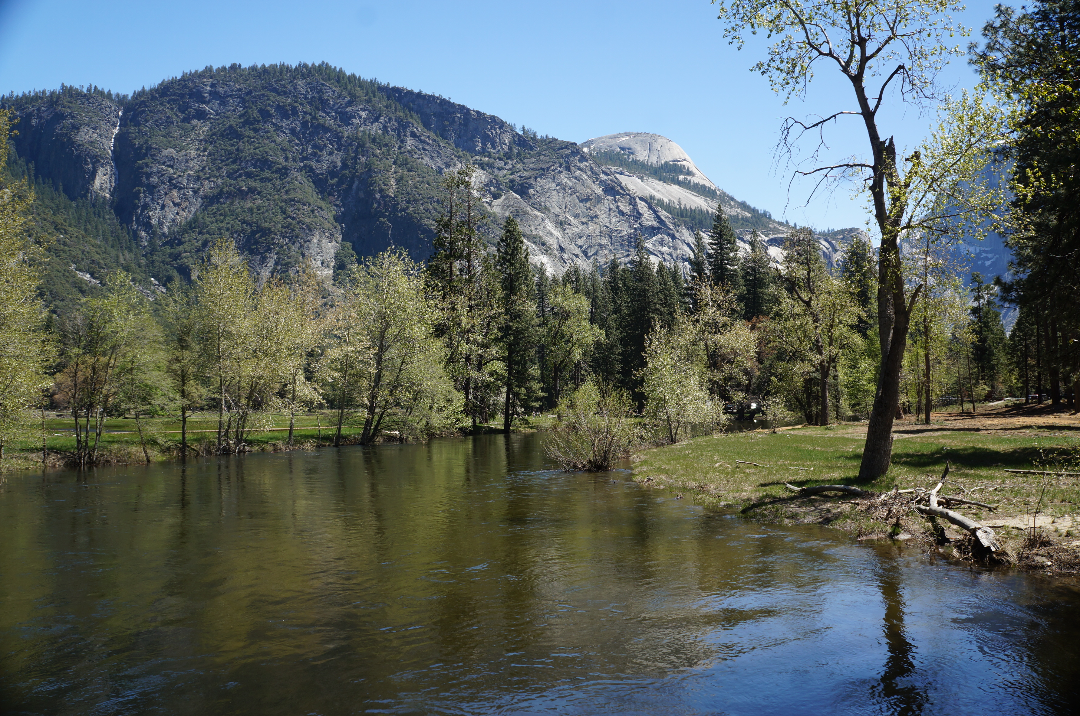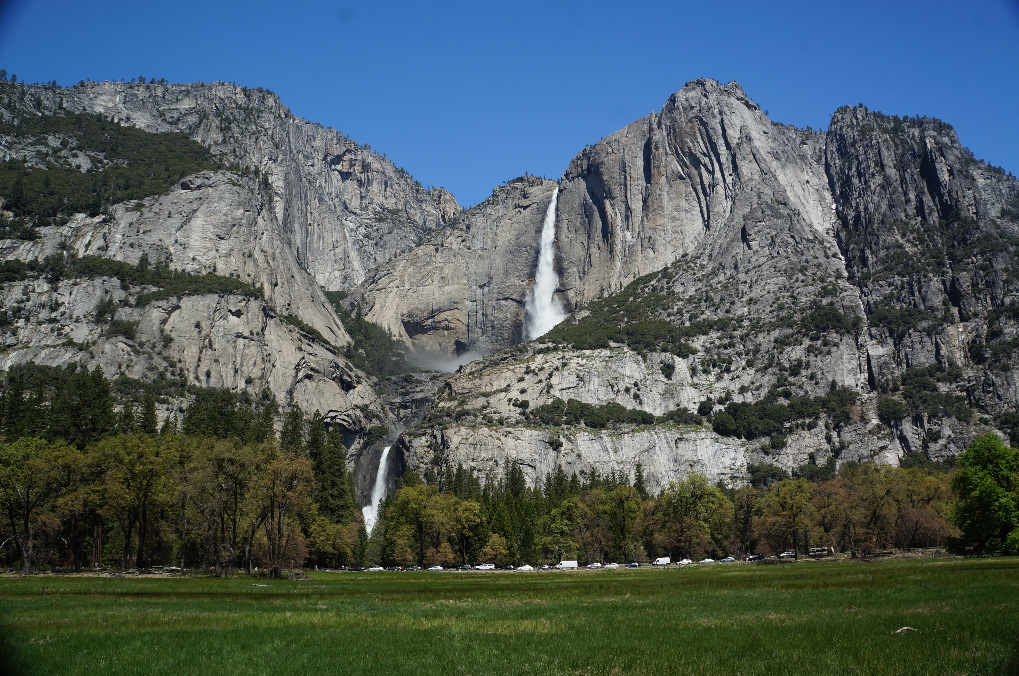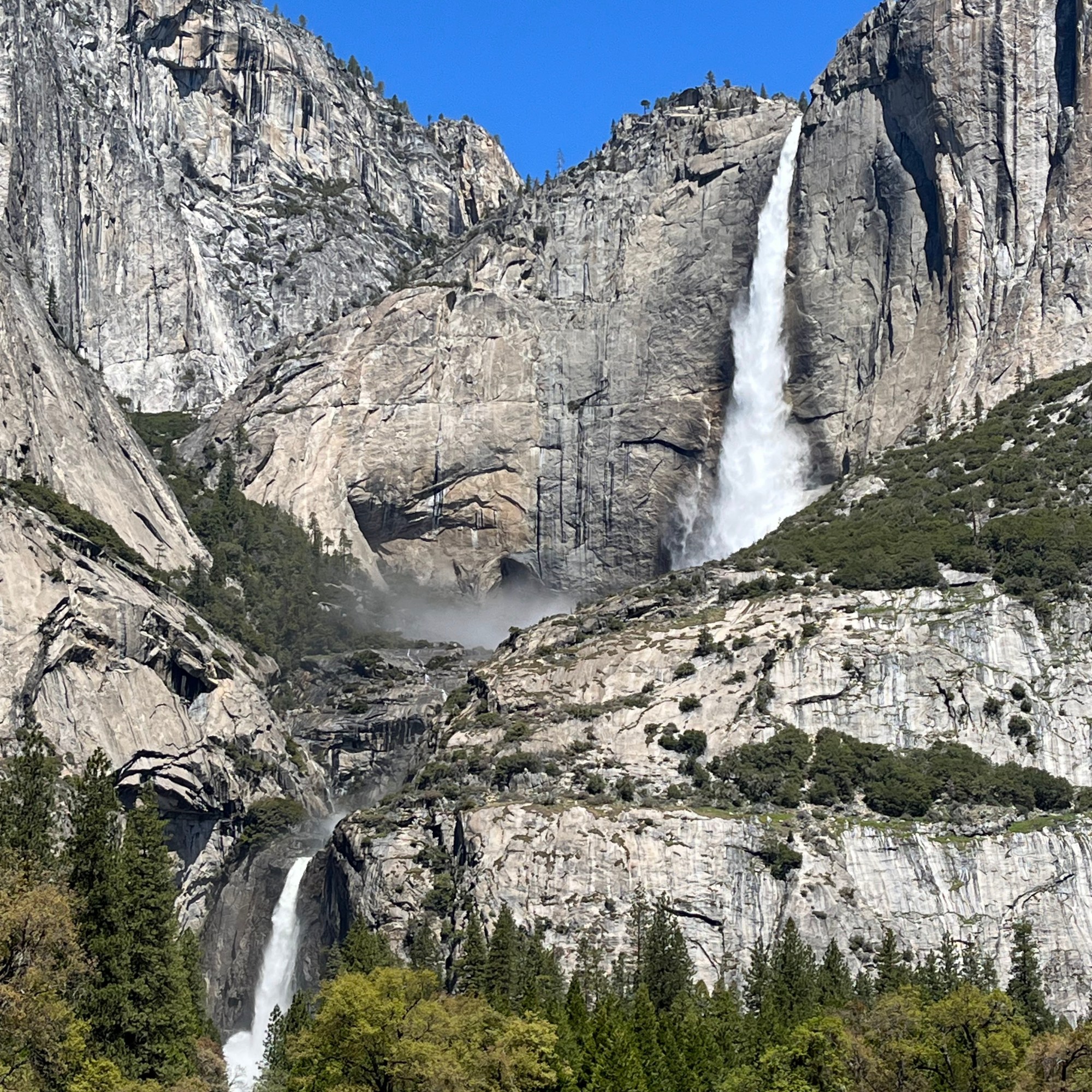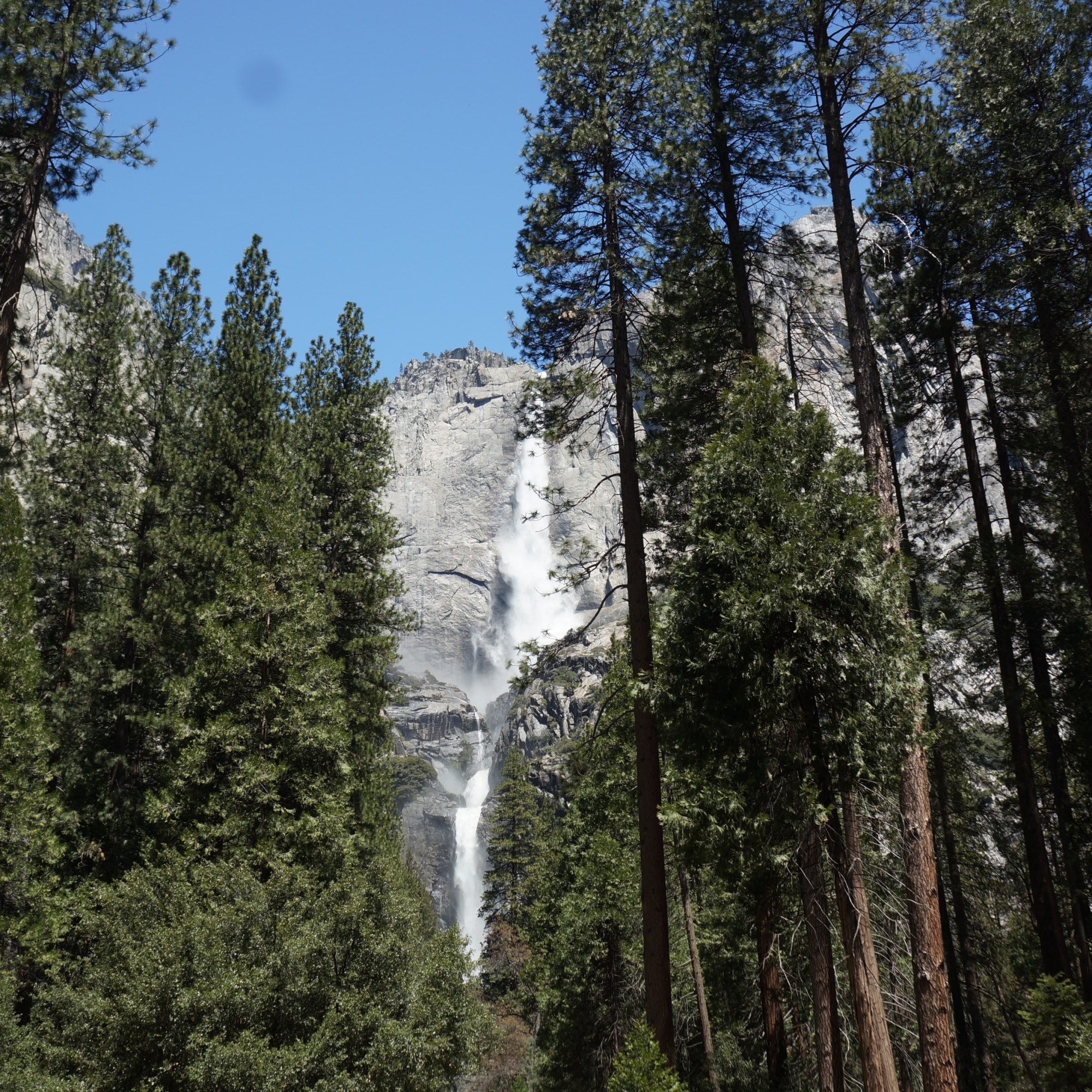 המשכנו בנסיעה לקארי וילג׳ Curry Village, אחד משני המרכזים המסחריים של הפארק. רצינו לחנות ולהמשיך עם השאטל אבל לא מצאנו חניה, אז המשכנו ליוסמיטי וילג' Yosemite Village שם מצאנו חניה (בנס) ולקחנו את השאטל הירוק לתחנה 6 – Lower Yosemite Falls. חצינו את הכביש ועשינו מסלול קליל באחו Cook's Meadow Loop Trail כולל (הולכים שמאלה במזלג ואז על הגשר, וחזרה). חצינו בחזרה את הכביש ועשינו את המסלול למפל התחתון Lower Yosemite Falls. המסלול קל ולא ארוך ואפשר לעשות אותו בלופ. המפלים מרהיבים ממש, הזרימה כל כך חזקה שהיא יוצרת רוח קרה, והרסס שמתעופף לכל עבר די קפוא אז מומלץ להביא משהו ללבוש! צד אחד של המסלול נגיש לעגלות. המסלול למפל העליון נחשב מסלול קשה במיוחד, עם עליה תלולה לאורך המצוק, במילים אחרות, לא בשבילנו!