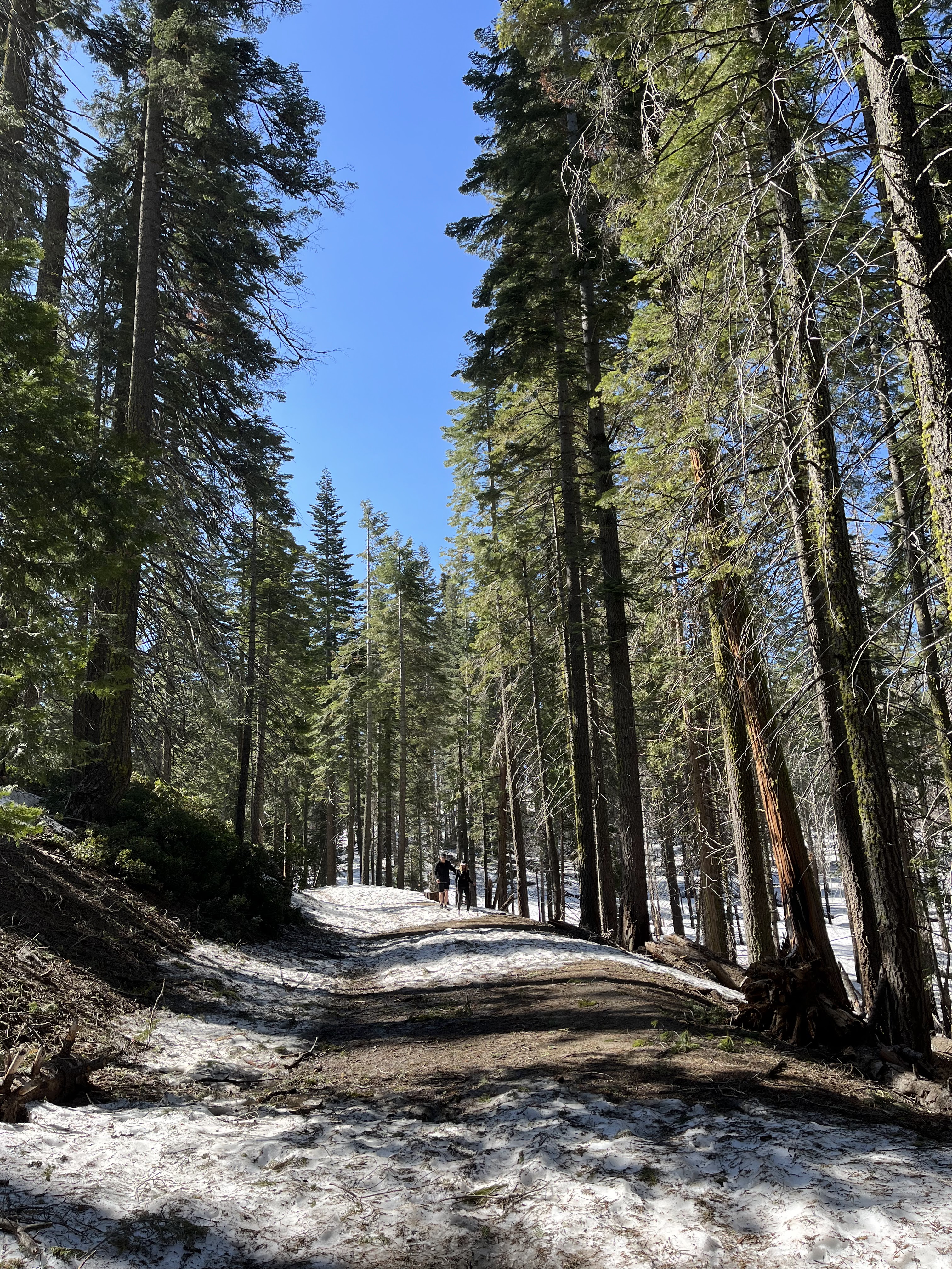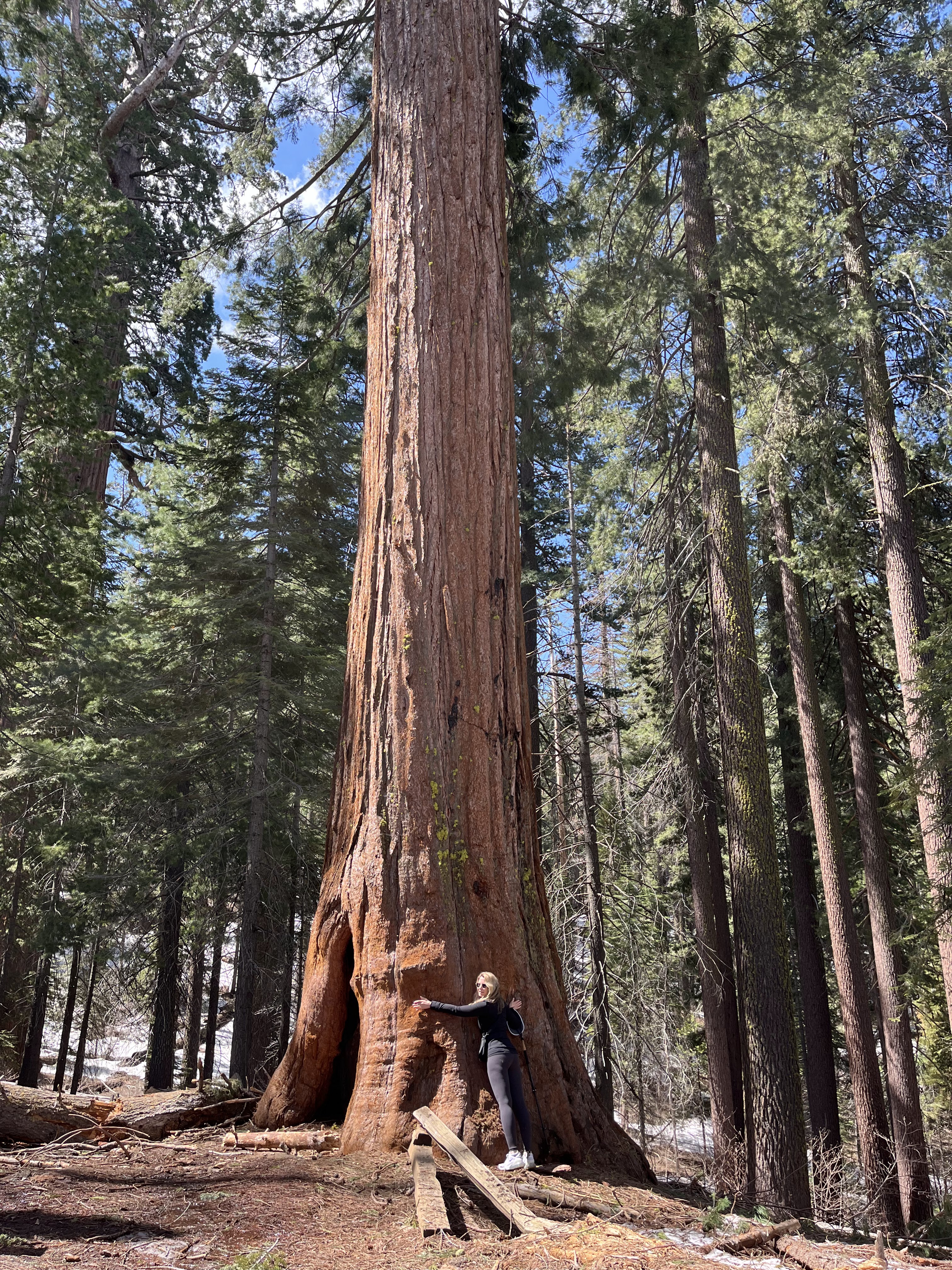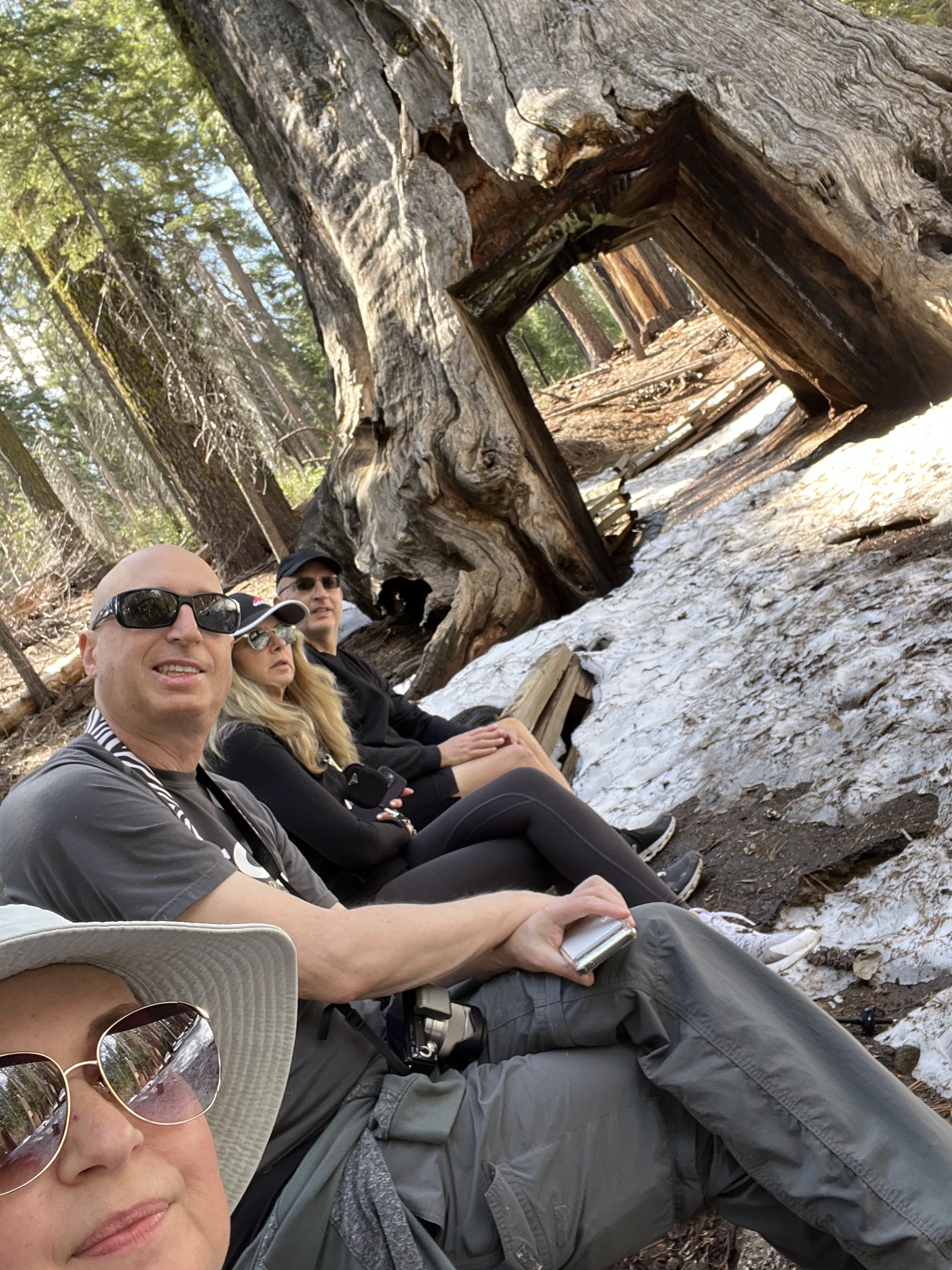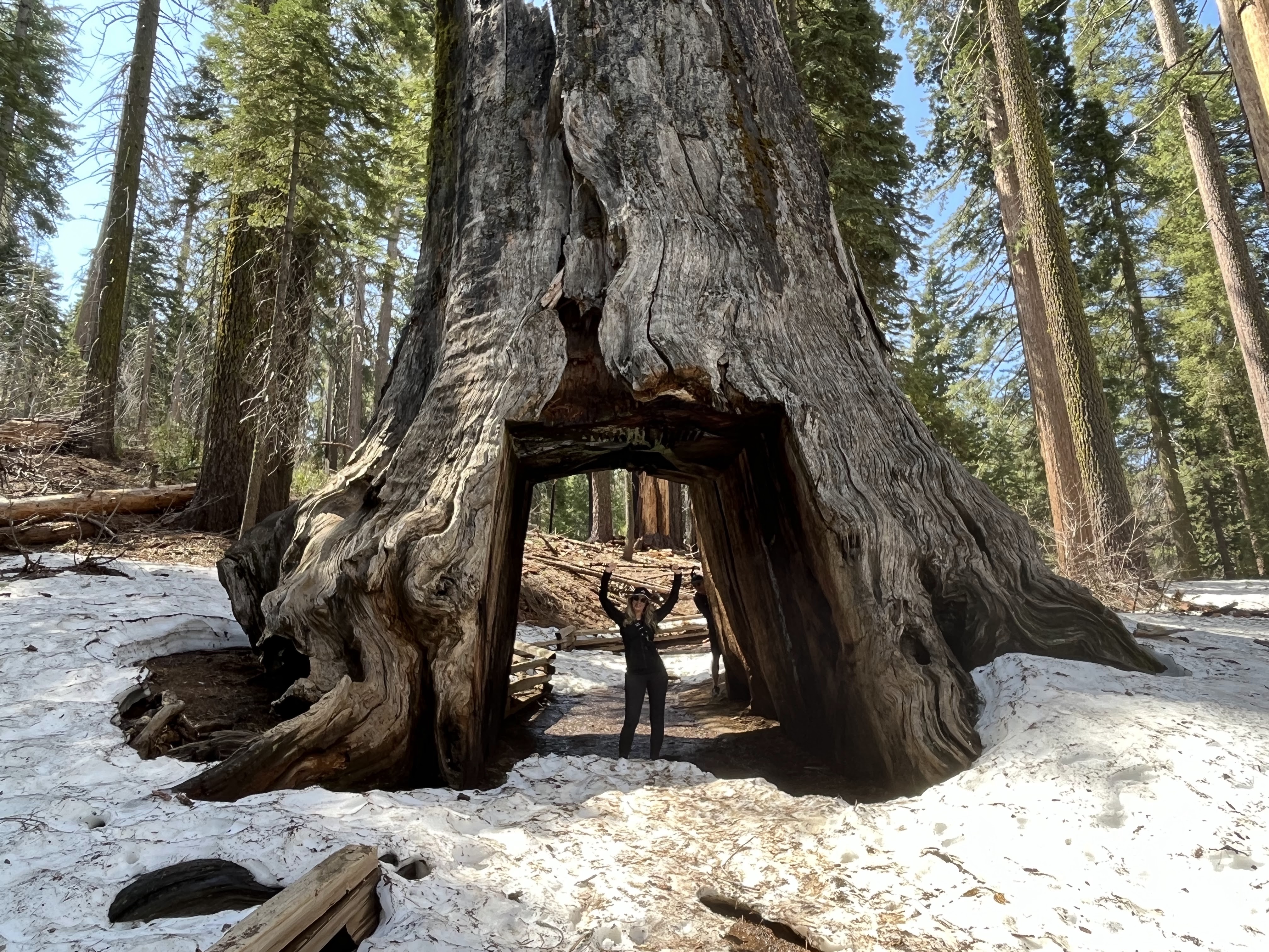 המטרה שלנו, טיול רגלי בחורשת הסקויה Tuolumne Grove. ביוסמיטי יש שלוש חורשות עצי סקויה (העצים הגדולים בעולם). היפה והמפורסמת בניהן היא חורשת מריפוסה Mariposa Grove אבל השאטל מהחניה לחורשה כרגע לא עובד וההליכה שם ארוכה (מעל 3 ק"מ לכל כיוון, בעליה, רק כדי להגיע לתחילת המסלול). מבחינת הליכה, זה היה המסלול היפה ביותר שעשינו. חלק מהדרך מכוסה בשלג, בוץ ועצים שנפלו או נכרתו אבל לאט ובזהירות הגענו לעצי הסקויה. הדרך הלוך כולה בירידה והחזור בעליה אבל מתונה יחסית. בתחתית המסלול פגשנו את עצי הסקויה שתמיד מרגשים, והצטלמו בשער שנחצב בעץ ענקי. יופי של מסלול. בגלל השלג והבוץ מומלץ ללכת עם נעליים אטומות למים ולהעזר במקלות הליכה אם אתם מרגישים צורך.