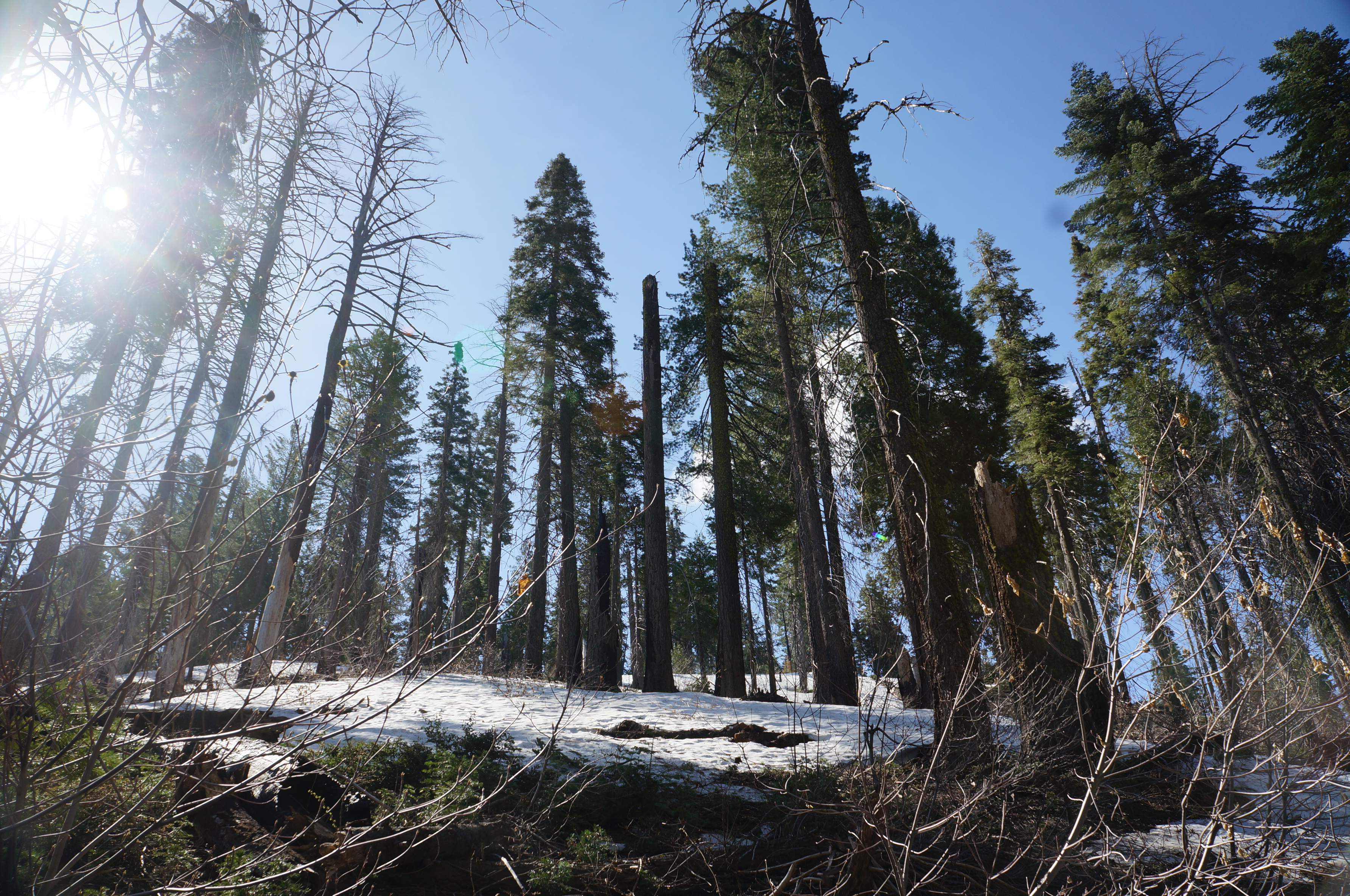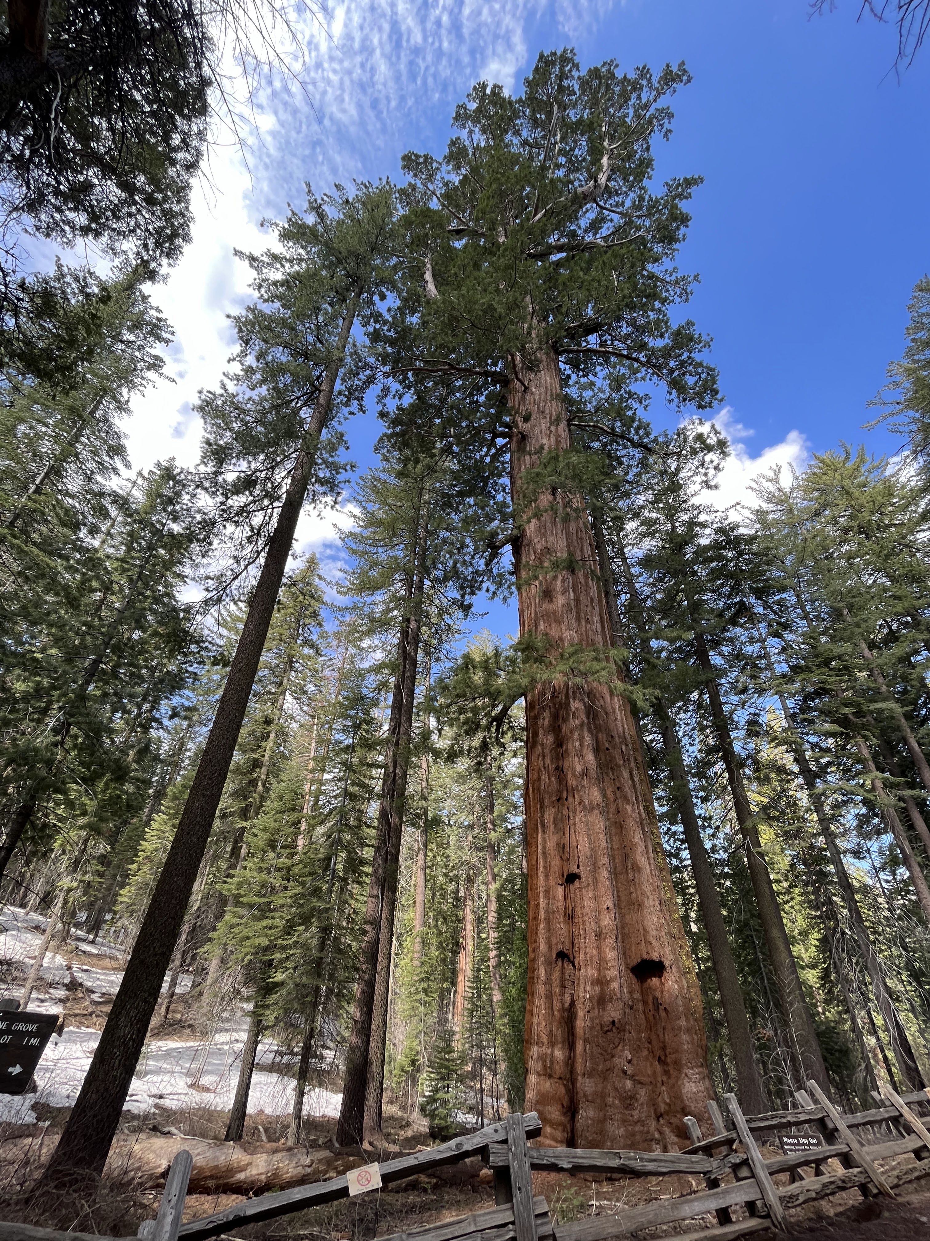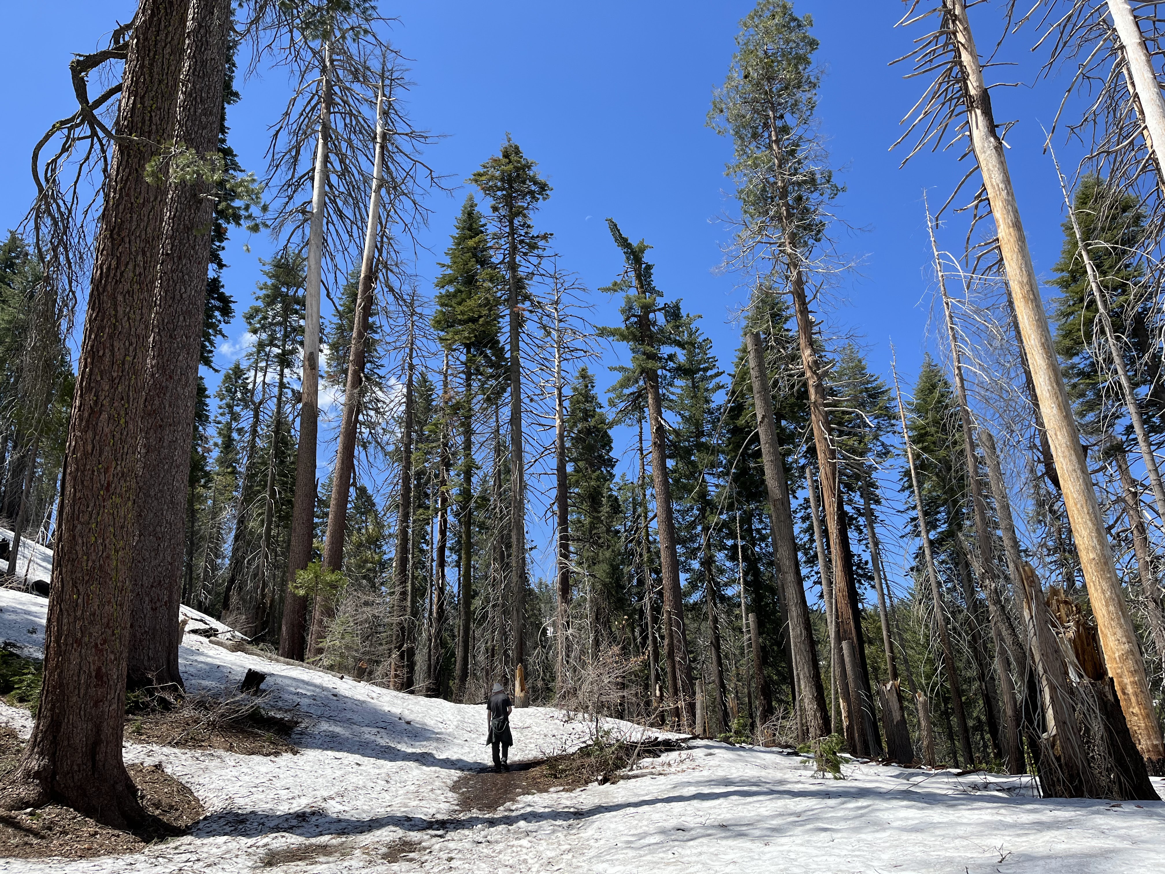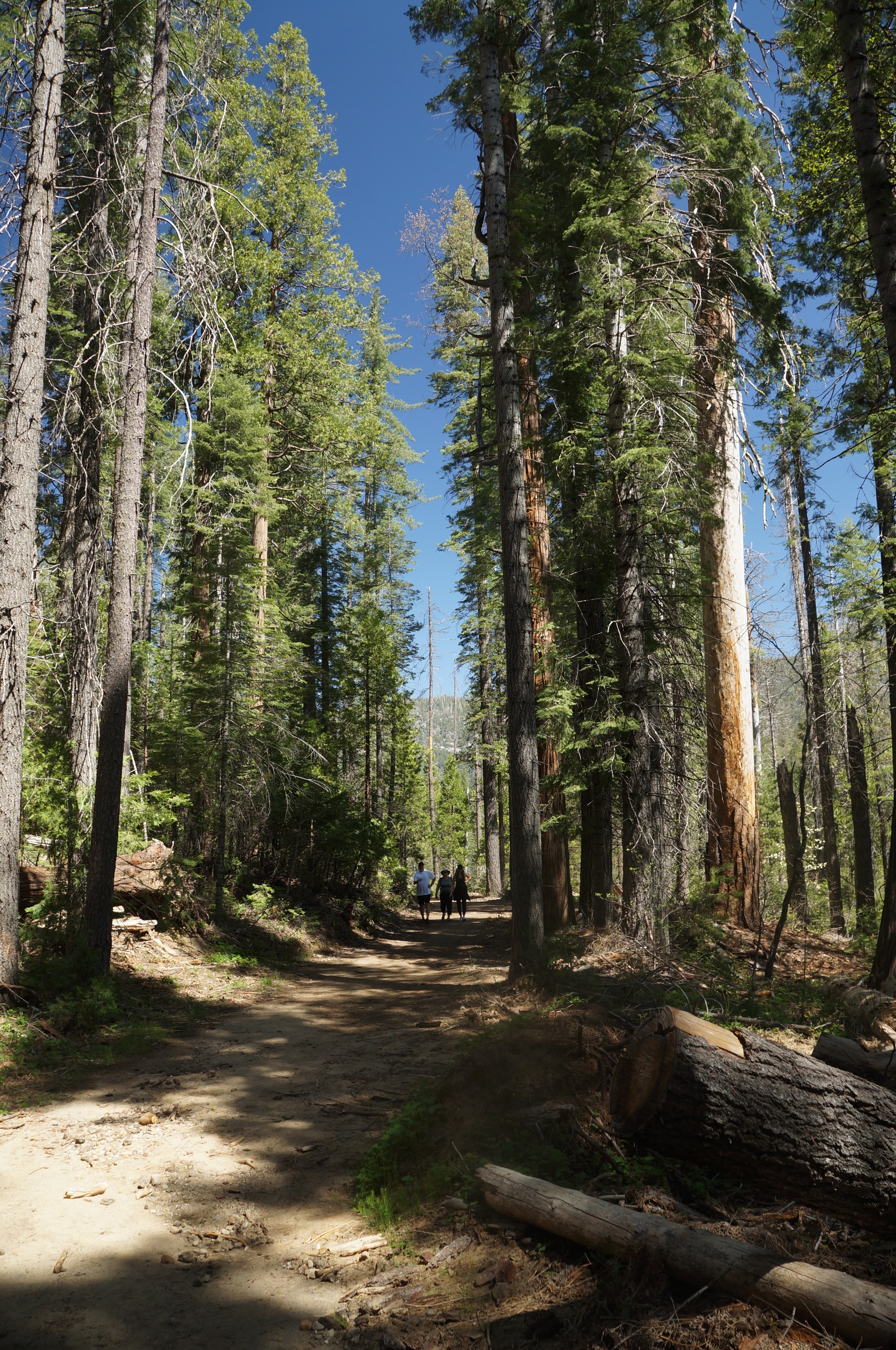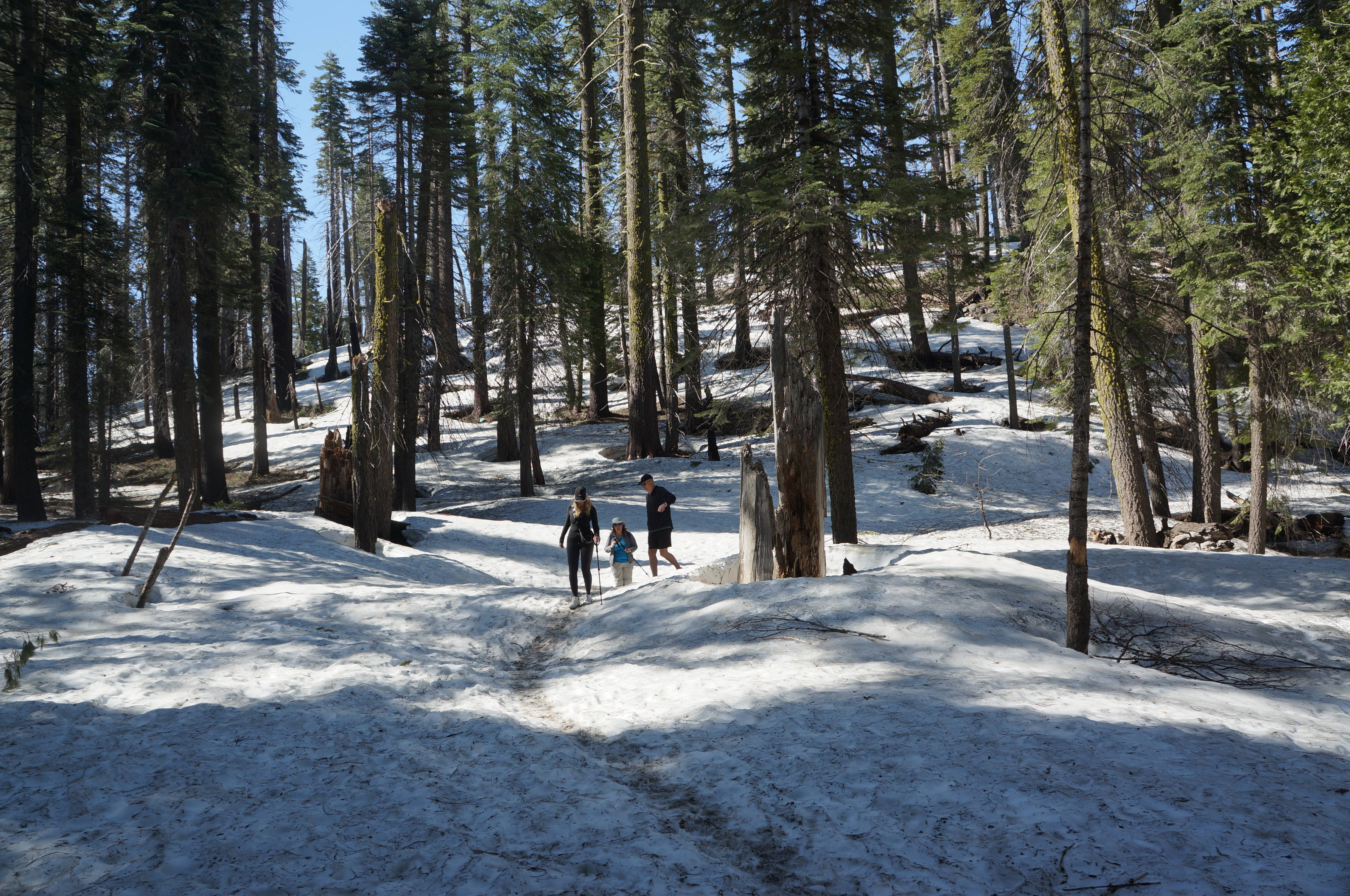 המטרה שלנו, טיול רגלי בחורשת הסקויה Tuolumne Grove. ביוסמיטי יש שלוש חורשות עצי סקויה (העצים הגדולים בעולם). היפה והמפורסמת בניהן היא חורשת מריפוסה Mariposa Grove אבל השאטל מהחניה לחורשה כרגע לא עובד וההליכה שם ארוכה (מעל 3 ק"מ לכל כיוון, בעליה, רק כדי להגיע לתחילת המסלול). מבחינת הליכה, זה היה המסלול היפה ביותר שעשינו. חלק מהדרך מכוסה בשלג, בוץ ועצים שנפלו או נכרתו אבל לאט ובזהירות הגענו לעצי הסקויה. הדרך הלוך כולה בירידה והחזור בעליה אבל מתונה יחסית. בתחתית המסלול פגשנו את עצי הסקויה שתמיד מרגשים, והצטלמו בשער שנחצב בעץ ענקי. יופי של מסלול. בגלל השלג והבוץ מומלץ ללכת עם נעליים אטומות למים ולהעזר במקלות הליכה אם אתם מרגישים צורך.