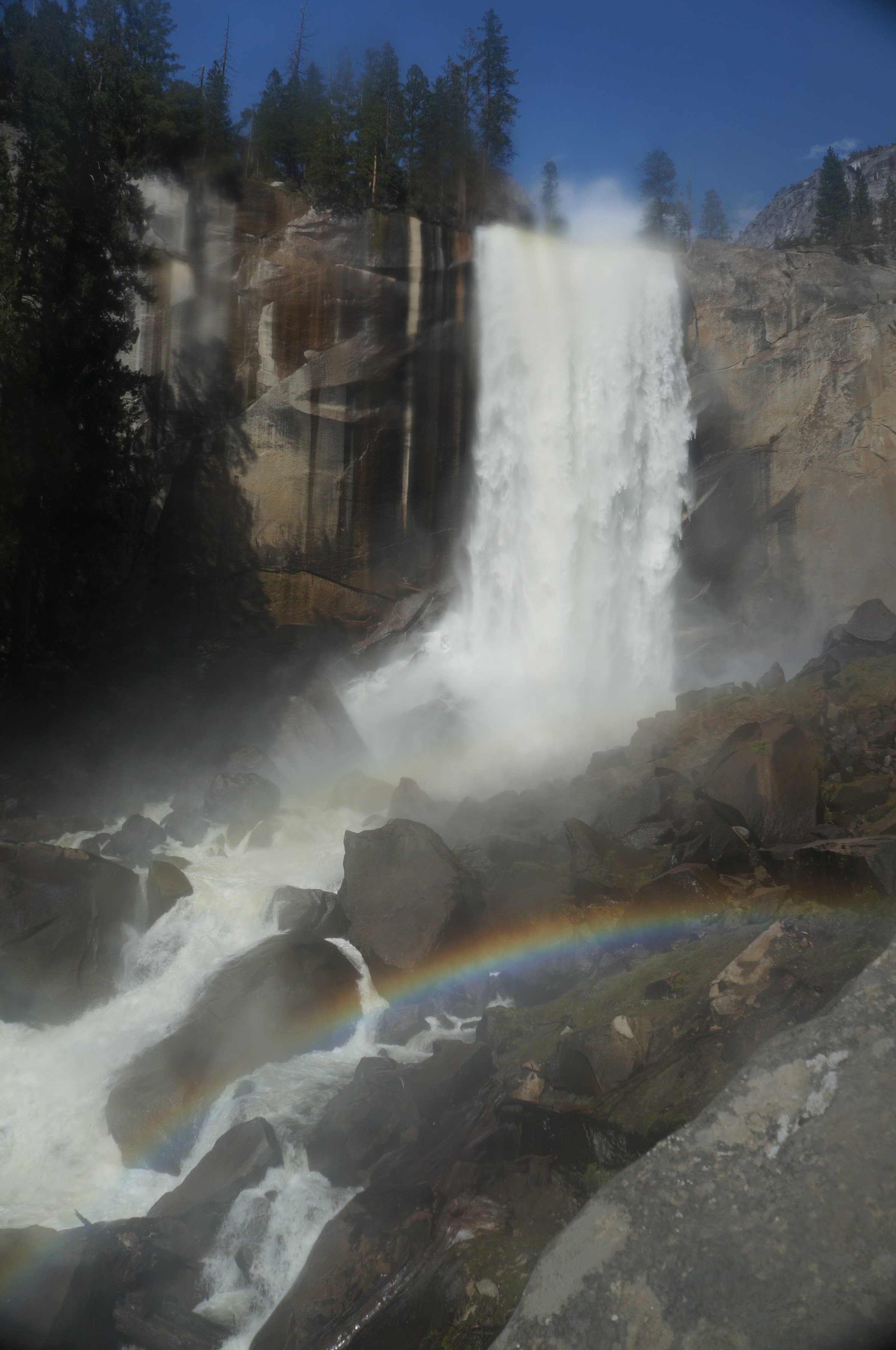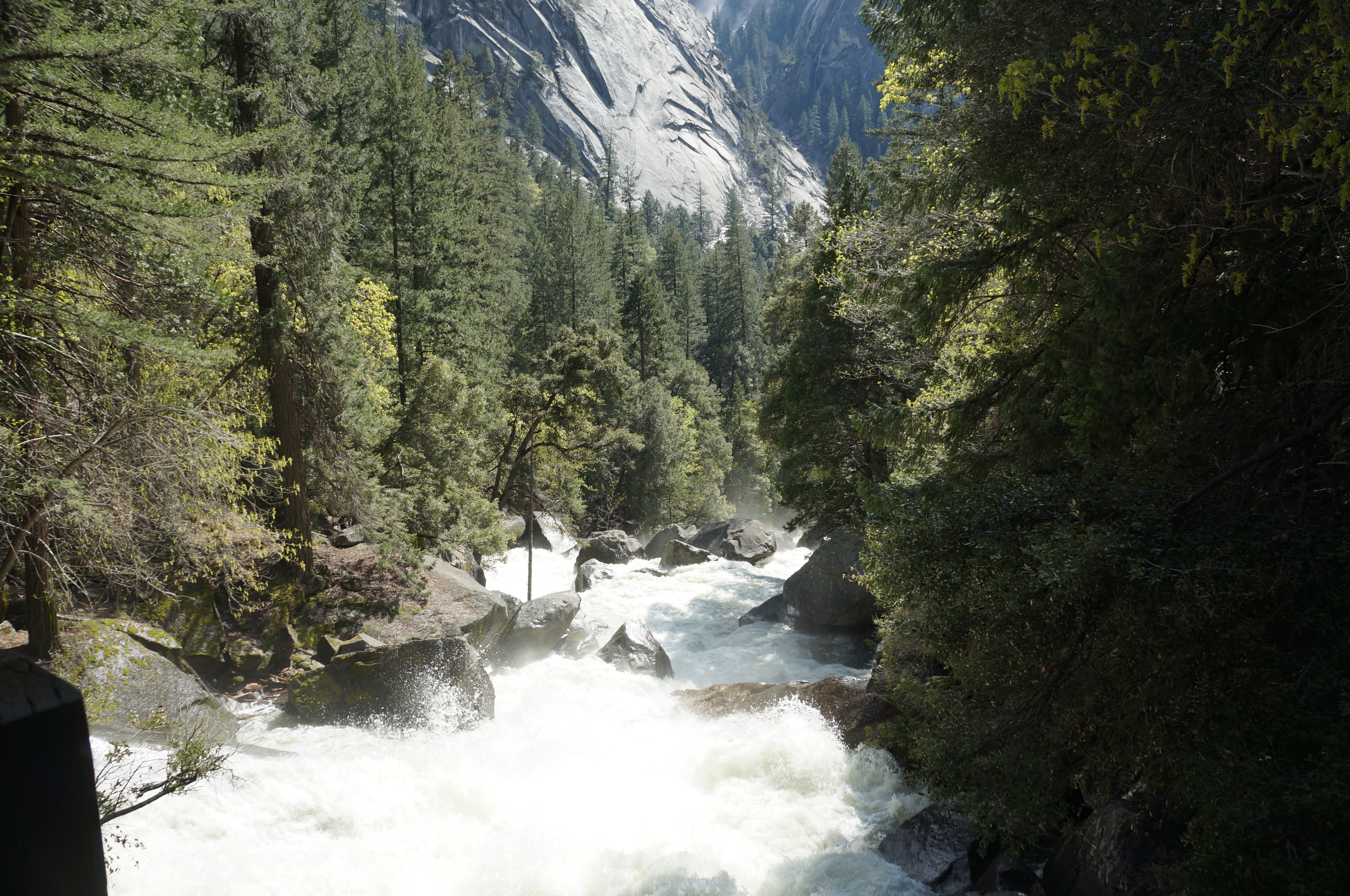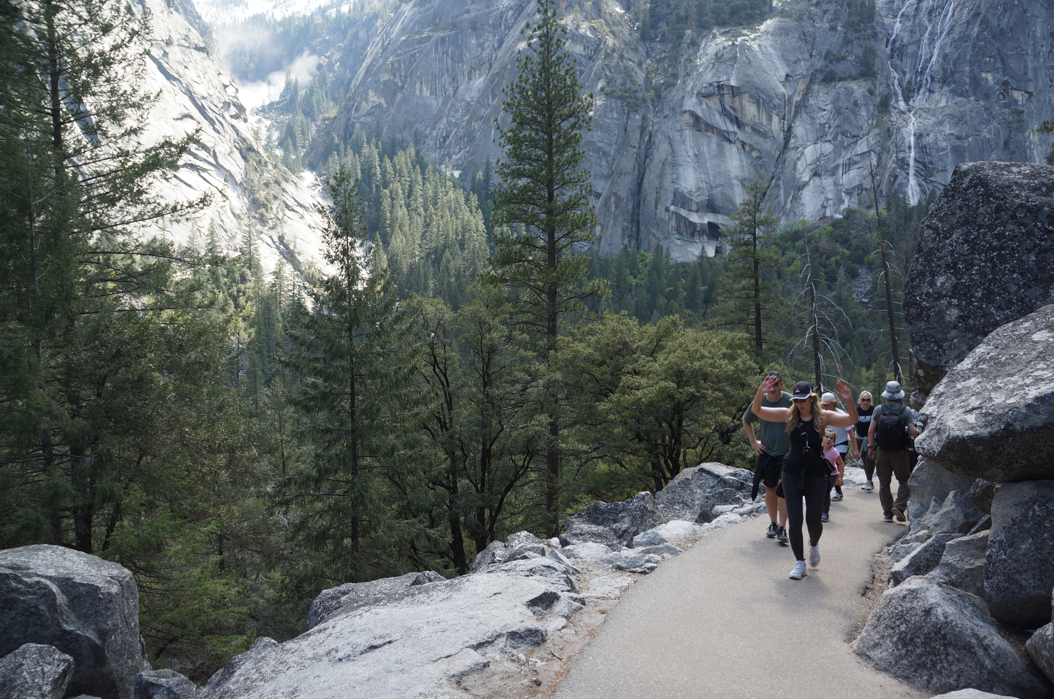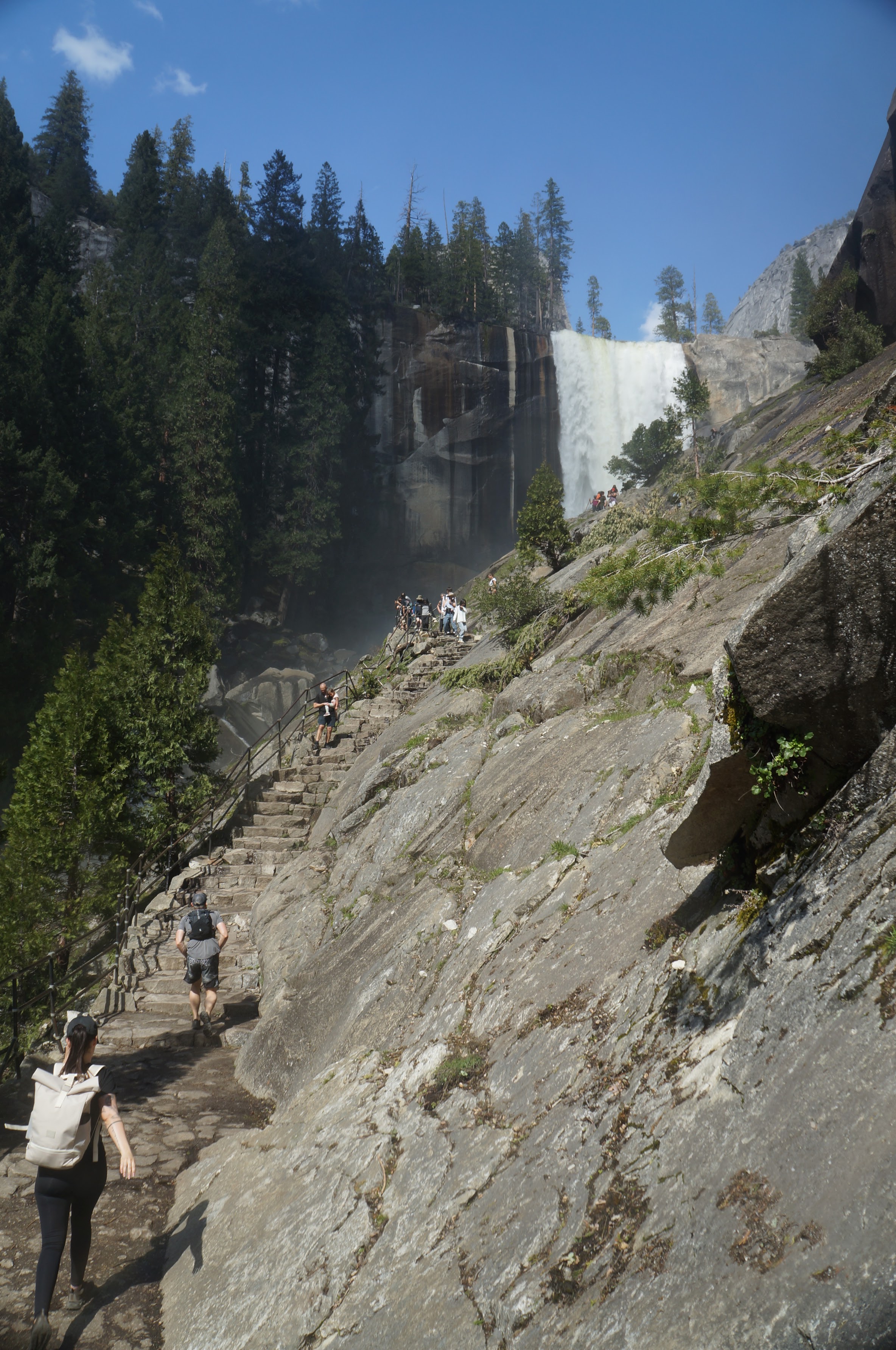 משם הלכנו ברגל (אפשר לקחת שאטל לתחנה 16) אל המסלול הבא שלנו –Mist Trail / Vernal Falls – המסלול הכי קשה שעשינו. למסלול יש מספר חלקים. הראשון, טיפוס בשביל סלול, ארוך, תלול ומייגע עם טיפוס של 180 מטר לאורך קילומטר וחצי. המסלול הזה מביא את המטיילים לגשר שמול המפל ונקרא באולטריילס Vernal Fall Foot Bridge via John Muir Trail. החלק המעניין אבל מפחיד של המסלול רק מתחיל בנקודה הזו. משם יש עוד שוב עליה, אבל הפעם על מדרגות אבן רטובות מרסס המפל, צמודות לפני הצוק, עם מעקה (שלא תמיד שם). בחלק הזה גם נרטבים מרסס המפל. אני (שלא בכושר) ממש סבלתי כל הדרך עד הגשר ומשם עשיתי אחורה פנה בלי לטפס במדרגות הרטובות. נעם ואחיו כן המשיכו והתמונות משם נפלאות, עם המון מים וקשתות צבעוניות. אבל שניהם הודו שמדובר במסלול שהיה מפחיד למדי גם עבורם. בקיצור, לדעתנו המשפחתית – הטיפוס עד הגשר שווה את המאמץ רק אם מתכוונים להמשיך במדרגות במעלה המפל. אחרת יש מפלים אחרים עם גישה קלה ונוחה שלא פחות יפים. העליה צמוד למפל מתאימה למטיילים עם כושר טוב, ולא פחדנים.