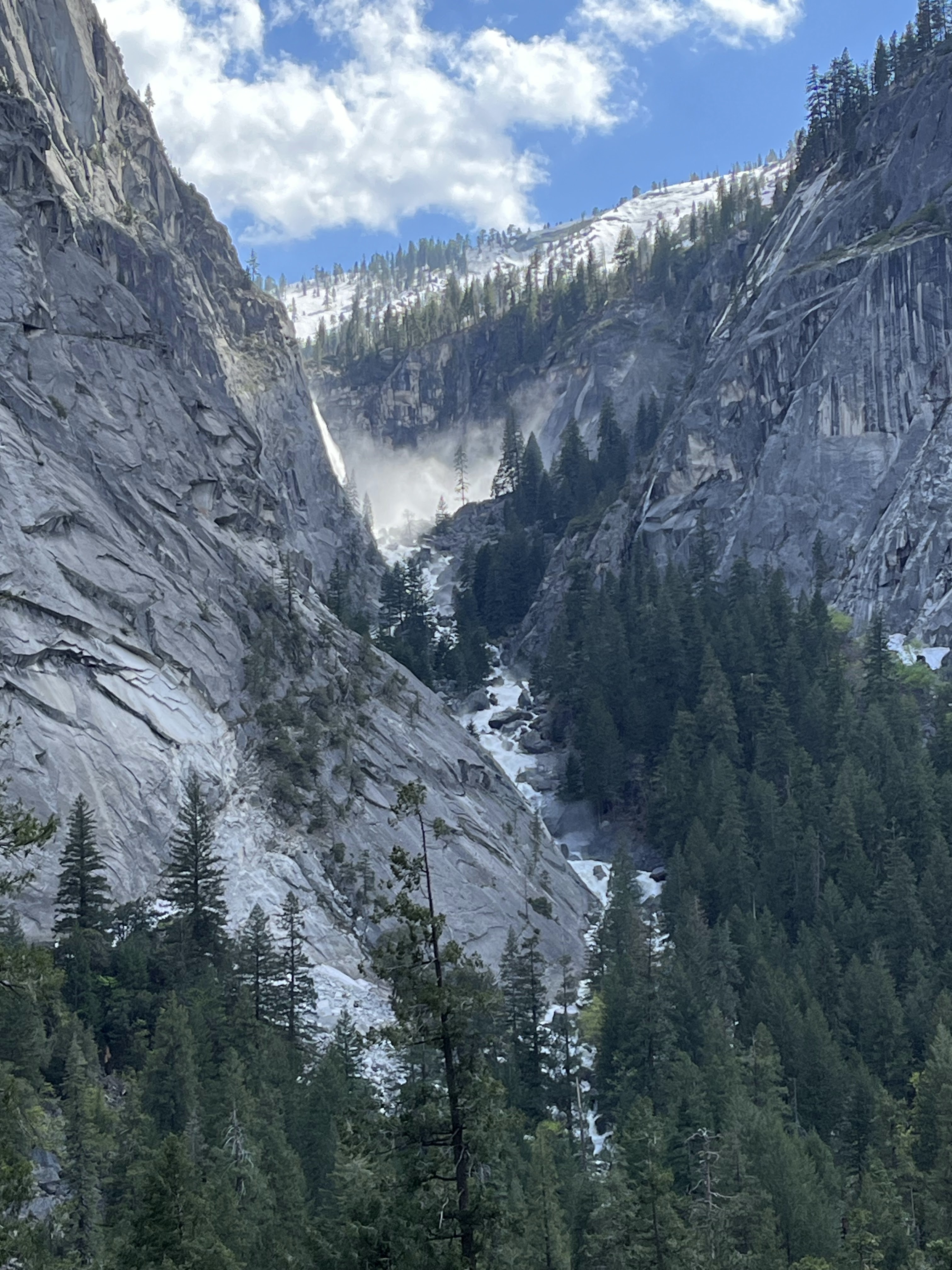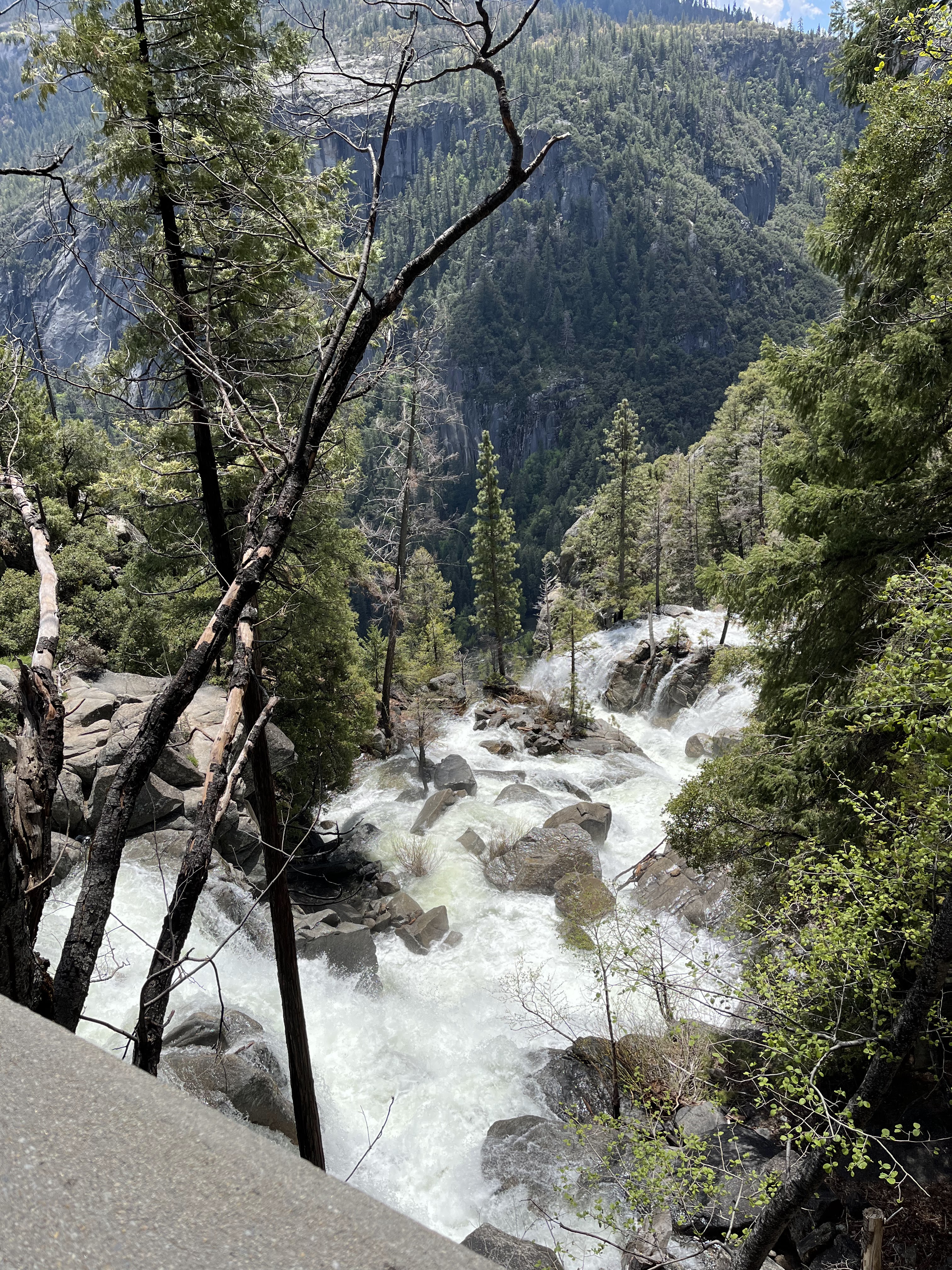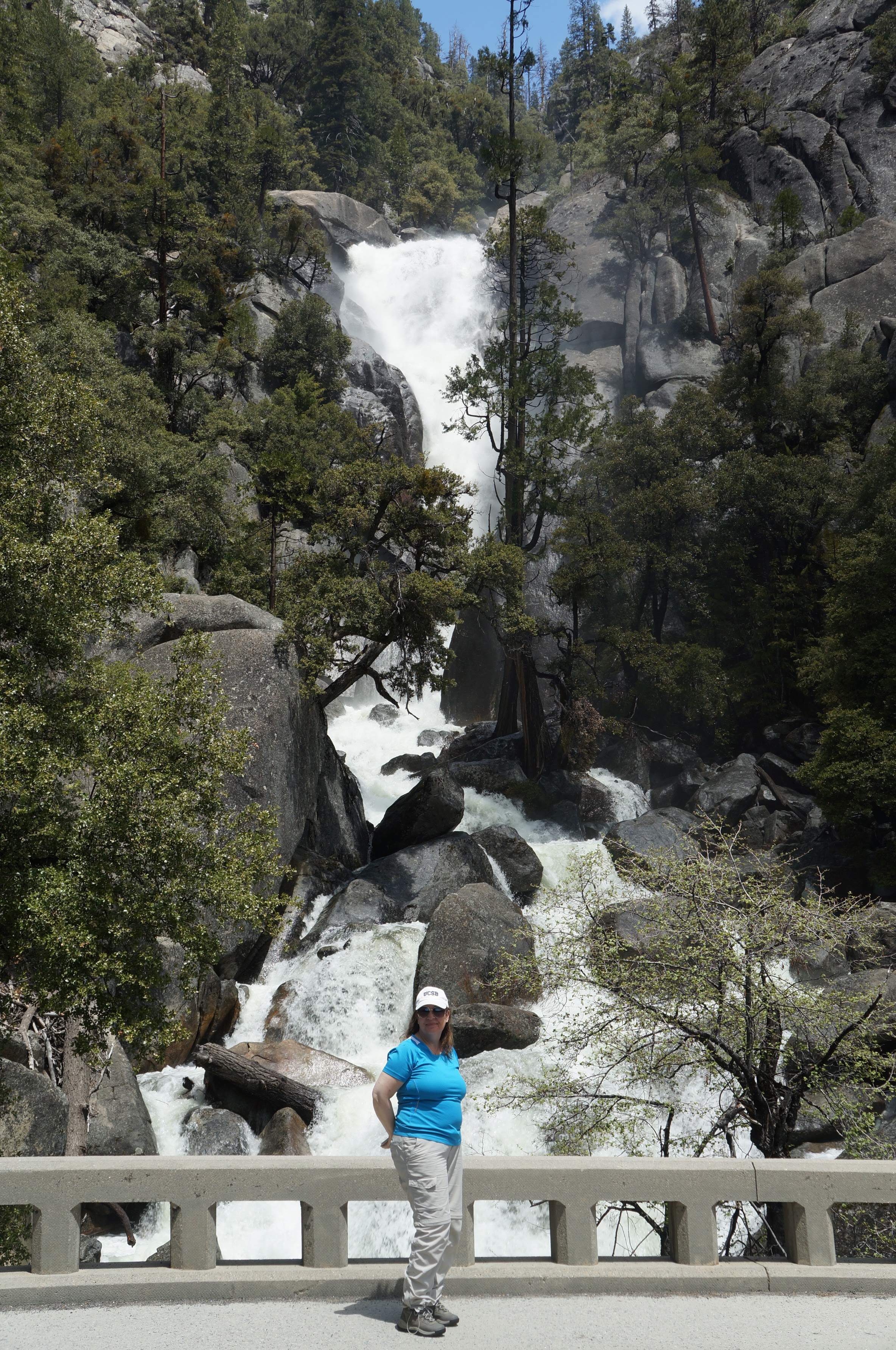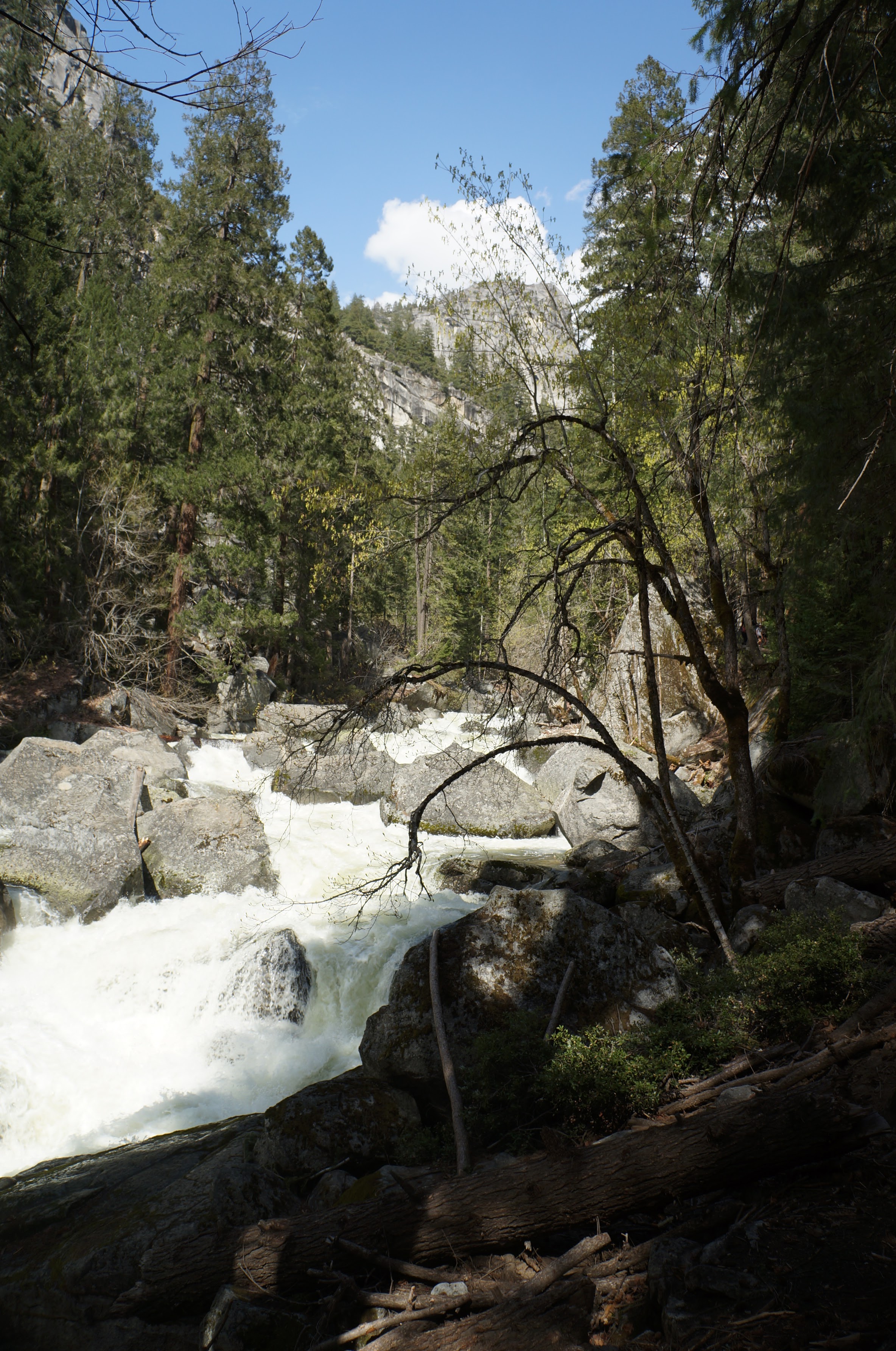 משם הלכנו ברגל (אפשר לקחת שאטל לתחנה 16) אל המסלול הבא שלנו –Mist Trail / Vernal Falls – המסלול הכי קשה שעשינו. למסלול יש מספר חלקים. הראשון, טיפוס בשביל סלול, ארוך, תלול ומייגע עם טיפוס של 180 מטר לאורך קילומטר וחצי. המסלול הזה מביא את המטיילים לגשר שמול המפל ונקרא באולטריילס Vernal Fall Foot Bridge via John Muir Trail. החלק המעניין אבל מפחיד של המסלול רק מתחיל בנקודה הזו. משם יש עוד שוב עליה, אבל הפעם על מדרגות אבן רטובות מרסס המפל, צמודות לפני הצוק, עם מעקה (שלא תמיד שם). בחלק הזה גם נרטבים מרסס המפל. אני (שלא בכושר) ממש סבלתי כל הדרך עד הגשר ומשם עשיתי אחורה פנה בלי לטפס במדרגות הרטובות. נעם ואחיו כן המשיכו והתמונות משם נפלאות, עם המון מים וקשתות צבעוניות. אבל שניהם הודו שמדובר במסלול שהיה מפחיד למדי גם עבורם. בקיצור, לדעתנו המשפחתית – הטיפוס עד הגשר שווה את המאמץ רק אם מתכוונים להמשיך במדרגות במעלה המפל. אחרת יש מפלים אחרים עם גישה קלה ונוחה שלא פחות יפים. העליה צמוד למפל מתאימה למטיילים עם כושר טוב, ולא פחדנים.