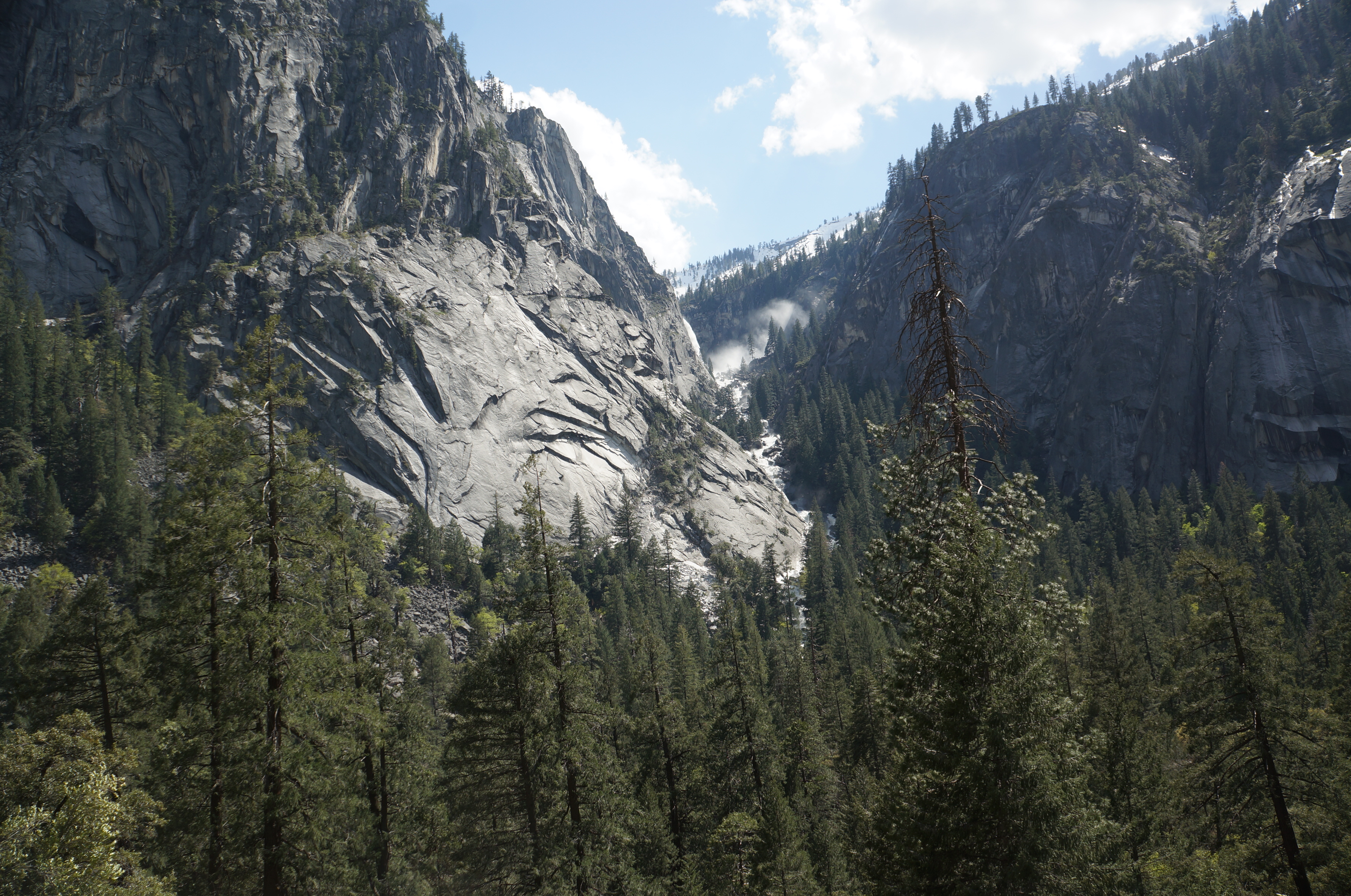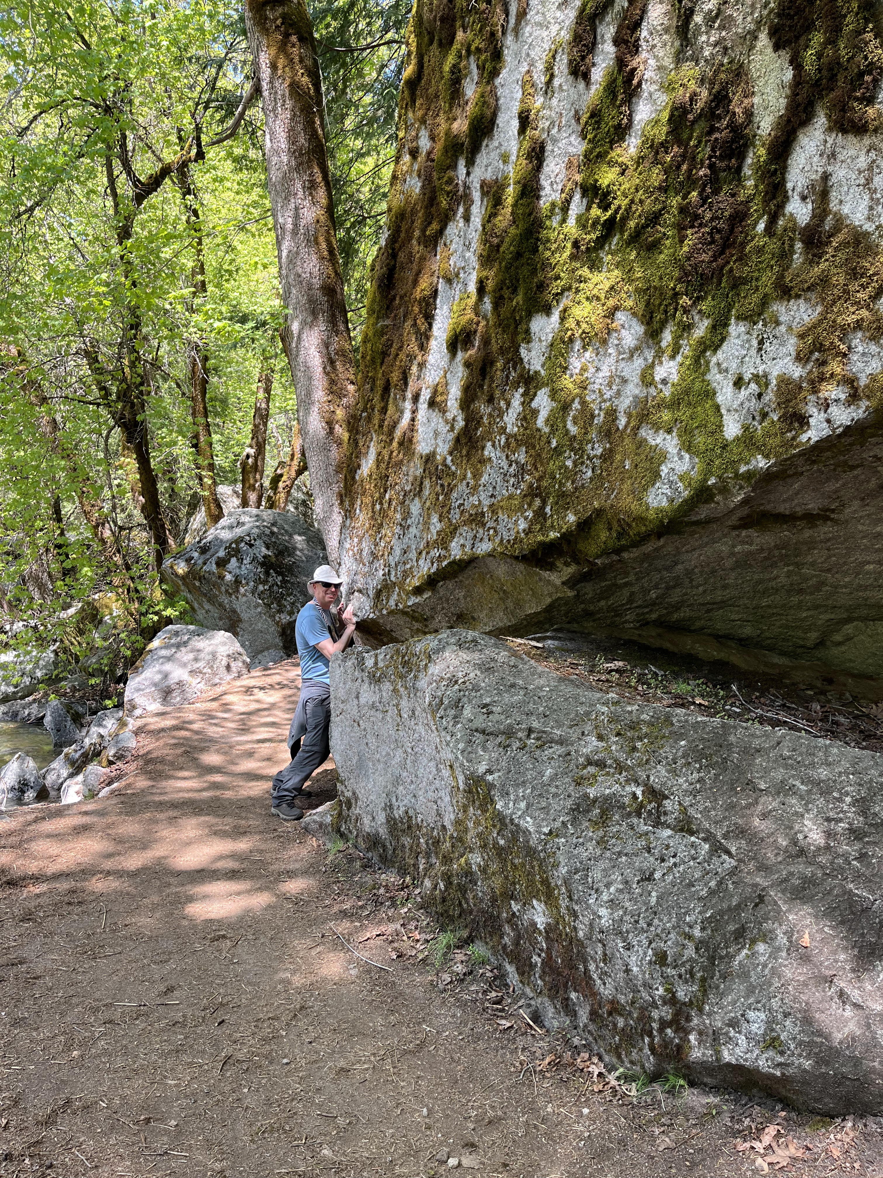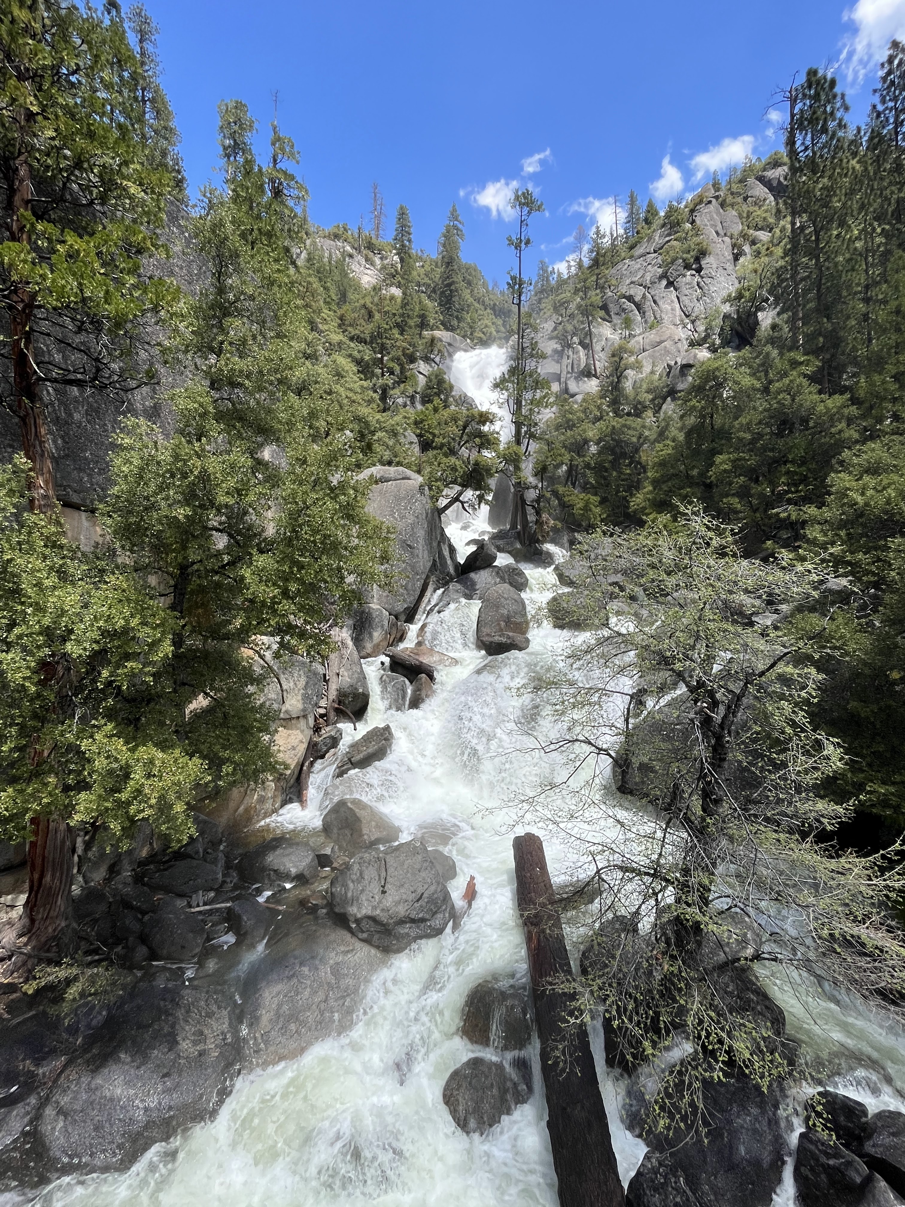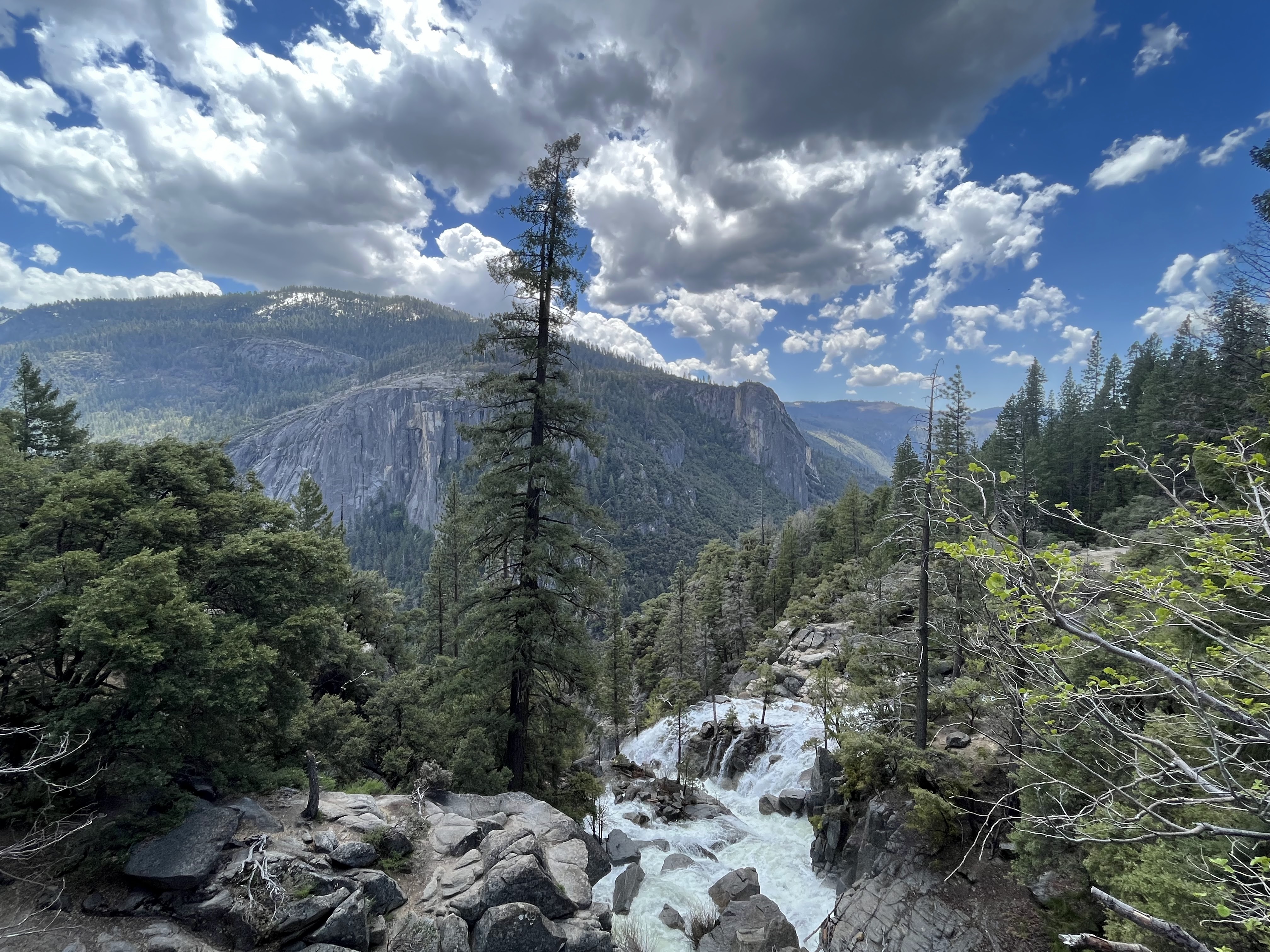משם הלכנו ברגל (אפשר לקחת שאטל לתחנה 16) אל המסלול הבא שלנו –Mist Trail / Vernal Falls – המסלול הכי קשה שעשינו. למסלול יש מספר חלקים. הראשון, טיפוס בשביל סלול, ארוך, תלול ומייגע עם טיפוס של 180 מטר לאורך קילומטר וחצי. המסלול הזה מביא את המטיילים לגשר שמול המפל ונקרא באולטריילס Vernal Fall Foot Bridge via John Muir Trail. החלק המעניין אבל מפחיד של המסלול רק מתחיל בנקודה הזו. משם יש עוד שוב עליה, אבל הפעם על מדרגות אבן רטובות מרסס המפל, צמודות לפני הצוק, עם מעקה (שלא תמיד שם). בחלק הזה גם נרטבים מרסס המפל. אני (שלא בכושר) ממש סבלתי כל הדרך עד הגשר ומשם עשיתי אחורה פנה בלי לטפס במדרגות הרטובות. נעם ואחיו כן המשיכו והתמונות משם נפלאות, עם המון מים וקשתות צבעוניות. אבל שניהם הודו שמדובר במסלול שהיה מפחיד למדי גם עבורם. בקיצור, לדעתנו המשפחתית – הטיפוס עד הגשר שווה את המאמץ רק אם מתכוונים להמשיך במדרגות במעלה המפל. אחרת יש מפלים אחרים עם גישה קלה ונוחה שלא פחות יפים. העליה צמוד למפל מתאימה למטיילים עם כושר טוב, ולא פחדנים.