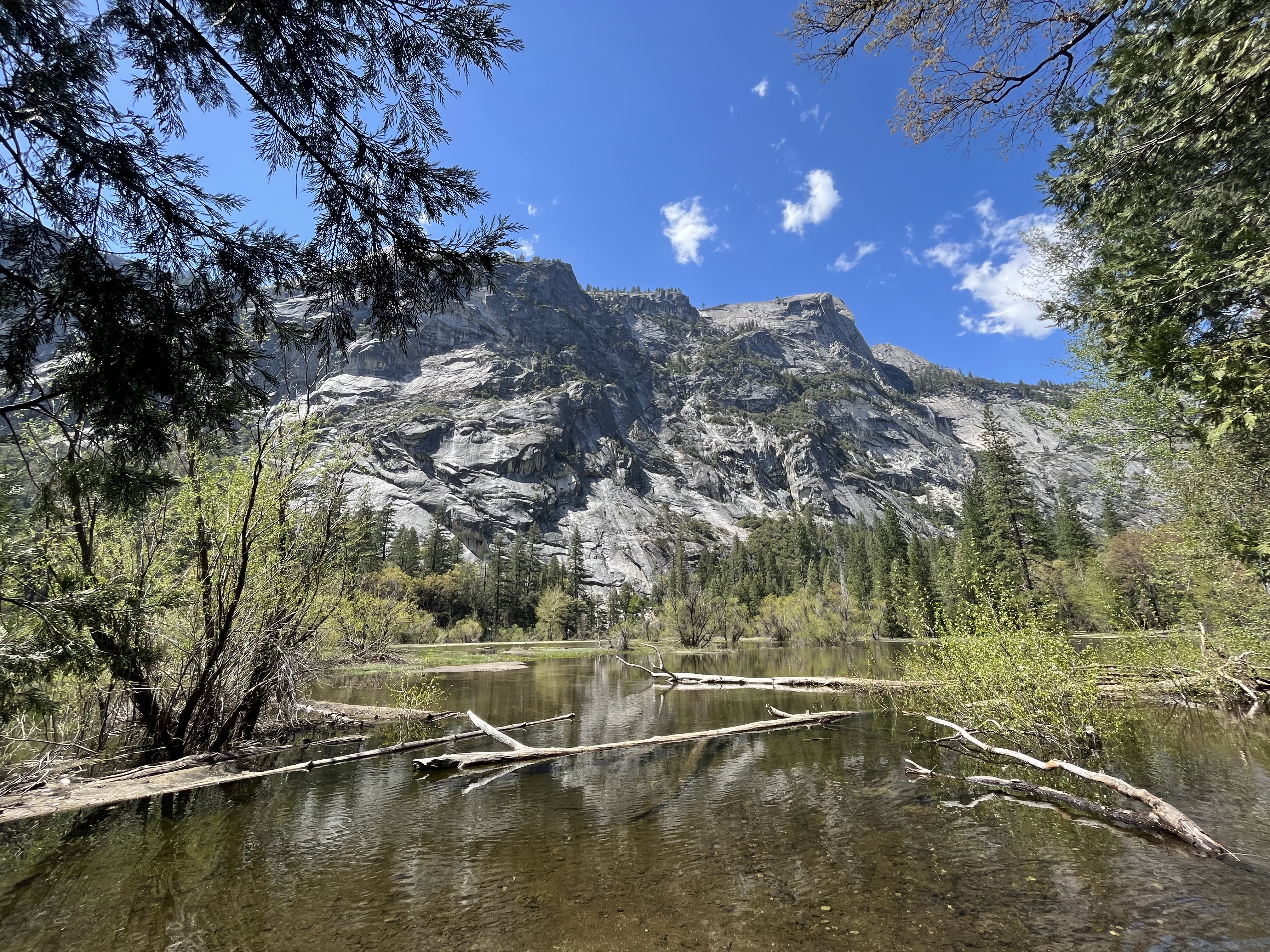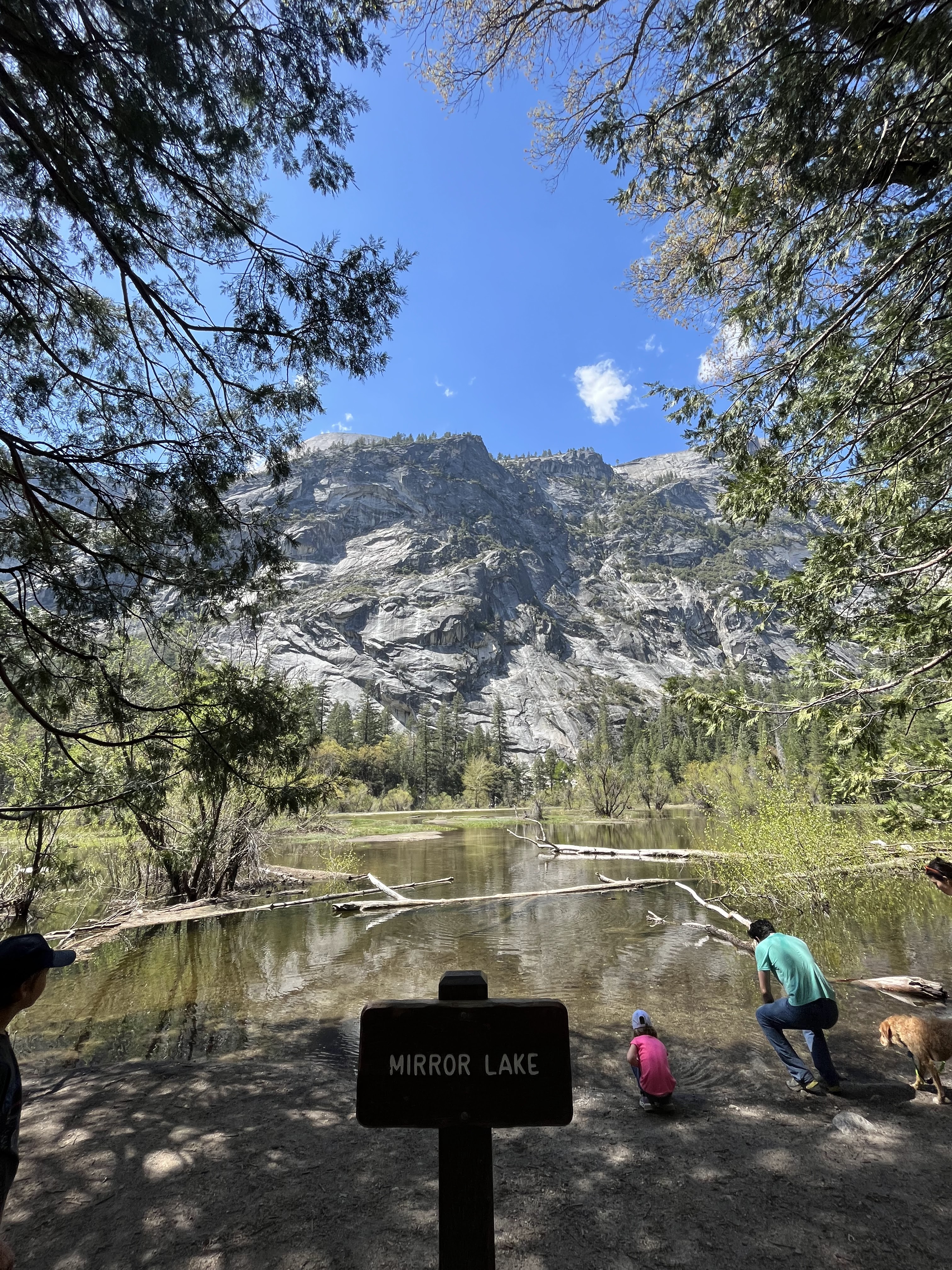 לקחנו שוב שאטל (הפעם סגול) לתחנה 17 – נקודת ההתחלה של מסלול ההליכה ל- Mirror Lake. יש מסלול קליל ונוח על כביש (משמאל), אבל אנחנו עשינו טעות ולקחנו את הטרייל מימין, הליכה שחלקה עם עליות ואבנים עד שמגיעים לאגם. ראינו אנשים משכשכים באיזור השקט של האגם, אנחנו רק שטפנו ידיים ופנים. הדרך ממשיכה עוד, ותאורטית אפשר להקיף את האגם, אבל בעונה הכה מושלגת שהיתה השנה הדרך מוצפת בחלקה, אז חזרנו בזהירות בירידות.