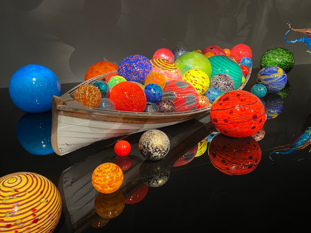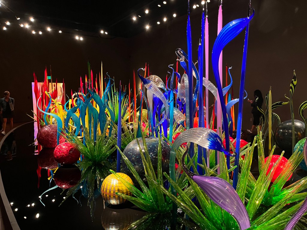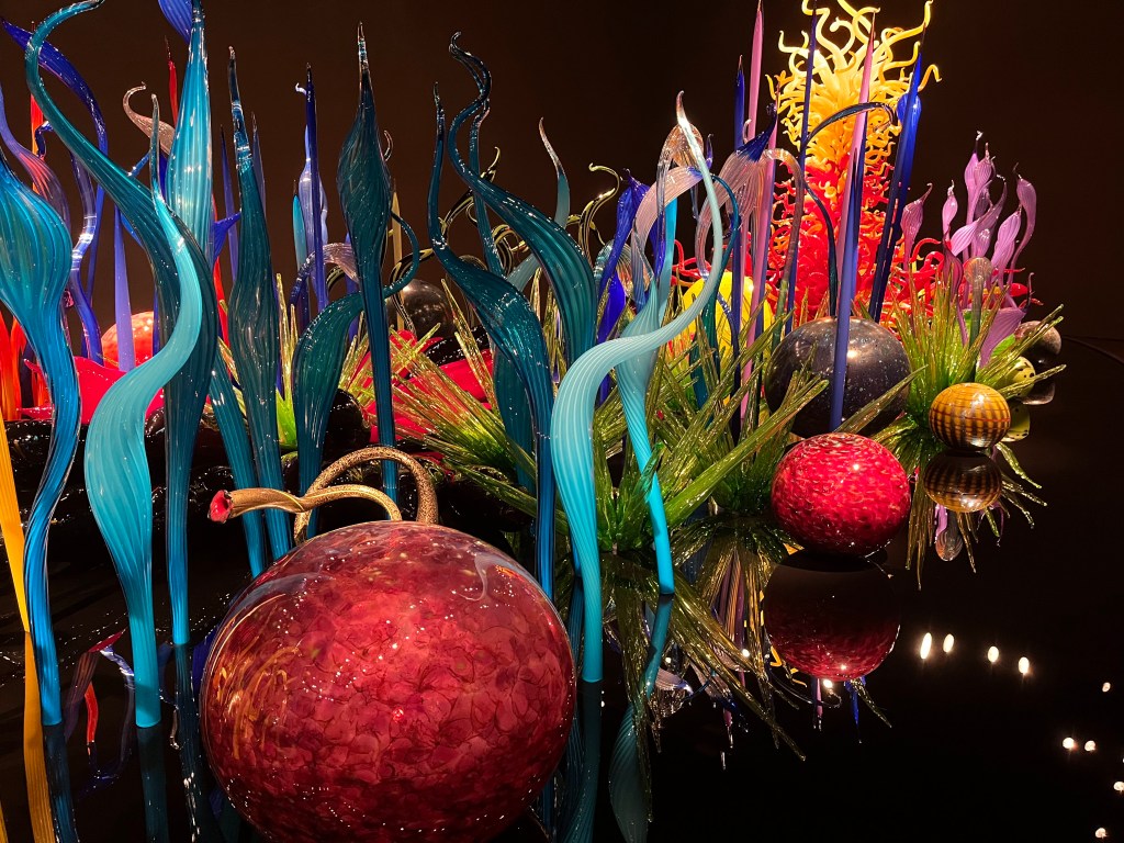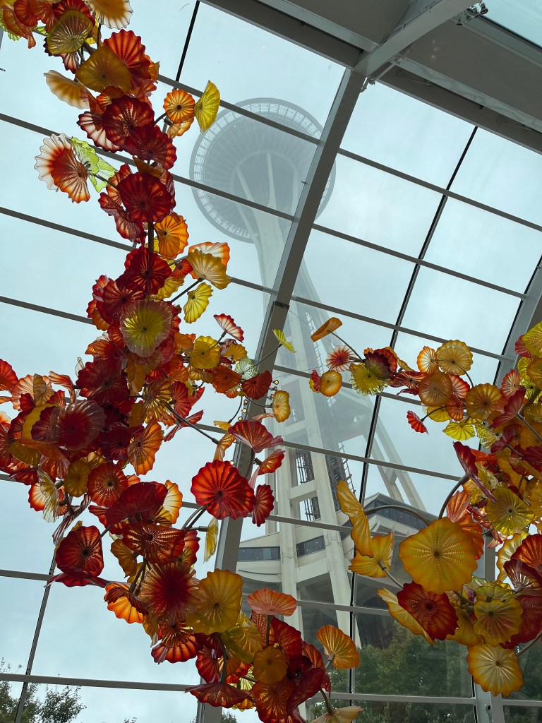 את רוב היום הקדשנו לאיזור Seattle Center ובו מספר אטרקציות תיירותיות מפורסמות. כיוון שלא שילמנו על ארוחת בוקר במלון, התחלנו את היום בבייגלס טריים וטעימים ב Einstein Bros Bagels ממש מעבר לפינה. משם כרבע שעה הליכה הביאה אותנו לפתחו של מוזיאון הזכוכית של צ'יהולי Chihuly Garden and Glass, אמן הזכוכית אולי המפורסם בעולם, ובן העיר סיאטל. יצא לנו לראות בעבר עבודות של צ'יהולי במלון הבלאג'יו בלאס ווגאס, ובתערוכה במוזיאון באי סנטה קתלינה אבל אלו היו רק טעימה. היצירתיות, הצבעוניות, הביצוע המושלם – פשוט מרהיב ומעורר השראה. הלכנו מחדר לחדר בהתפעלות. אל תוותרו על הגן, ועל צפייה בכמה מסרטי הדוקו שמוקרנים בחדר קטן אחרי הכניסה מהגן חזרה למבנה, כולל סרט קצר על תערוכות החוצות של האמן בעיר דוד בירושלים. מומלץ בחום.