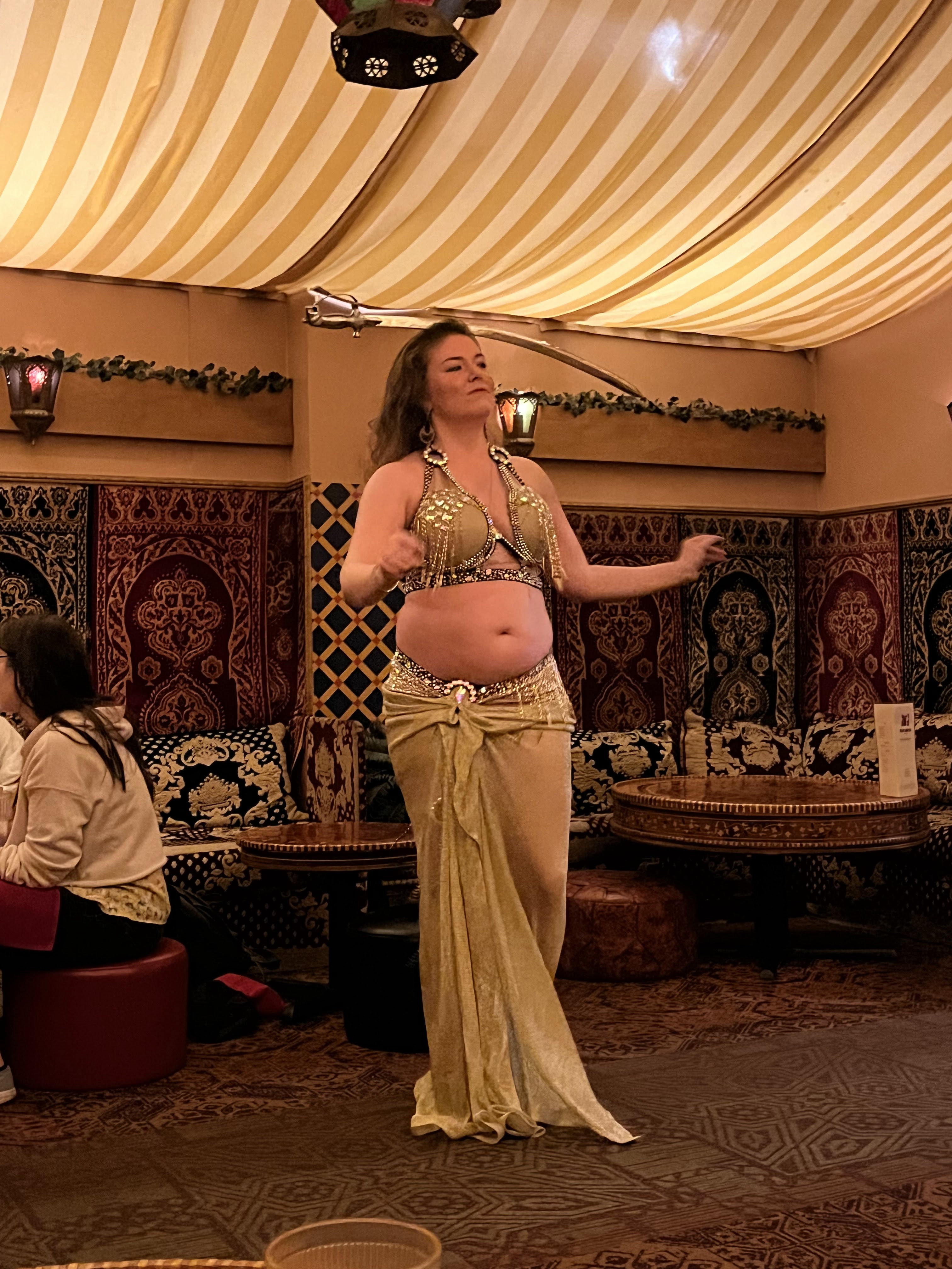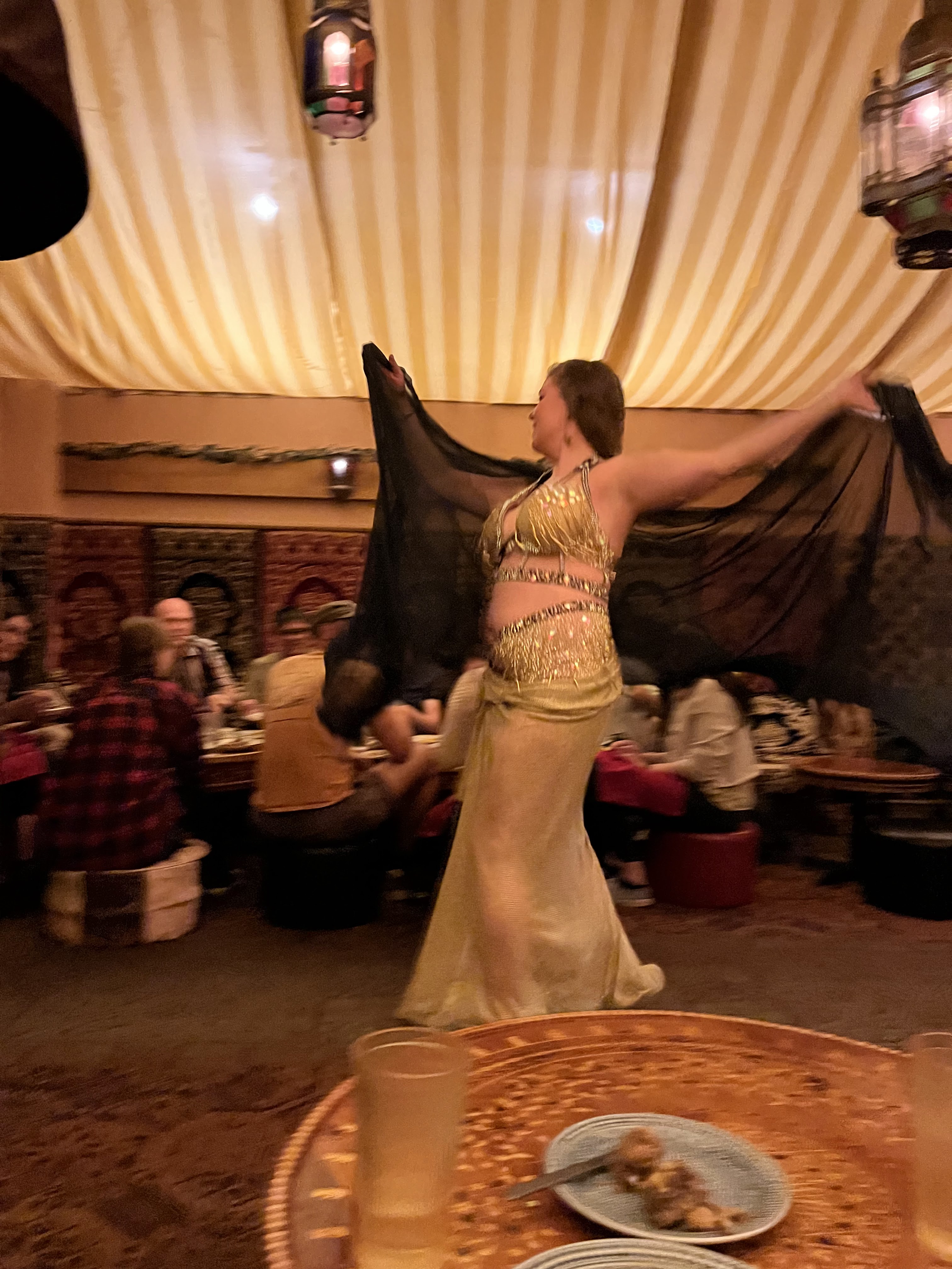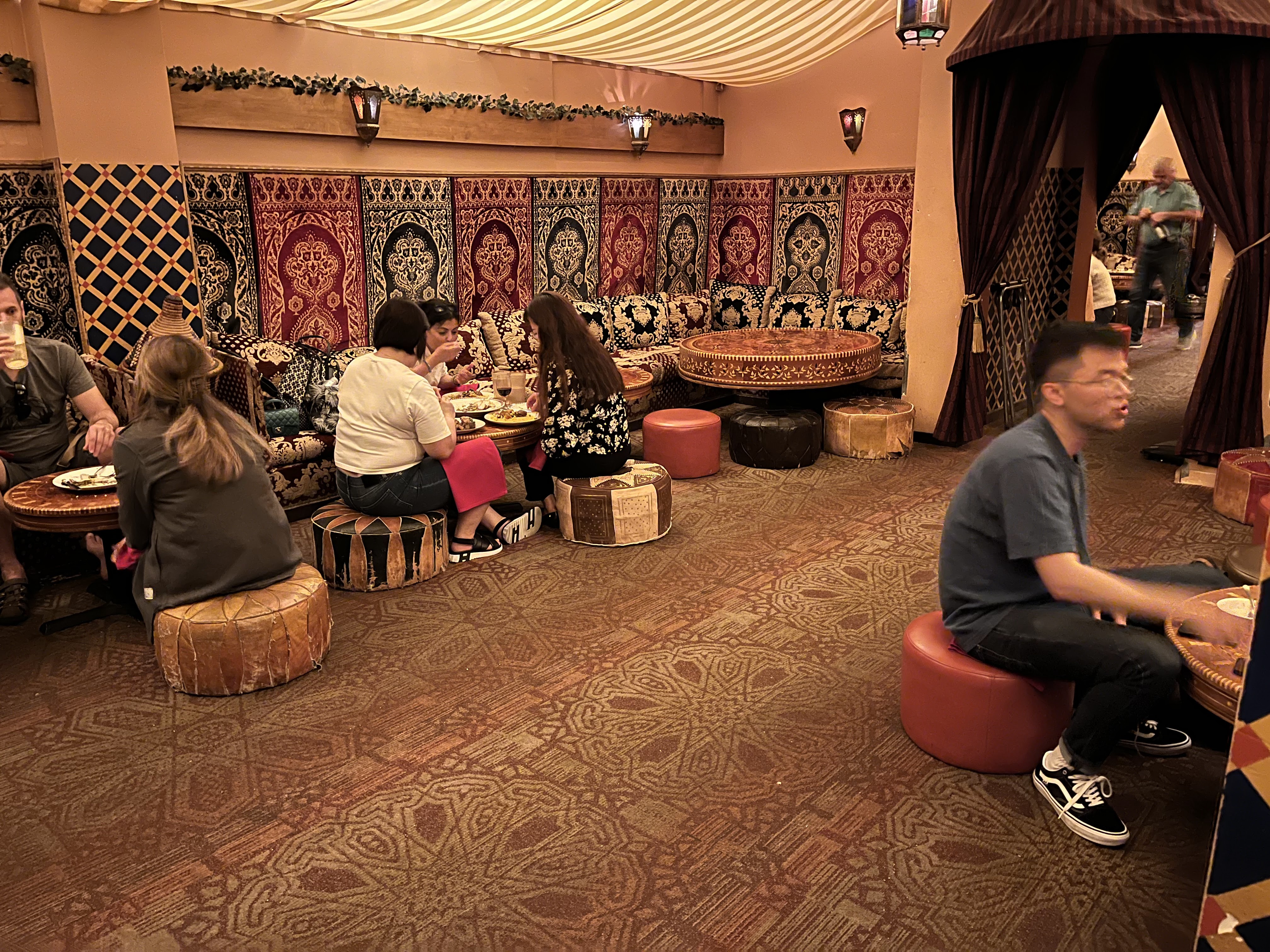 חזרנו למלון למנוחה קלה ובערב הלכנו למסעדה בשם Marrakesh לארוחת ערב בסגנון מרוקאי. הישיבה במסעדה על כריות וספות נמוכות והערב מתחיל בנטילת ידיים. התפריט מסורתי כצפוי, ובהזמנת מנה עיקרית מקבלים גם מרק עדשים, סלט ירקות ומאפה בשר כפתיחה ומלבי מלווה בתה נענע לקינוח. בחלק מהערבים יש גם רקדנית בטן, שבוא נגיד בעדינות שראיתי כבר טובות ממנה, אבל היה משעשע, במיוחד לראות את התגובות של הצעירים האסייתים שישבו בשולחן הסמוך. האוכל היה טעים, השירות היה ידידותי (כולל מלצר שידע כמה מילים בעברית), ולסיכום מאד נהנינו, וגם לא היה יקר (כ$45 לאדם כולל טיפ). חזרנו למלון ברגל, ותכלס את כל היום עשינו ברגל.