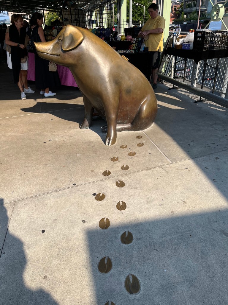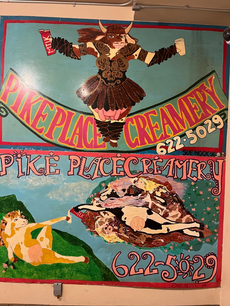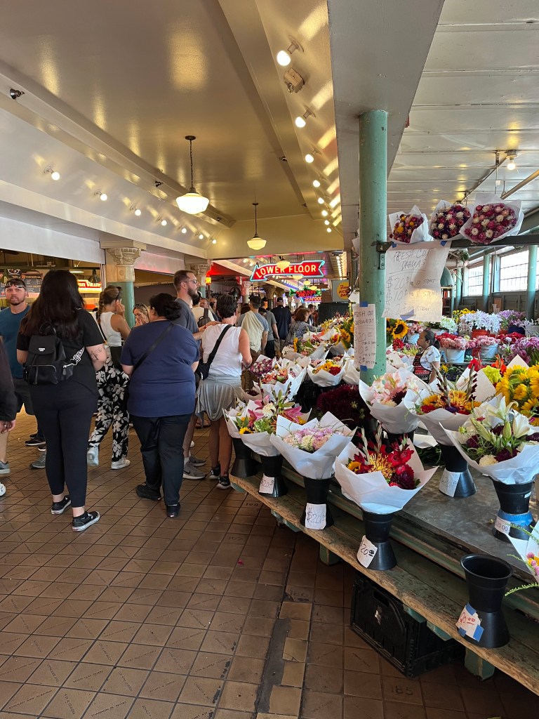 עשינו צ'ק אאוט והשארנו את המזוודות במלון, אבל לא אכלנו ארוחת בוקר כי פנינו לסיור אוכל באחד מהשווקים העתיקים, הגדולים והמפורסמים בארה"ב – שוק פייק פלייס Pike Place Market. אנחנו מאד אוהבים סיורי אוכל שמשלבים היסטוריה וסיפורים עם טעימות מקומיות, וגם הסיור הזה לא אכזב. היינו קבוצה קטנה (8 אנשים) והמדריך היה חמוד, ידען ונעים הליכות. השוק ענקי ואין סיכוי לחוות את כולו, אבל מגוון המנות נתן הצצה למגוון סוגי האוכל והמעדנים שיש לרכישה בשוק. הסיור עבר בעיקר באיזורים הפתוחים של השוק, בעיקר כי החלק המקורה מאד צפוף ועמוס. כן ראינו שתיים מנקודות ההיילייט המפורסמות של השוק – הסטארבקס הראשון ודוכן הדגים שנזרקים מיד אל יד (לא צילמתי אבל בטוחה שיש מיליון סרטונים ברשת).