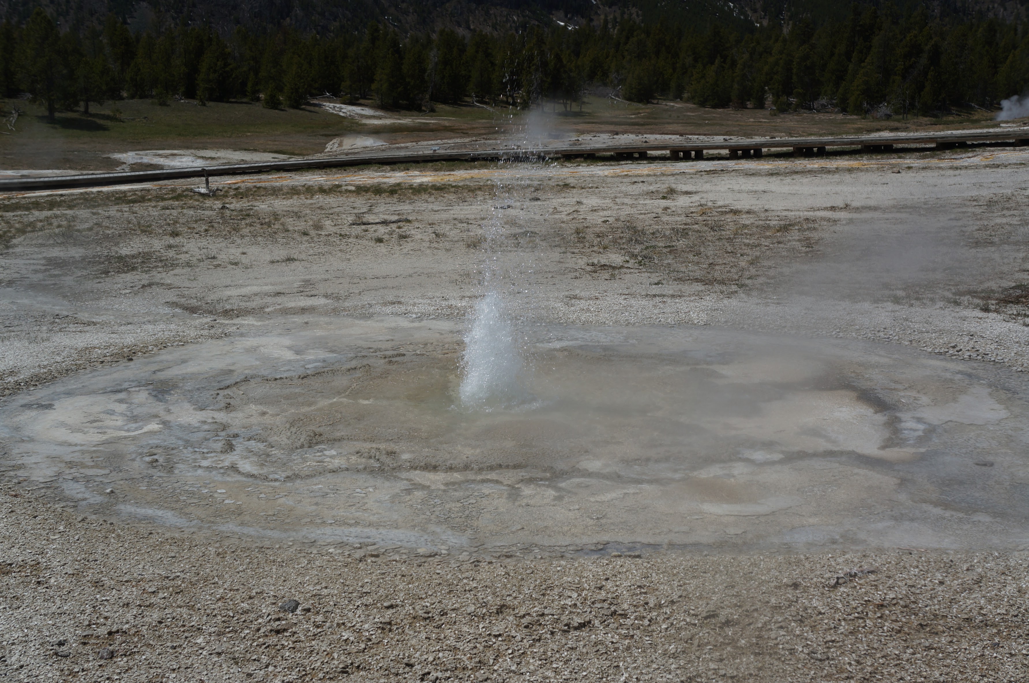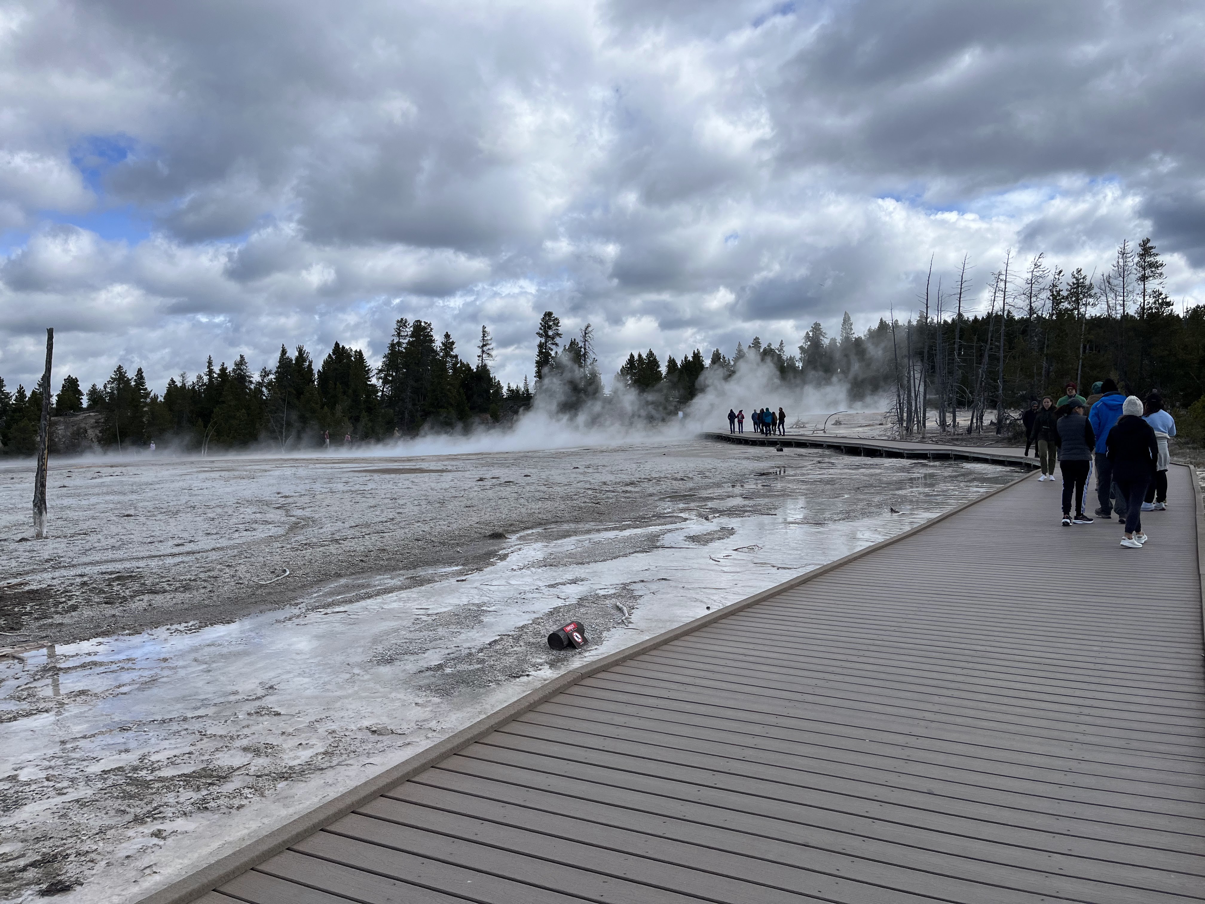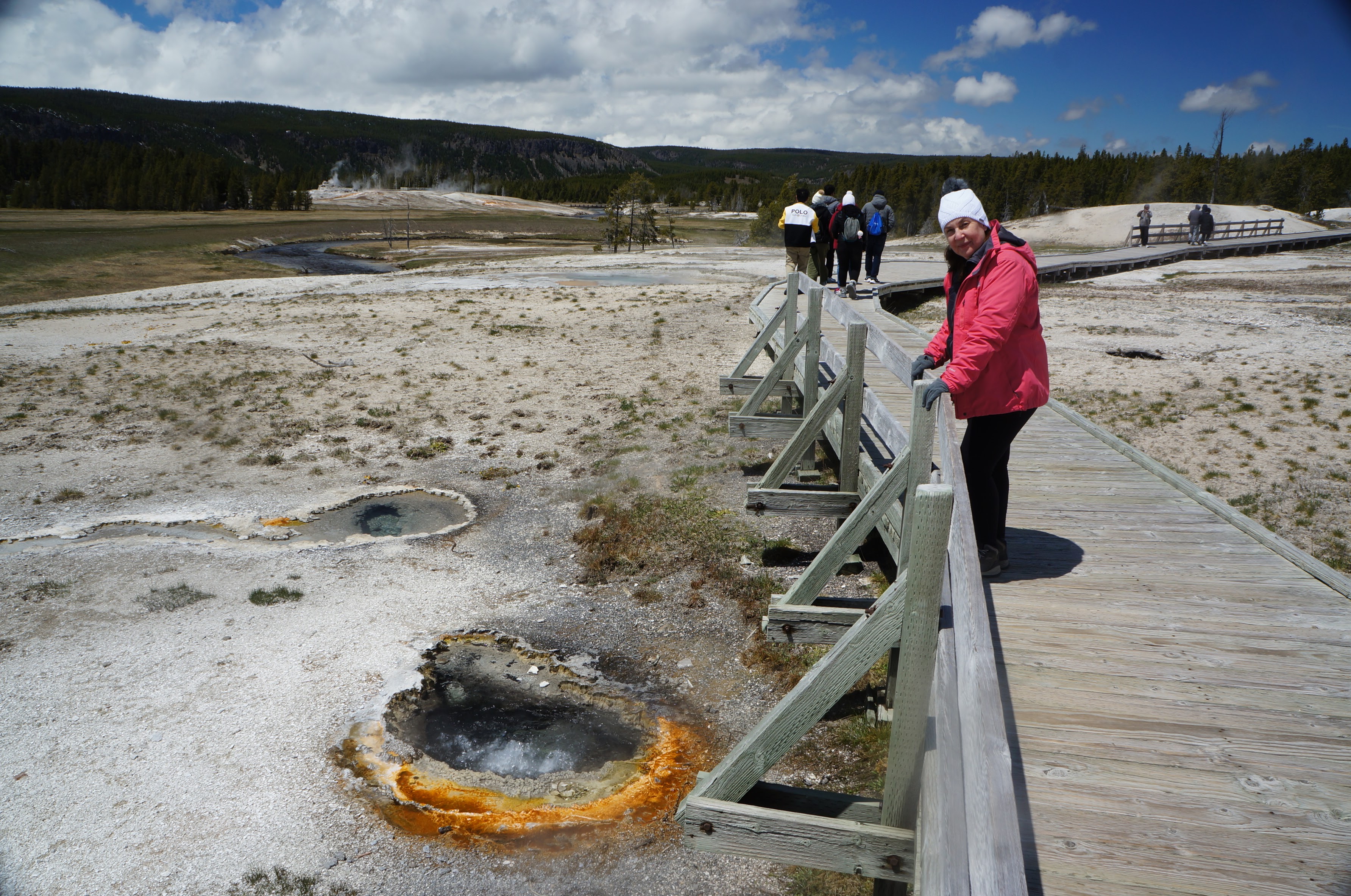 נקודת העצירה הראשונה שלנו היתה באגן הגייזרים התחתון Lower Geyser Basin, למסלול שנקרא Fountain Paint Pot Trail. הלכנו לאורך מסלול ההליכה על הטיילת (יש שם יותר טוב למסלול הליכה מוגבה מקרשים?). המסלול לא ארוך, ומה שנחמד בו זה שיש לאורכו את כל התופעות הגאותרמיות שיש בפארק במקום אחד – גייזרים, בריכות בוץ מבעבעות, עמודי קיטור שיוצאים מהאדמה, ומעיינות חמים שממש לא ראויים לטבילה. נופים שלא מהעולם הזה.