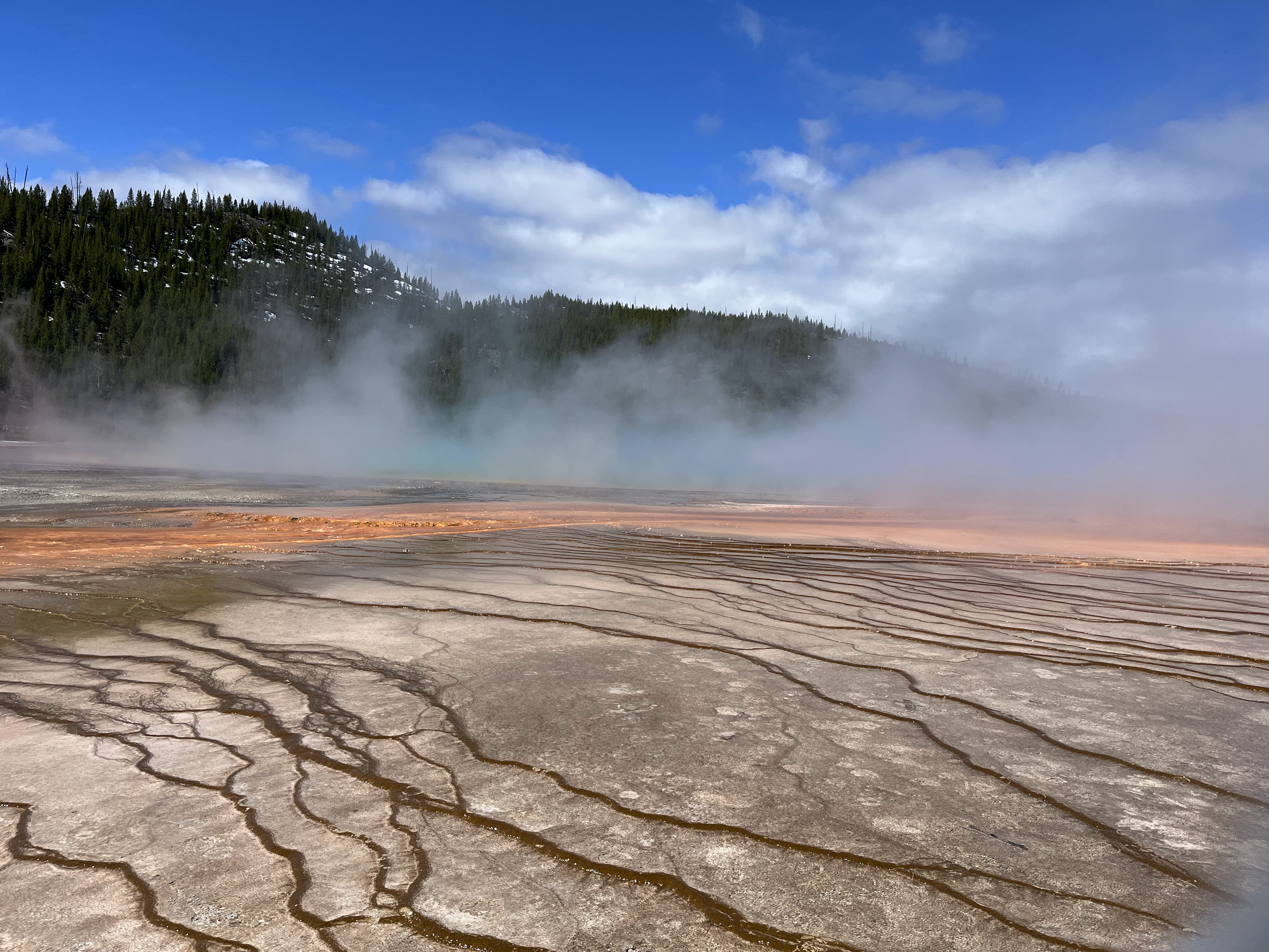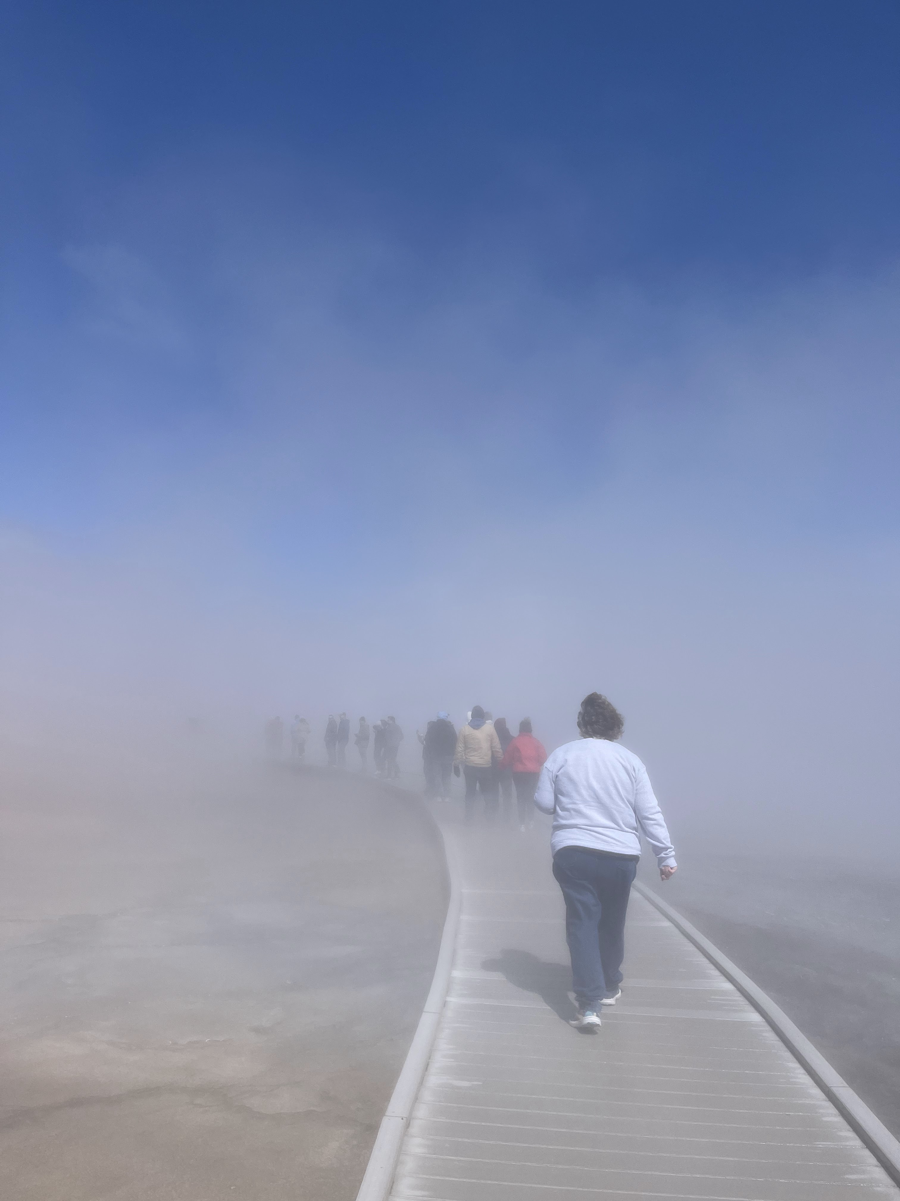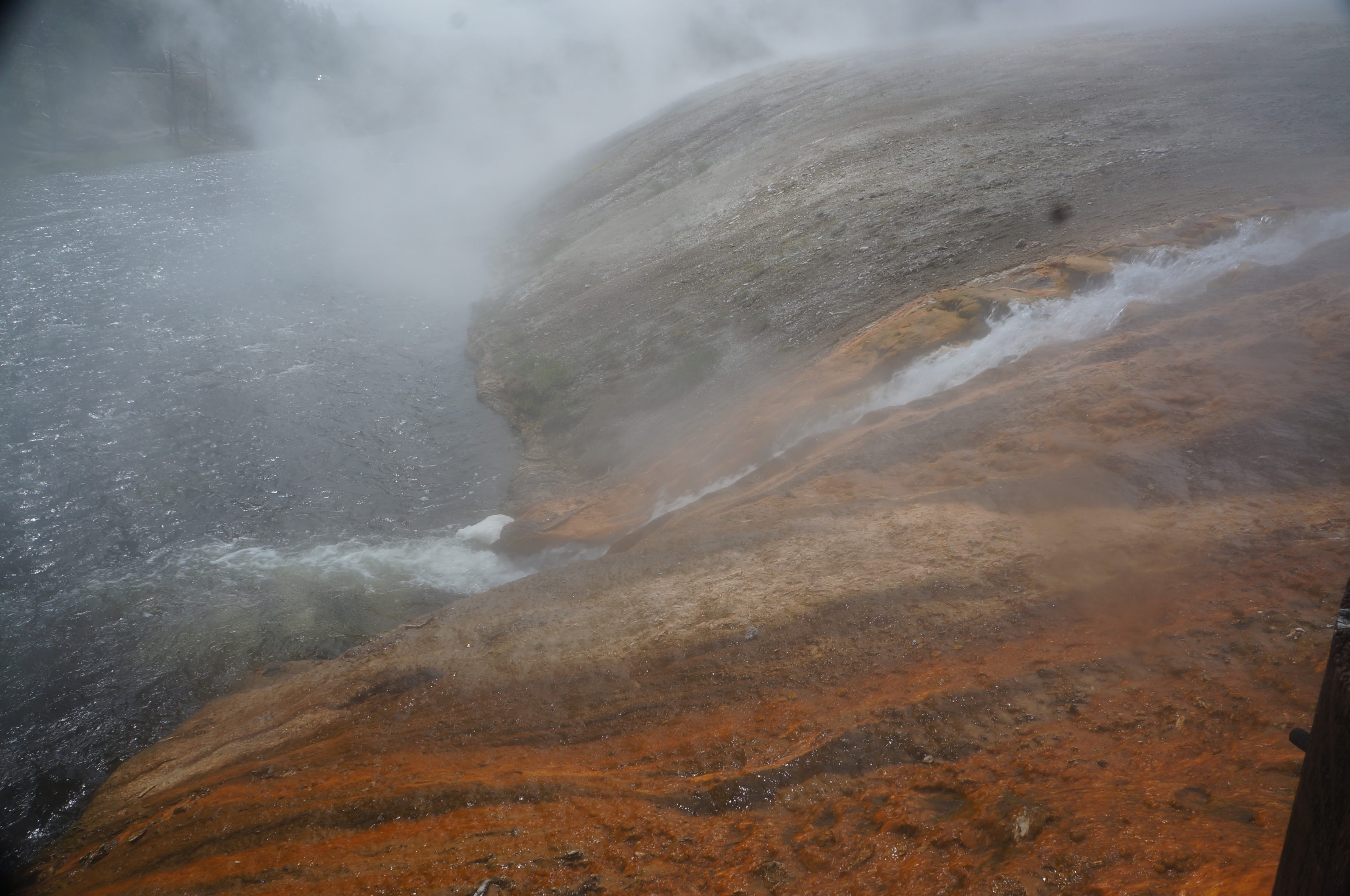 נקודת העצירה הראשונה שלנו היתה באגן הגייזרים התחתון Lower Geyser Basin, למסלול שנקרא Fountain Paint Pot Trail. הלכנו לאורך מסלול ההליכה על הטיילת (יש שם יותר טוב למסלול הליכה מוגבה מקרשים?). המסלול לא ארוך, ומה שנחמד בו זה שיש לאורכו את כל התופעות הגאותרמיות שיש בפארק במקום אחד – גייזרים, בריכות בוץ מבעבעות, עמודי קיטור שיוצאים מהאדמה, ומעיינות חמים שממש לא ראויים לטבילה. נופים שלא מהעולם הזה.