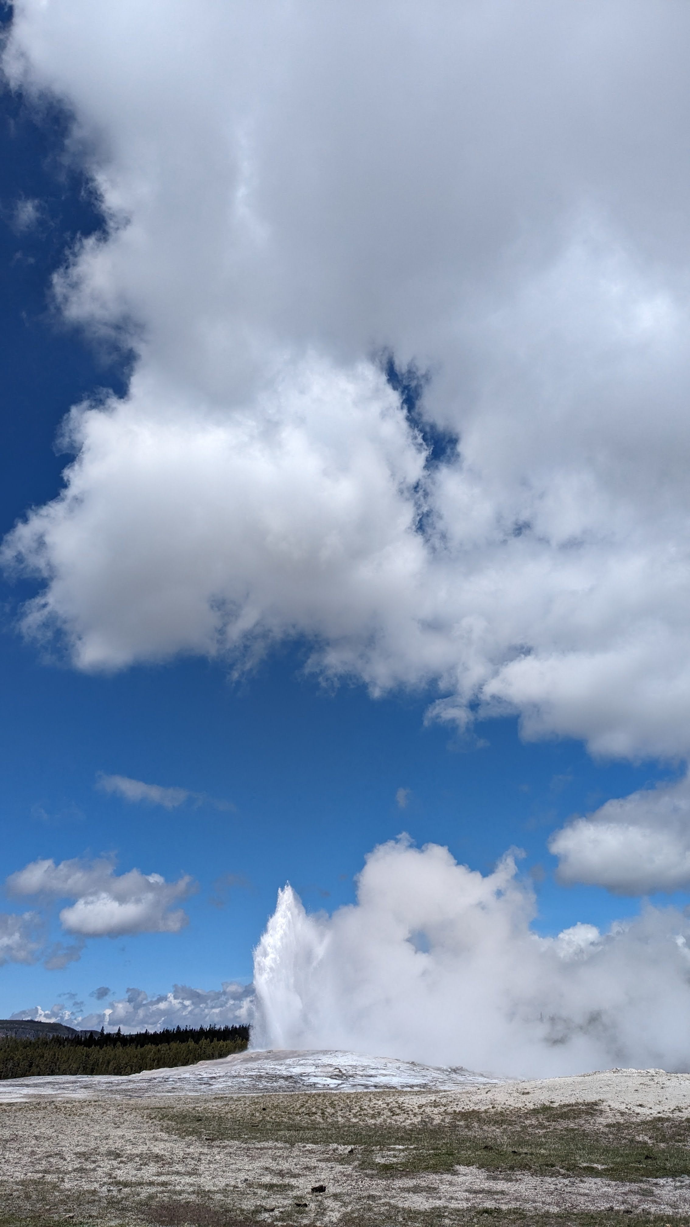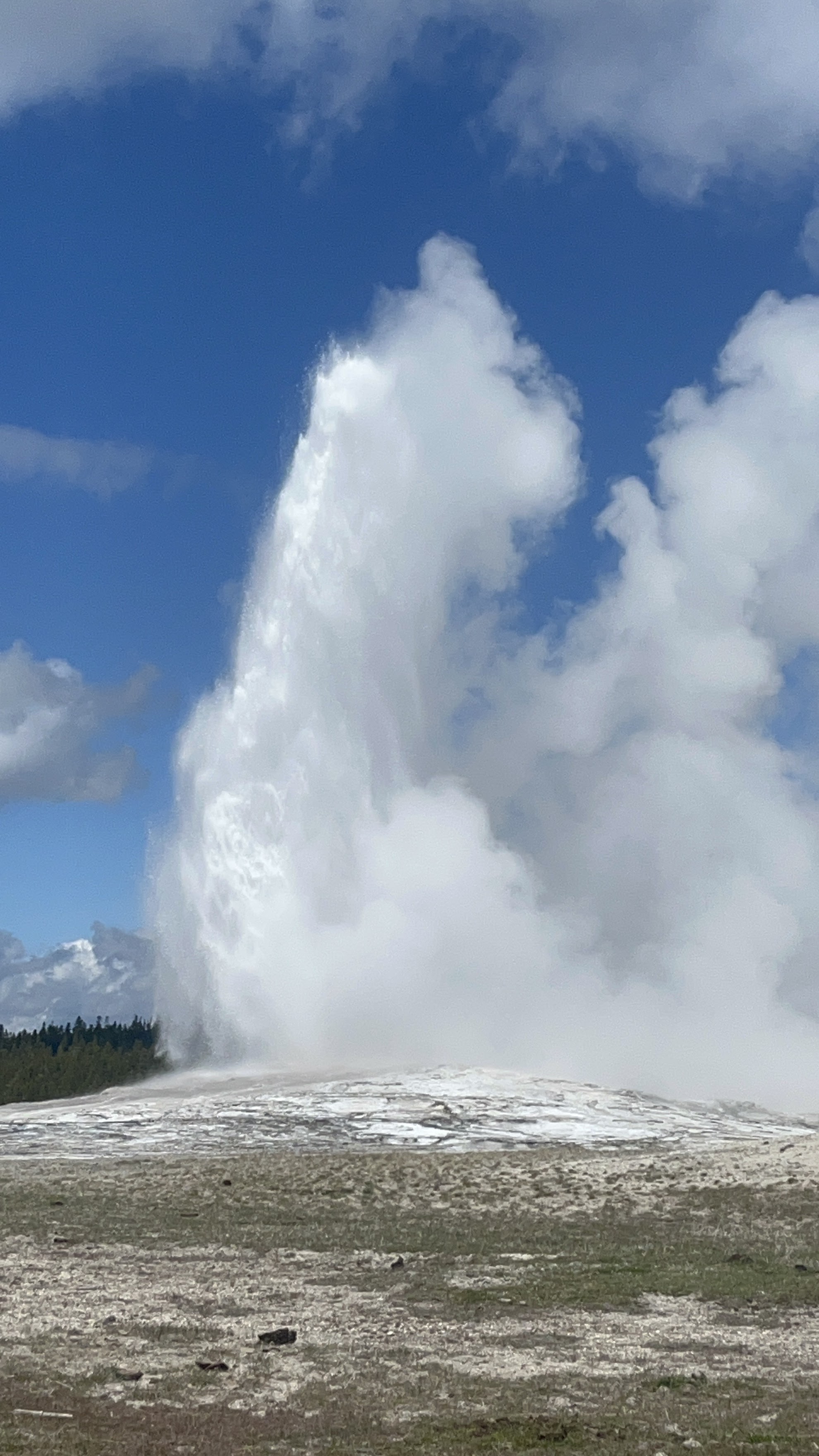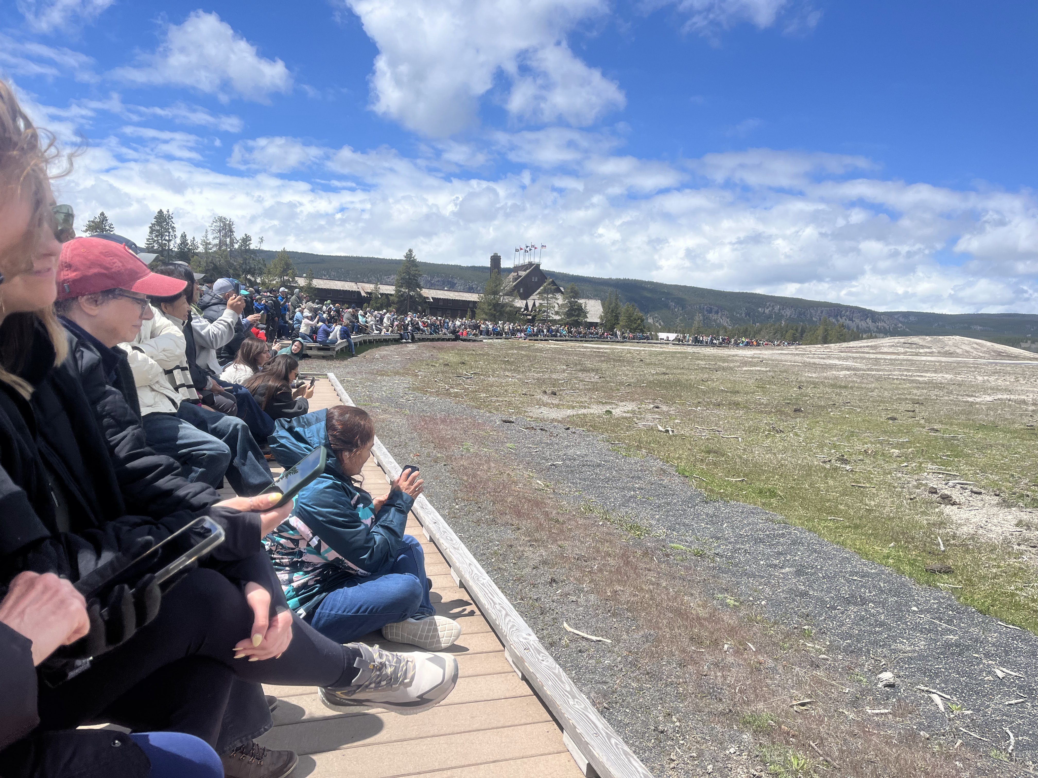 נקודת העצירה הבאה שלנו היתה באגן הגייזרים העליון Upper Geyser Basin מקום מושבו של היעד מספר אחד בפארק – הגייזר הזקן הנאמן אולד פיית׳פול Old Faithfull. כשהתקרבנו לאיזור חזרה הקליטה ויכולנו לבדוק באפליקציה מתי הוא מתכוון להתפרץ ולכוון את עצמנו להיות שם בזמן. מרכז המבקרים נבנה ממש ליד הגייזר וההליכה אליו קצרצרה. יש מסביב ספסלים ואנשים יושבים ומחכים. סוריאליסטי למדי. כצפוי, ההתפרצות מגיעה בזמן, ומסתיימת במחיאות כפיים. זה מרשים, אבל נורא תיירותי.