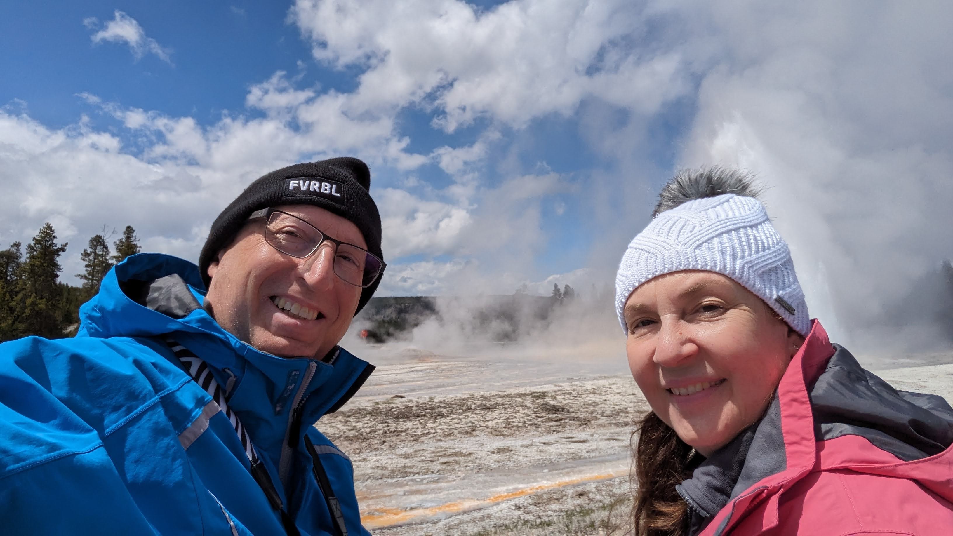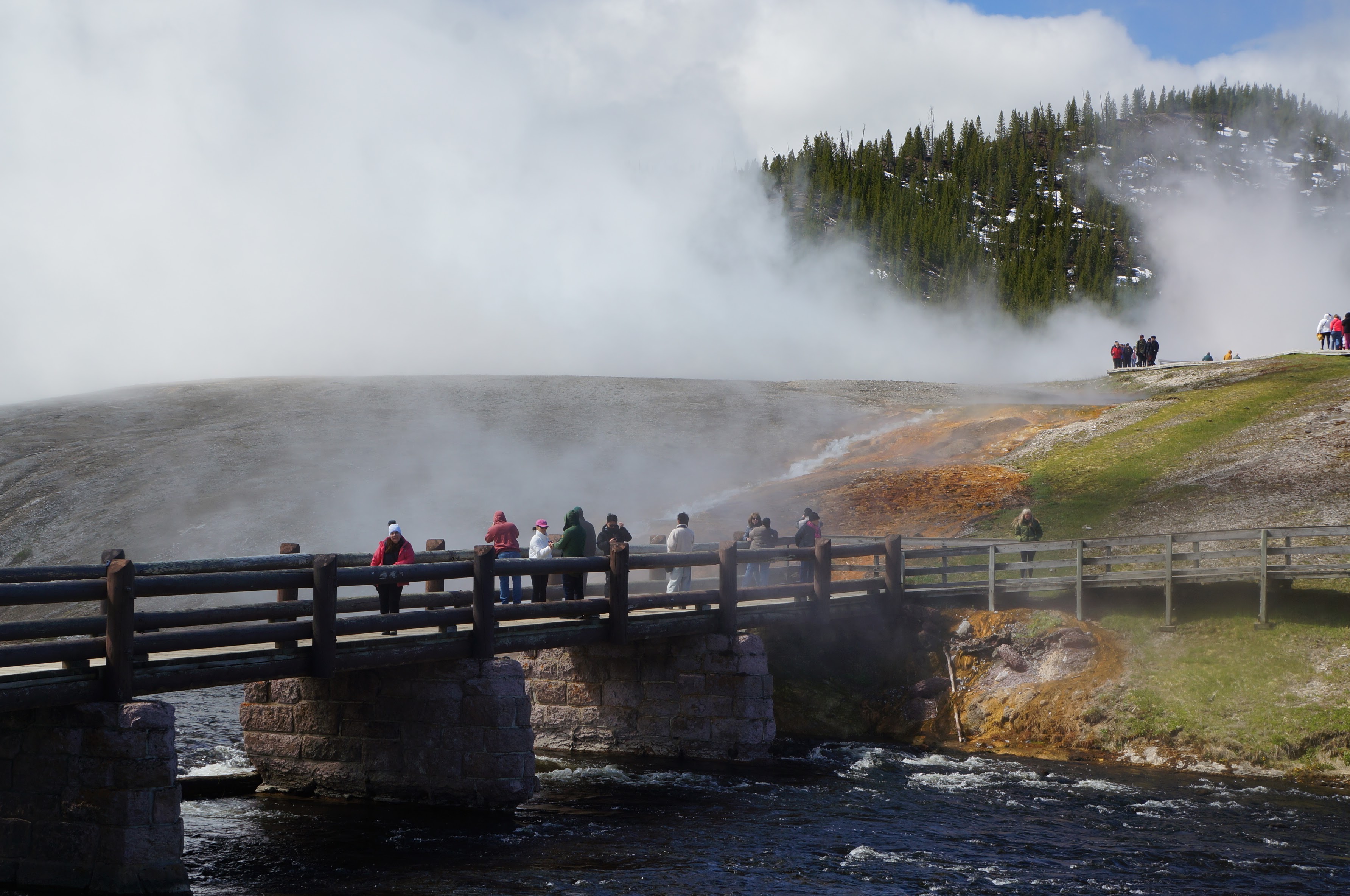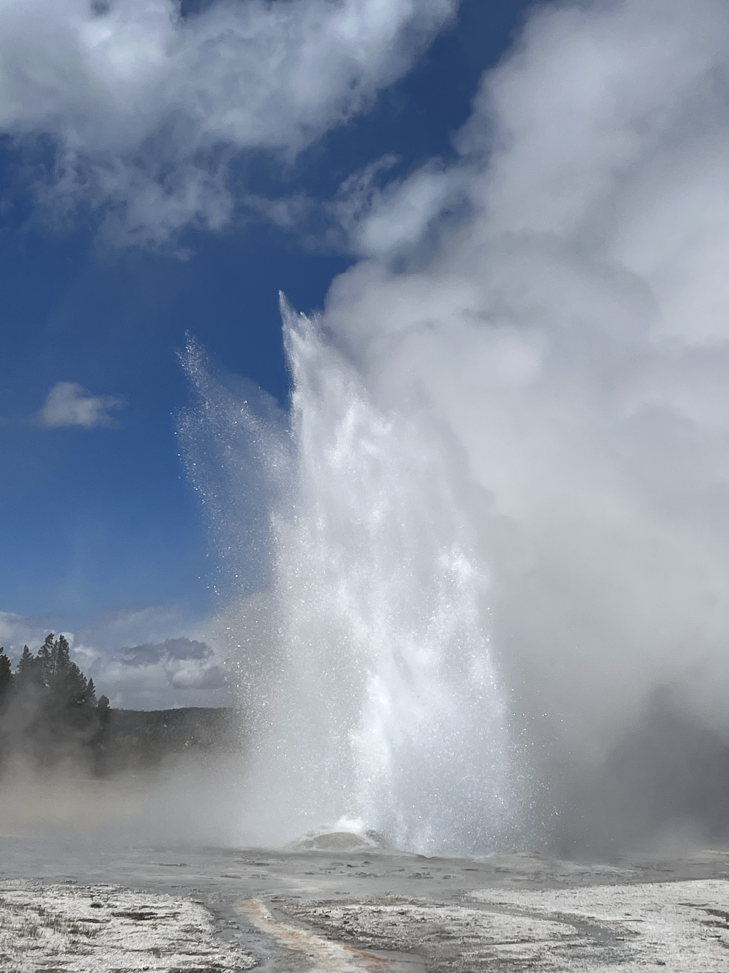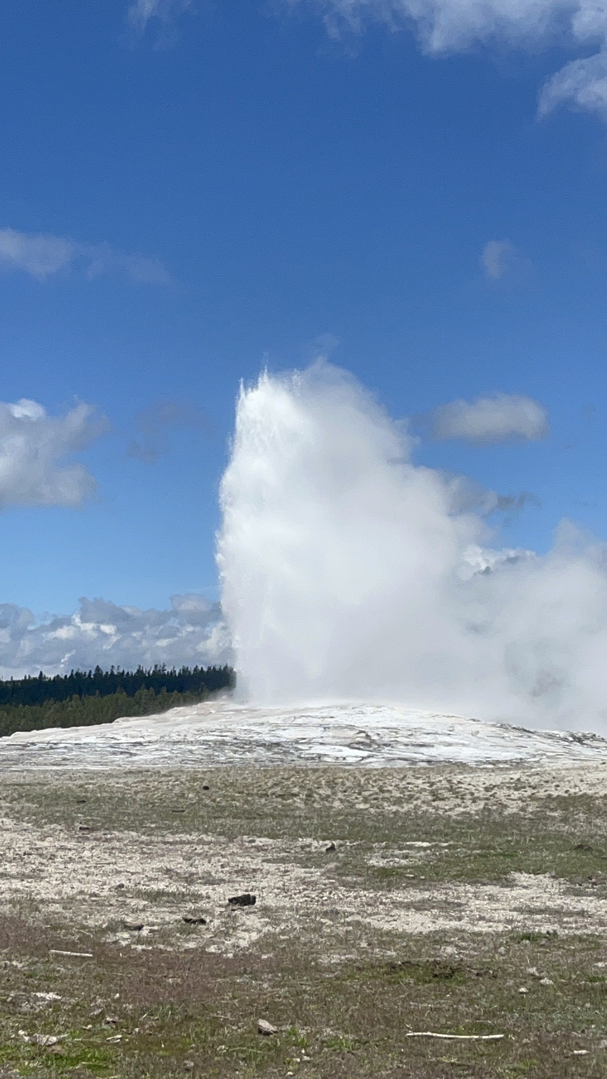 נקודת העצירה הבאה שלנו היתה באגן הגייזרים העליון Upper Geyser Basin מקום מושבו של היעד מספר אחד בפארק – הגייזר הזקן הנאמן אולד פיית׳פול Old Faithfull. כשהתקרבנו לאיזור חזרה הקליטה ויכולנו לבדוק באפליקציה מתי הוא מתכוון להתפרץ ולכוון את עצמנו להיות שם בזמן. מרכז המבקרים נבנה ממש ליד הגייזר וההליכה אליו קצרצרה. יש מסביב ספסלים ואנשים יושבים ומחכים. סוריאליסטי למדי. כצפוי, ההתפרצות מגיעה בזמן, ומסתיימת במחיאות כפיים. זה מרשים, אבל נורא תיירותי.