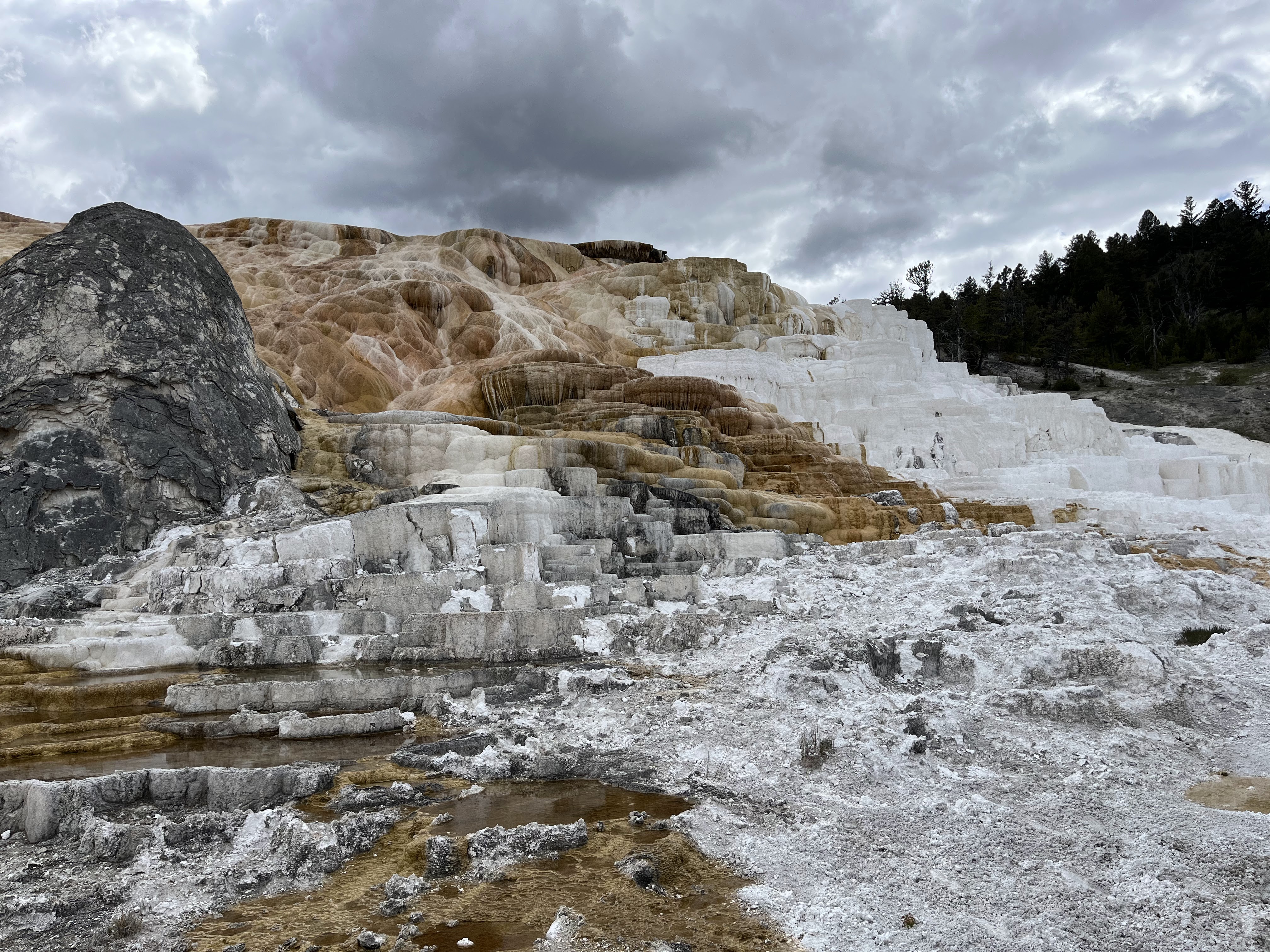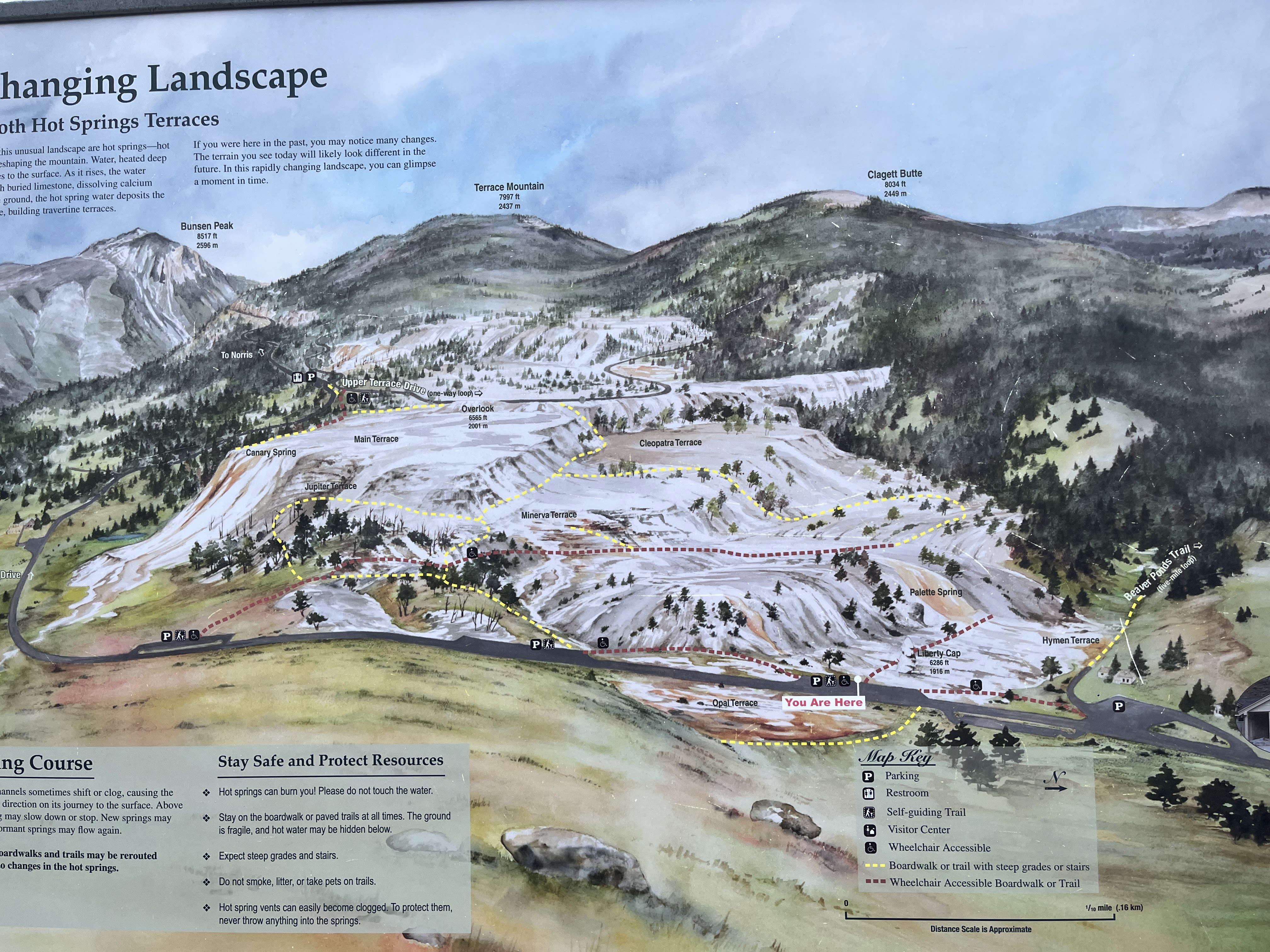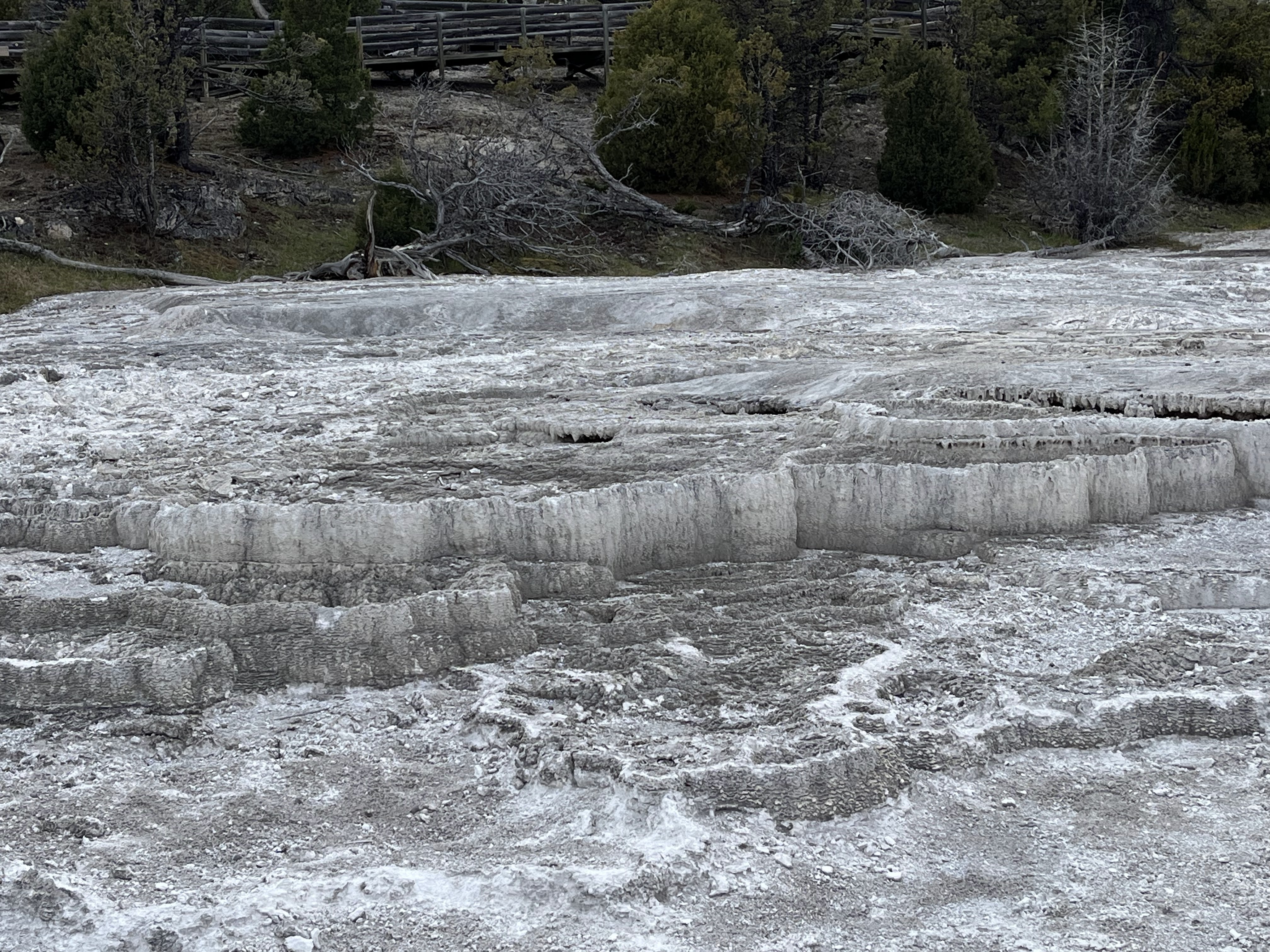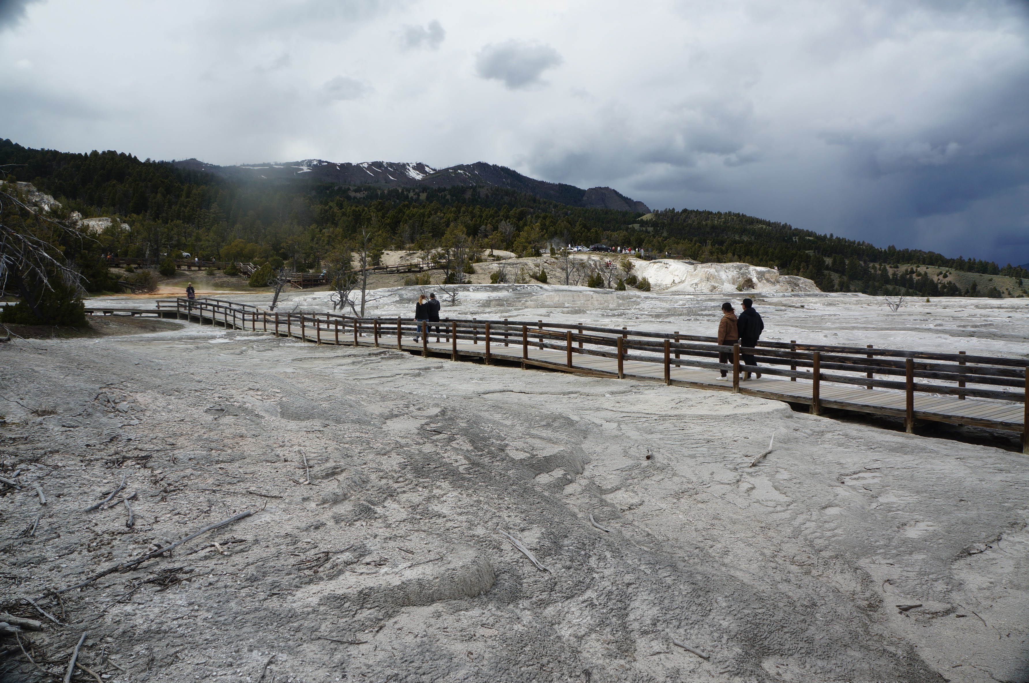 נקודת הביקור האחרונה שלנו ליום זה היתה במאמות׳ הוט ספרינגס Mammoth Hot Springs בכניסה הצפונית של הפארק. עוד יעד של נופים בלתי הגיוניים של בריכות רותחות ומשקעים שהפכו לטראסות מרשימות בצבעים בין לבן בוהק לכתום חלודה. התחלנו בלופ העליון, חנינו ועשינו מסלול הליכה סביב הטרסות העליונות, השלמנו את הלופ בנהיגה וירדנו לאיזור הטרסות התחתונות. הלופ הוא חד כיווני אז אם ראיתם משהו יפה, תעצרו. לא היה לי כוח לעלות במדרגות הרבות של מסלול ההליכה בטרסות התחתונות אז רק התרשמנו מ Liberty Cap – העמוד שאי אפשר לפספס ו-Palette Spring היפיפה שנמצאים בגובה החניה. למטיבי לכת עם זמן פנוי יש מסלול הליכה בטבע של 5.5 מייל (9 ק"מ) שאמור להיות מאד יפה בשם Beaver Pond Trail.