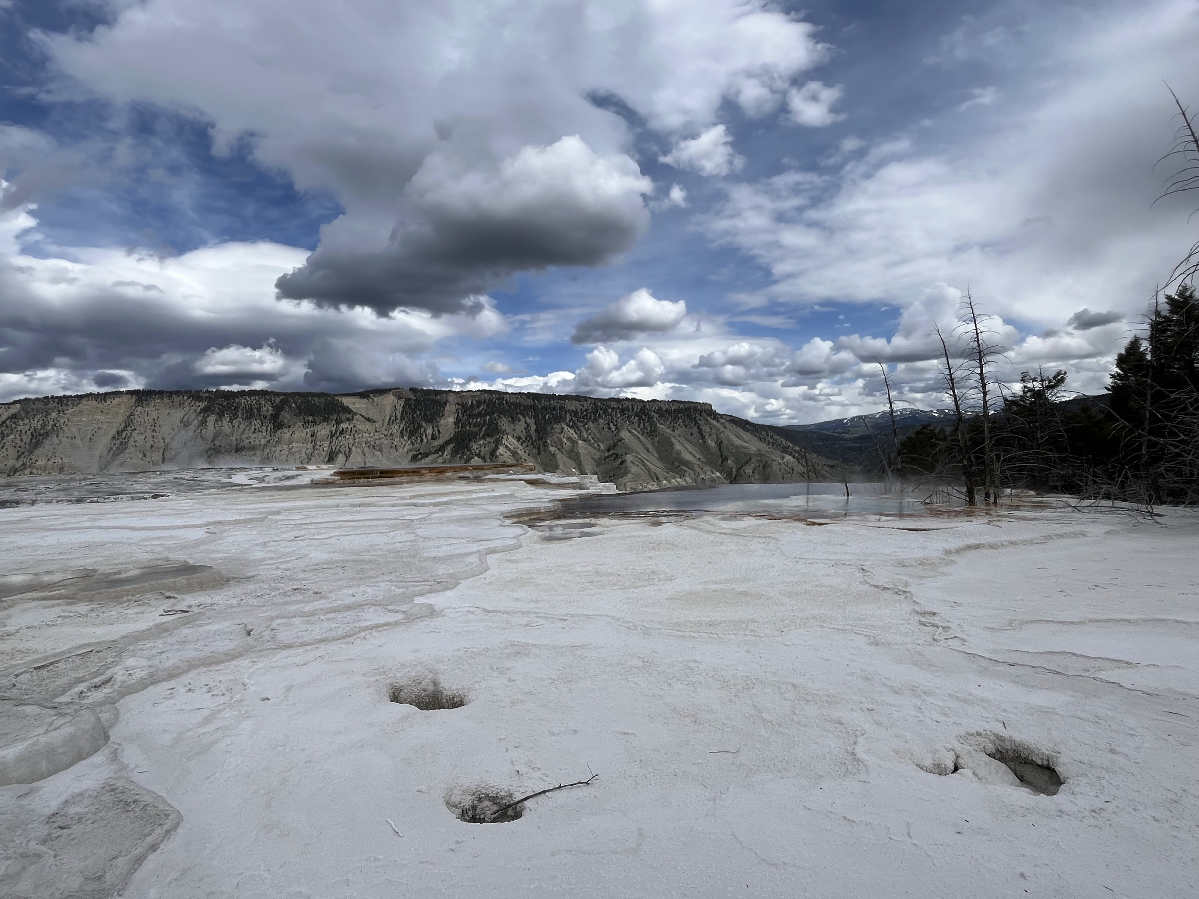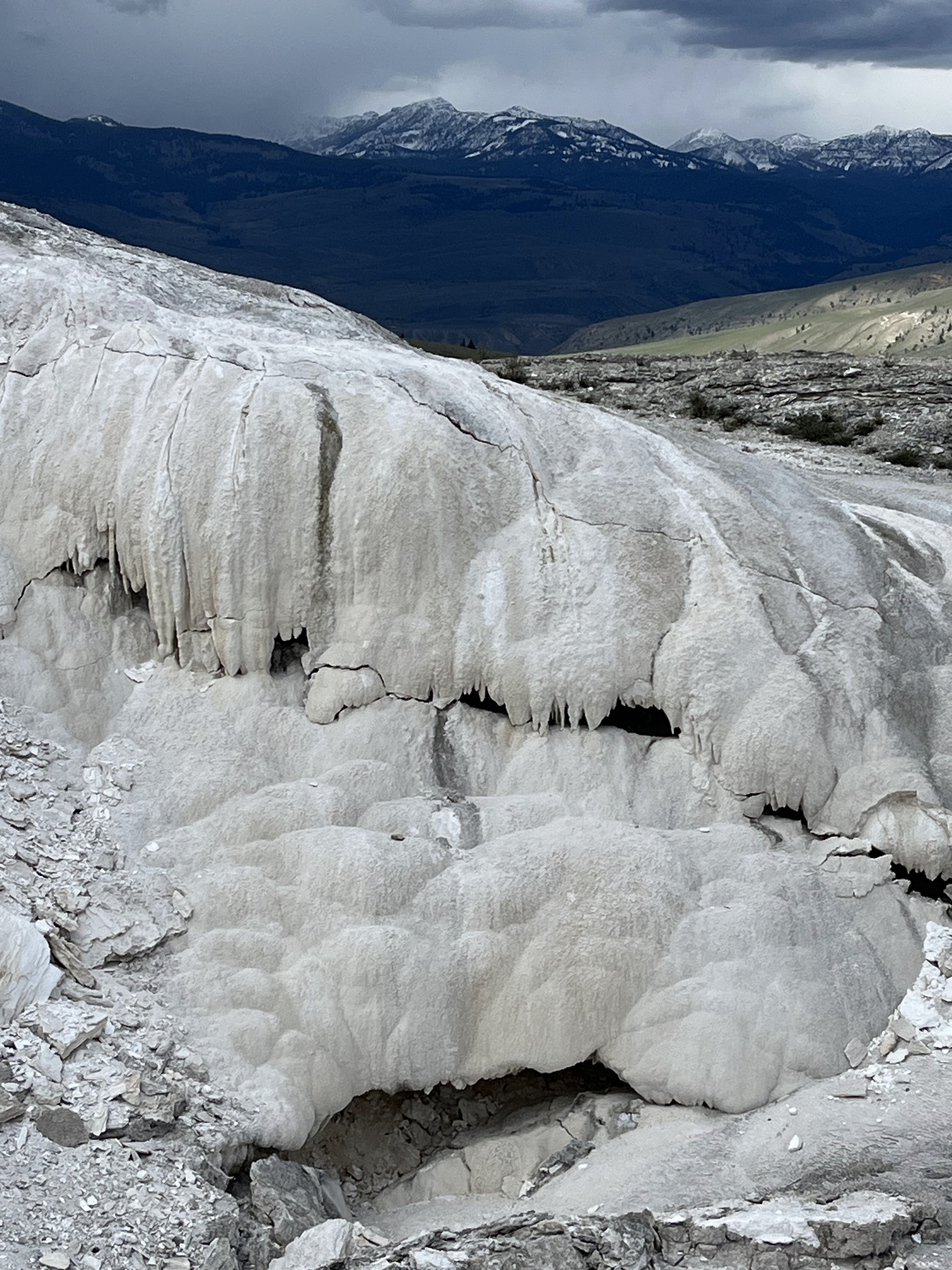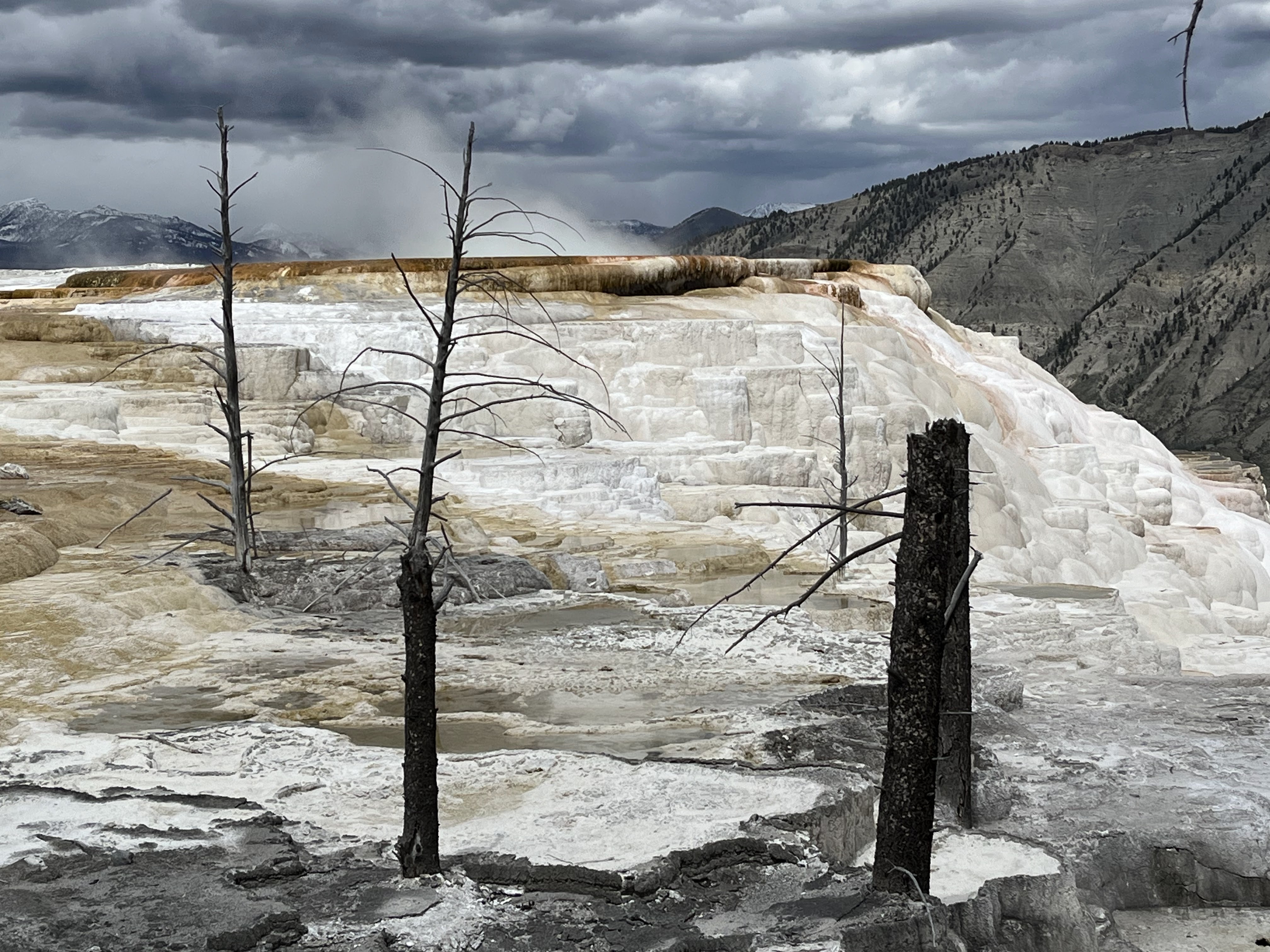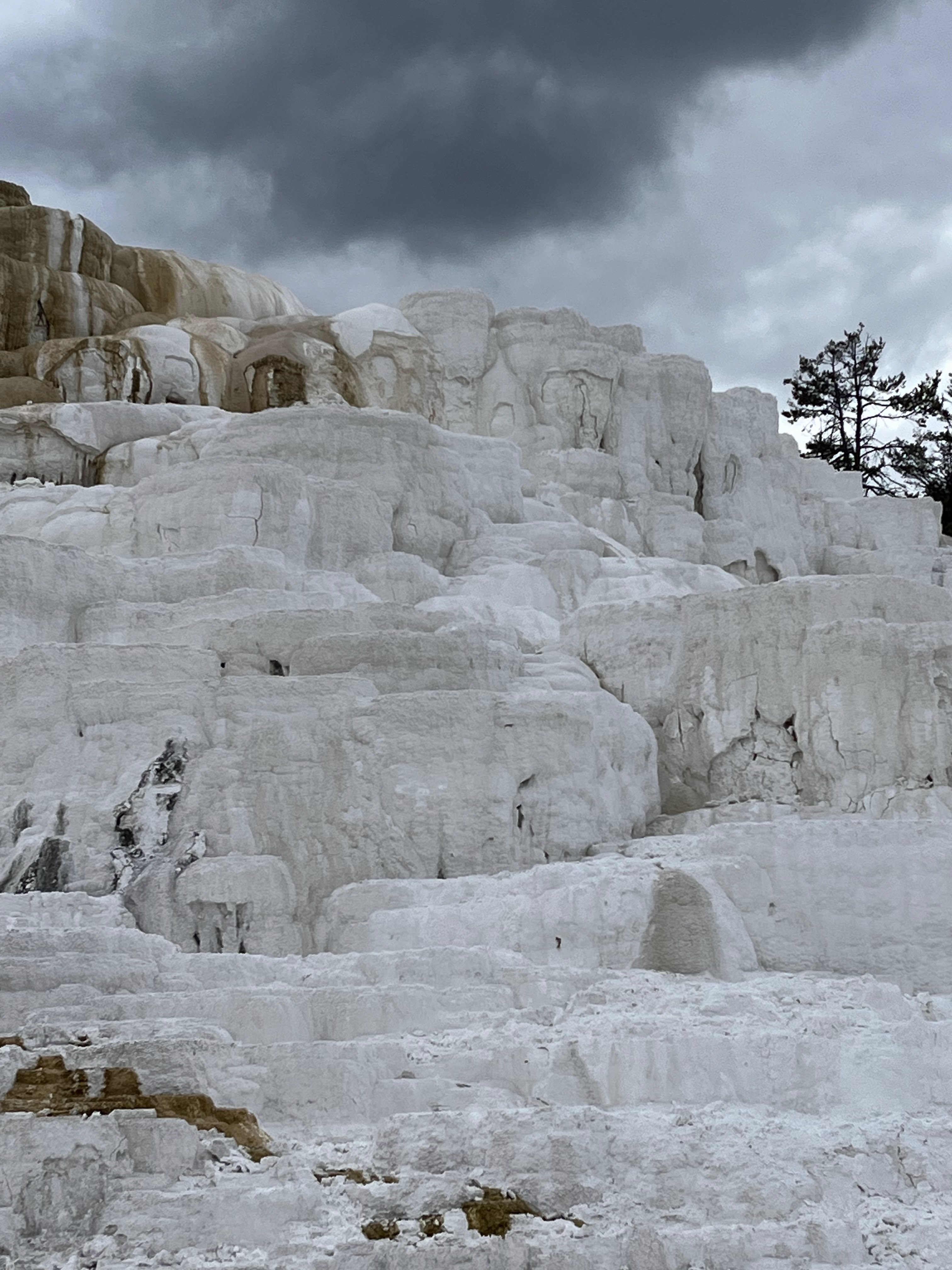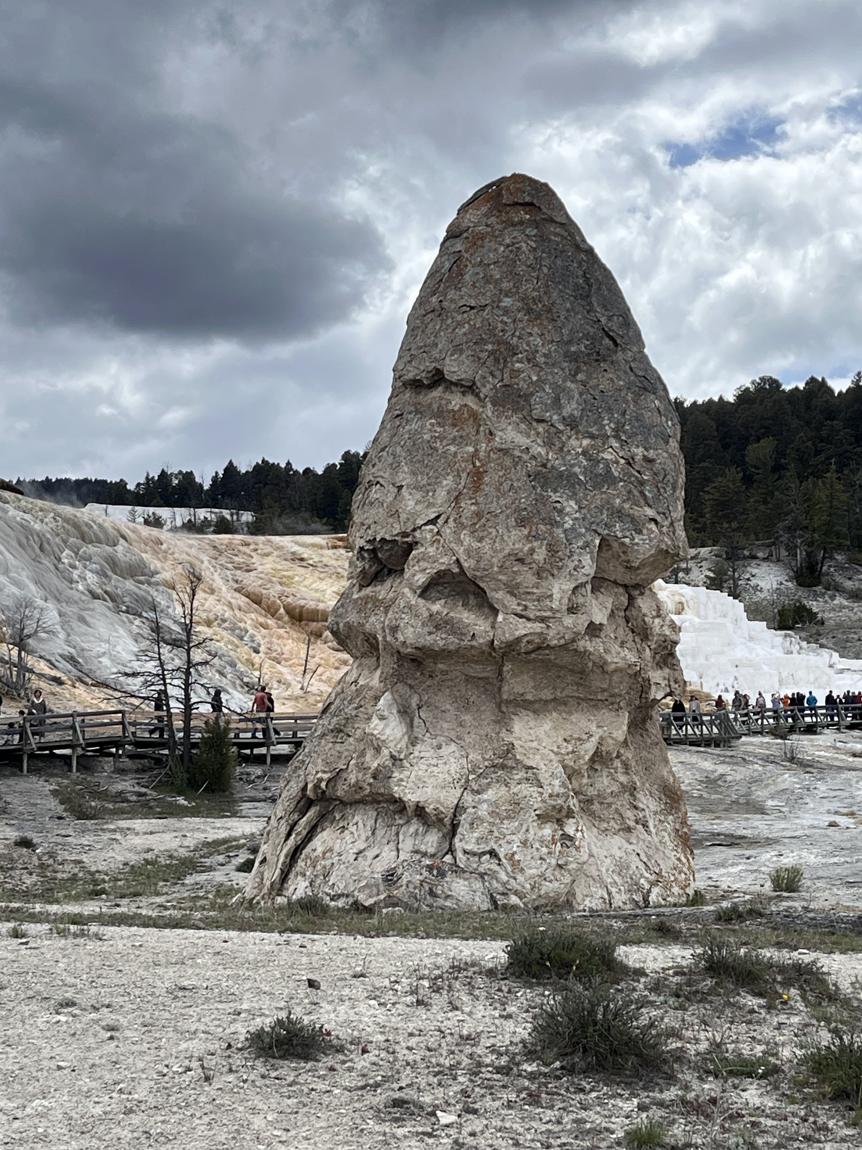 נקודת הביקור האחרונה שלנו ליום זה היתה במאמות׳ הוט ספרינגס Mammoth Hot Springs בכניסה הצפונית של הפארק. עוד יעד של נופים בלתי הגיוניים של בריכות רותחות ומשקעים שהפכו לטראסות מרשימות בצבעים בין לבן בוהק לכתום חלודה. התחלנו בלופ העליון, חנינו ועשינו מסלול הליכה סביב הטרסות העליונות, השלמנו את הלופ בנהיגה וירדנו לאיזור הטרסות התחתונות. הלופ הוא חד כיווני אז אם ראיתם משהו יפה, תעצרו. לא היה לי כוח לעלות במדרגות הרבות של מסלול ההליכה בטרסות התחתונות אז רק התרשמנו מ Liberty Cap – העמוד שאי אפשר לפספס ו-Palette Spring היפיפה שנמצאים בגובה החניה. למטיבי לכת עם זמן פנוי יש מסלול הליכה בטבע של 5.5 מייל (9 ק"מ) שאמור להיות מאד יפה בשם Beaver Pond Trail.