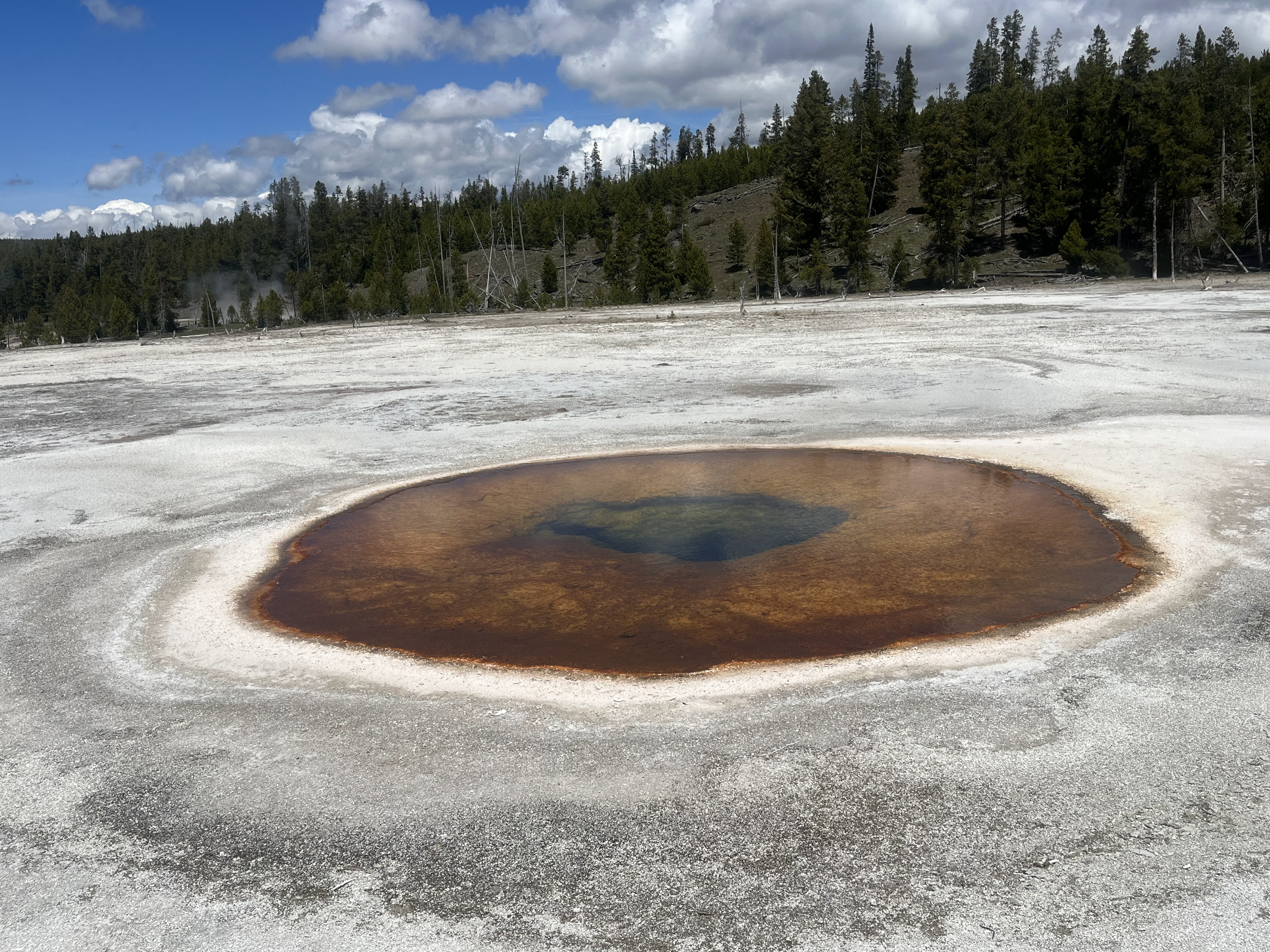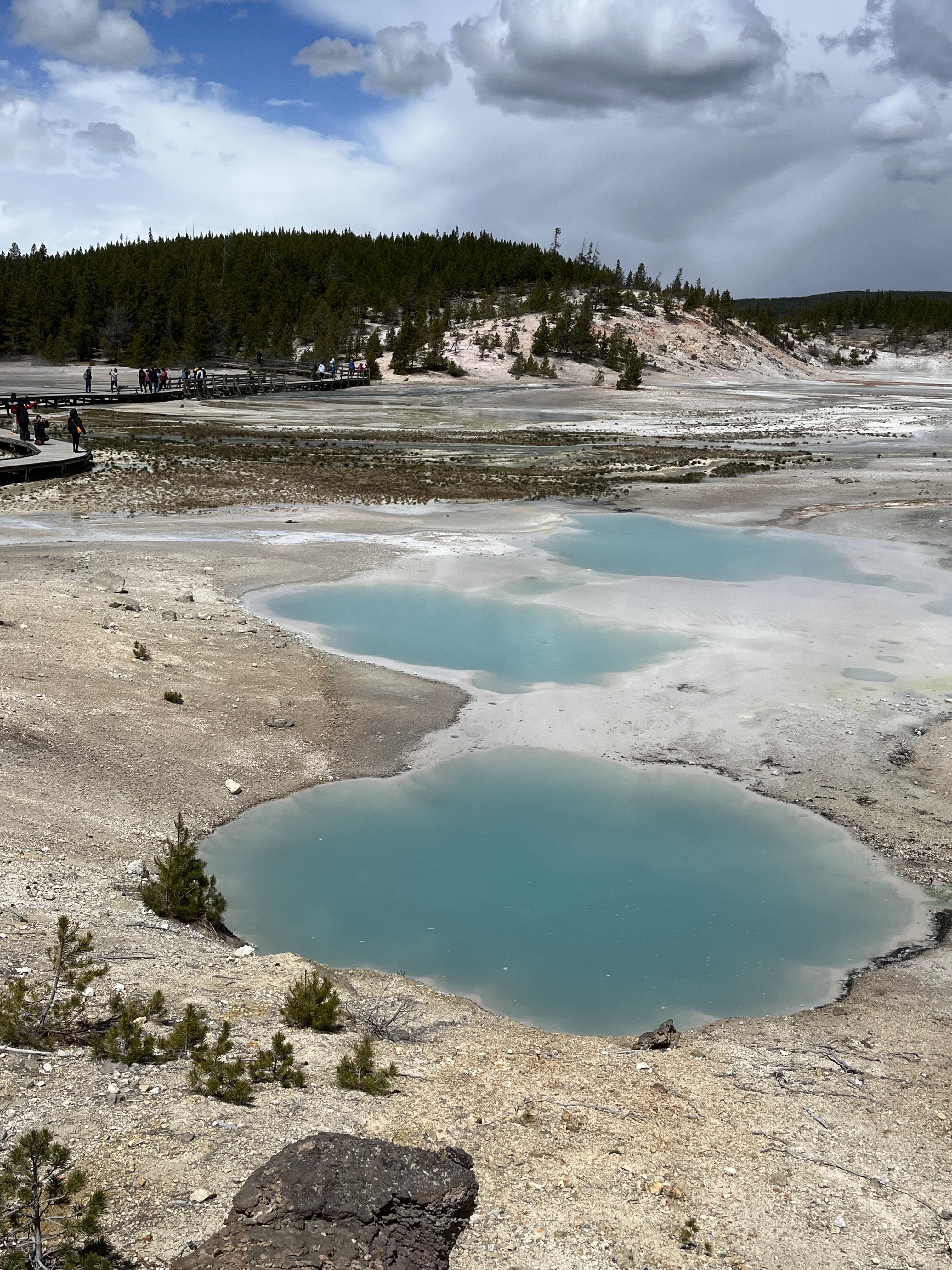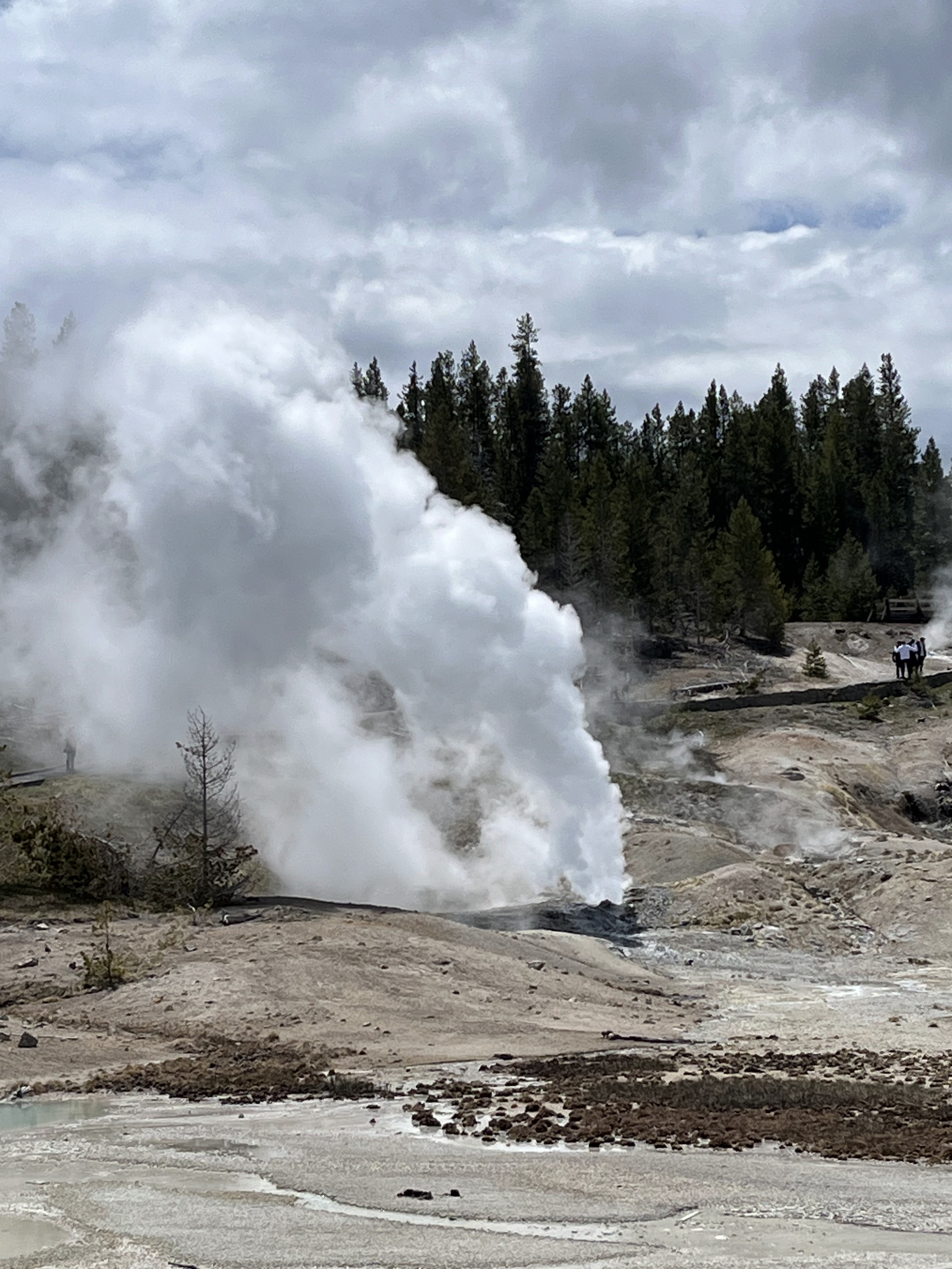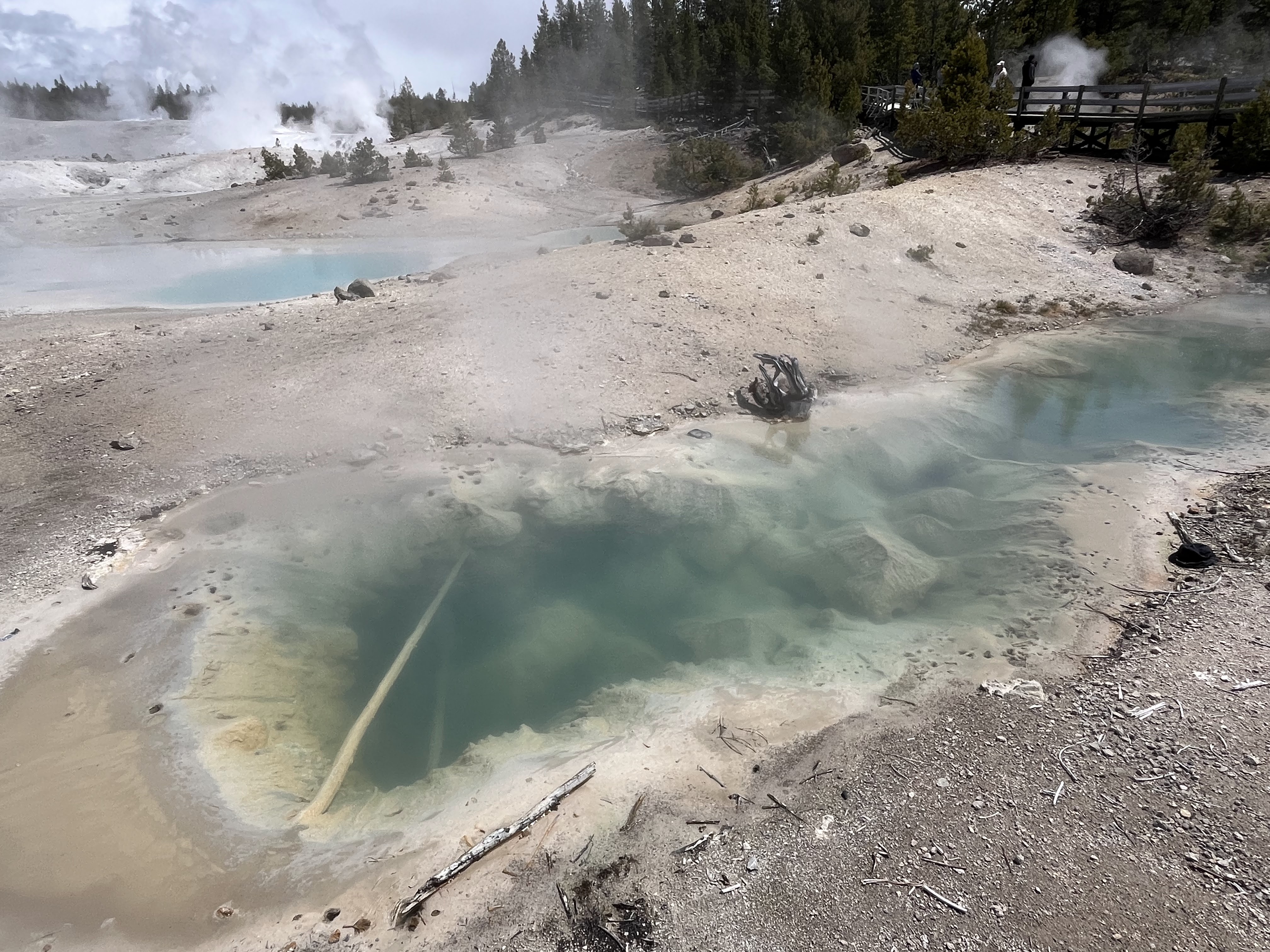 חזרנו מערבה ועצרנו לביקור גייזרים נוסף, באגן נוריס Norris Geyser Basin. החניה היתה מלאה אז חנינו ב Overflow על הכביש (מה שהוסיף איזה קילומטר לכל כיוון). כיוון שמדובר באתר פופולארי עם חניה לא גדולה, אולי עדיף היה להתחיל ממנו כשעוד היה מקום לחנות קרוב. גם פה יש מסלול הליכה מסודר על טיילת כיוון שהאדמה לוהטת, פריכה ומסוכנת. הנופים נראים כלקוחים מסרט מדע בדיוני ויש עמוד קיטור גדול במיוחד Black Growler Steam Vent שאפשר ממש לעבור דרך האדים שלו (אנחנו הקפנו). קשה לתאר כמה זה מיוחד. עשינו רק את הלולאה העליונה כי עוד היו לנו תוכניות להמשך היום.