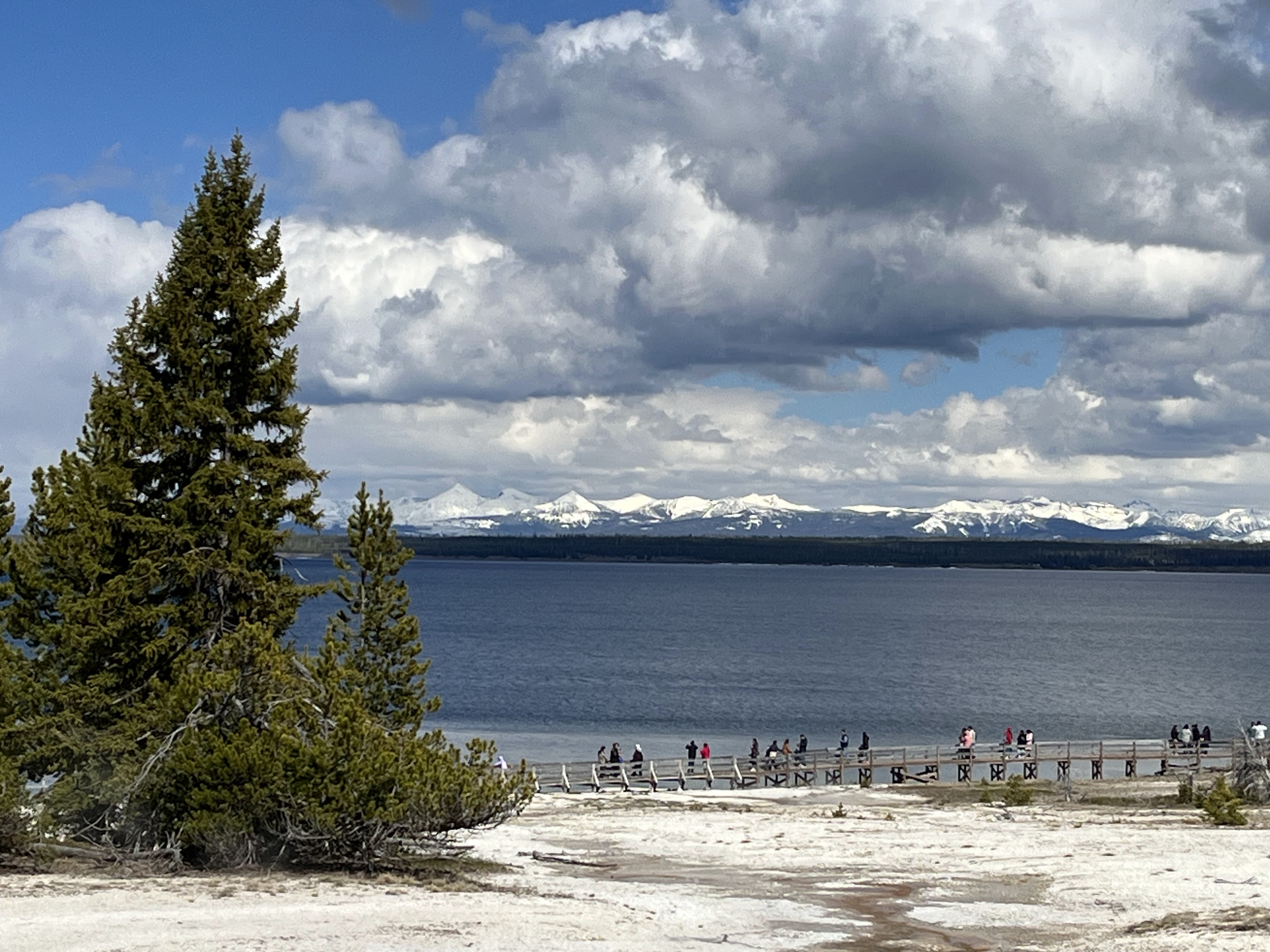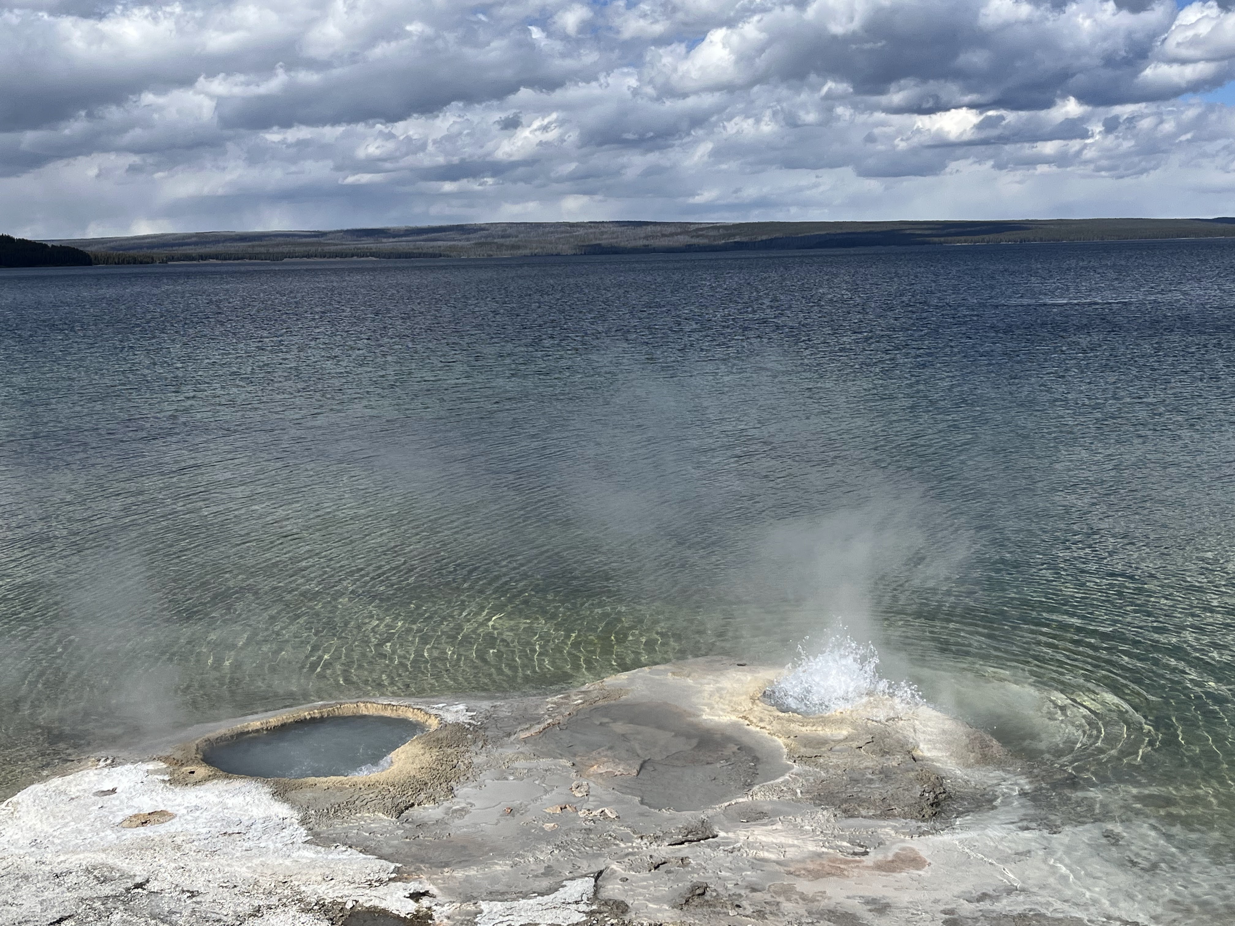 הייחוד של הנקודה הבאה שלנו, אגן הגייזרים West Thumb Geyser Basin, הוא מיקומו על שפת אגם ילוסטון. המסלול לא ארוך, והחלק הכי מעניין הוא לראות את המעיינות החמים שנובעים על שפת האגם הקר. בחורף האגם מתכסה שכבה של קרח, עם חורים במקומות בהם יש נביעות חמות.