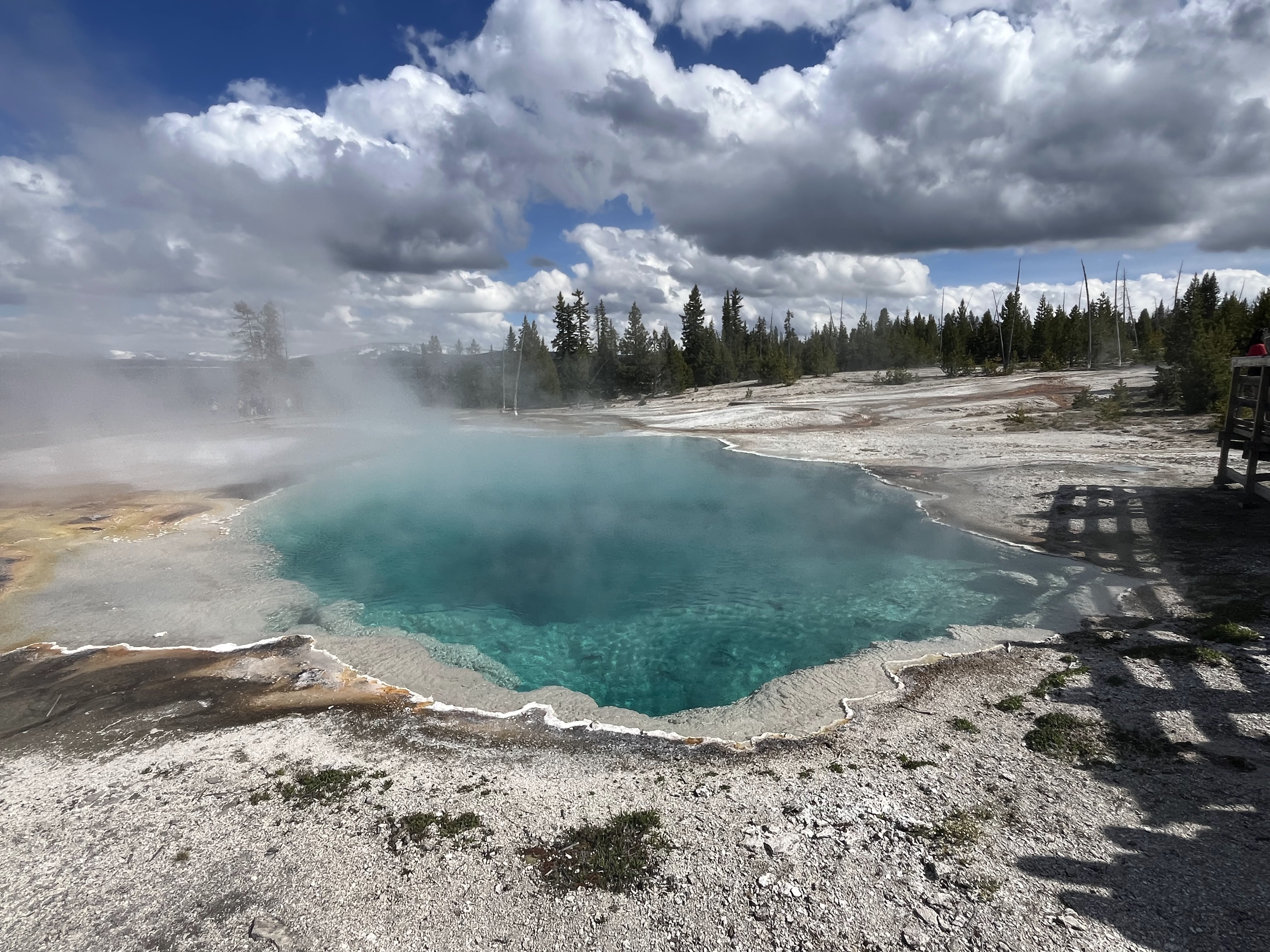המשכנו לעוד עצירה קצרה למסלול מהיר באגן הגייזרים שנקרא Biscuit Geyser Basin הכולל את בריכת הספיר Saphire Pool היפה ואת הגייזר Jewel Geyser שמתפרץ ככה בקטנה לעיתים קרובות. פה אפשר גם לראות את המים הרותחים זורמים לנהר ומעלים אדים (במיוחד במזג האויר הקר שהיה לנו).