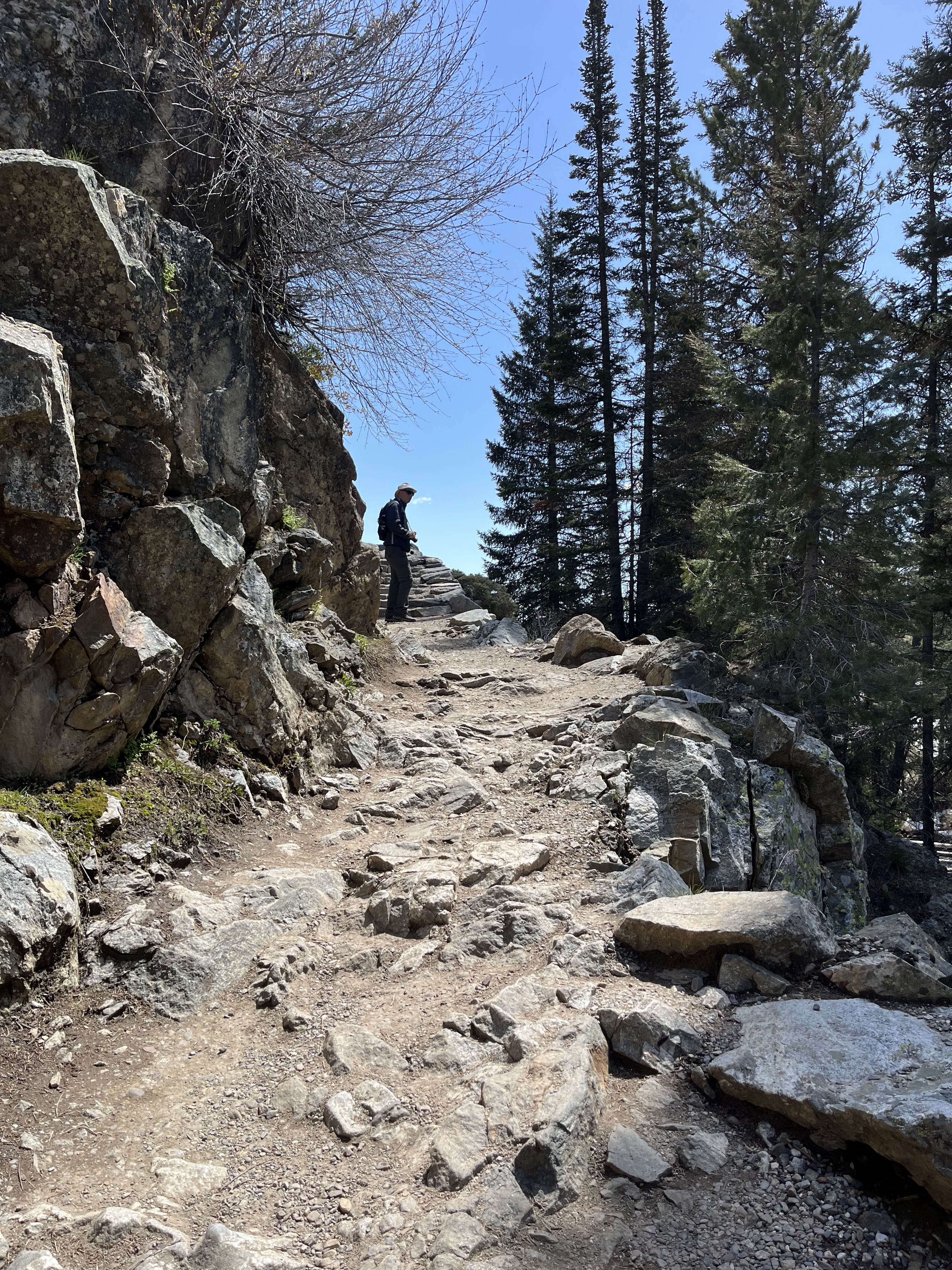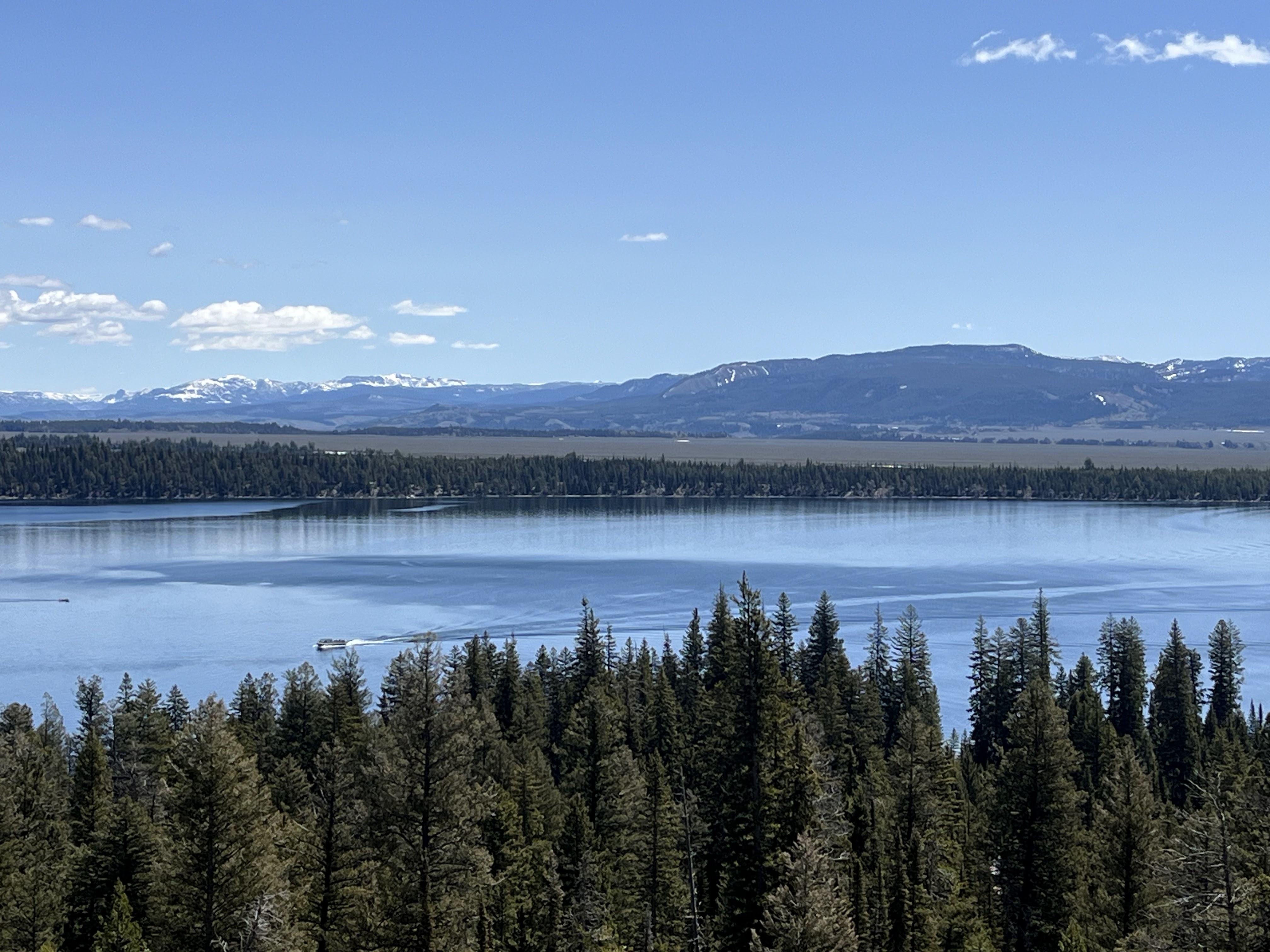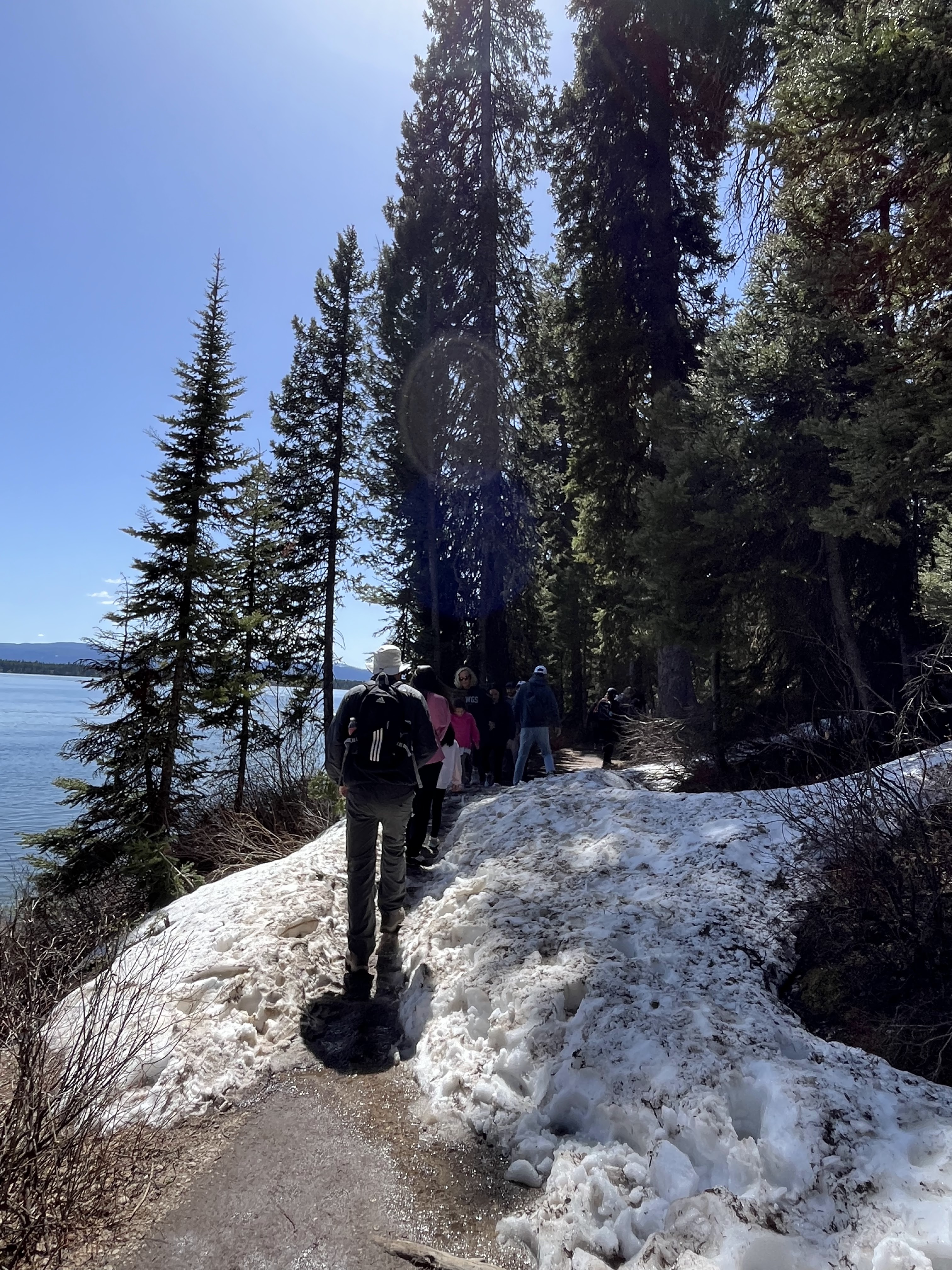 בהמלצת המדריך באפליקציה התחלנו בכביש הפנימי של הפארק כדי להגיע כמה שיותר מוקדם לאגם ג'ני Jenny Lake. זה המסלול הכי פופולארי בפארק והוא מתמלא מוקדם. חנינו על הכביש המוביל למרכז המבקרים (החניה היתה כבר מלאה) והלכנו למעגן הסירות כדי לשוט לצד השני של האגם למסלול ההליכה למפל הנסתר Hidden Falls ונקודת ההשראה Inspiration Point. סביב האגם יש גם מסלול הליכה ואפשר להקיף אותו במלואו. הסירה די מהירה ולוקח כ-10 דקות לחצות את האגם, אבל התור לעלות עליה לקח כ-40 דקות. זו אחת הסיבות שבחרנו לשוט בכיוון הלוך, ולחזור ברגל במסלול ההליכה. המסלול הוא מסלול בטבע, לא סלול והיו בו לא מעט אבנים, שלג ובוץ. החלק עד המפלים ברובו עליה מתונה, ומהמפלים לנקודת התצפית עליה יותר תלולה. אני מתקשה בעליות אז הלכנו רק עד נקודת תצפית מרשימה בערך בשליש הדרך בין המפל לנקודת ההשראה. הדרך חזור במסלול סובב ג'ני לייק (כ 2.5 מייל או 4 קילומטר), יפה ועוברת בחלקה הגדול לאורך חופי האגם, אבל זה היה היום הכי חם בטיול אז קצת סבלנו מהחום.