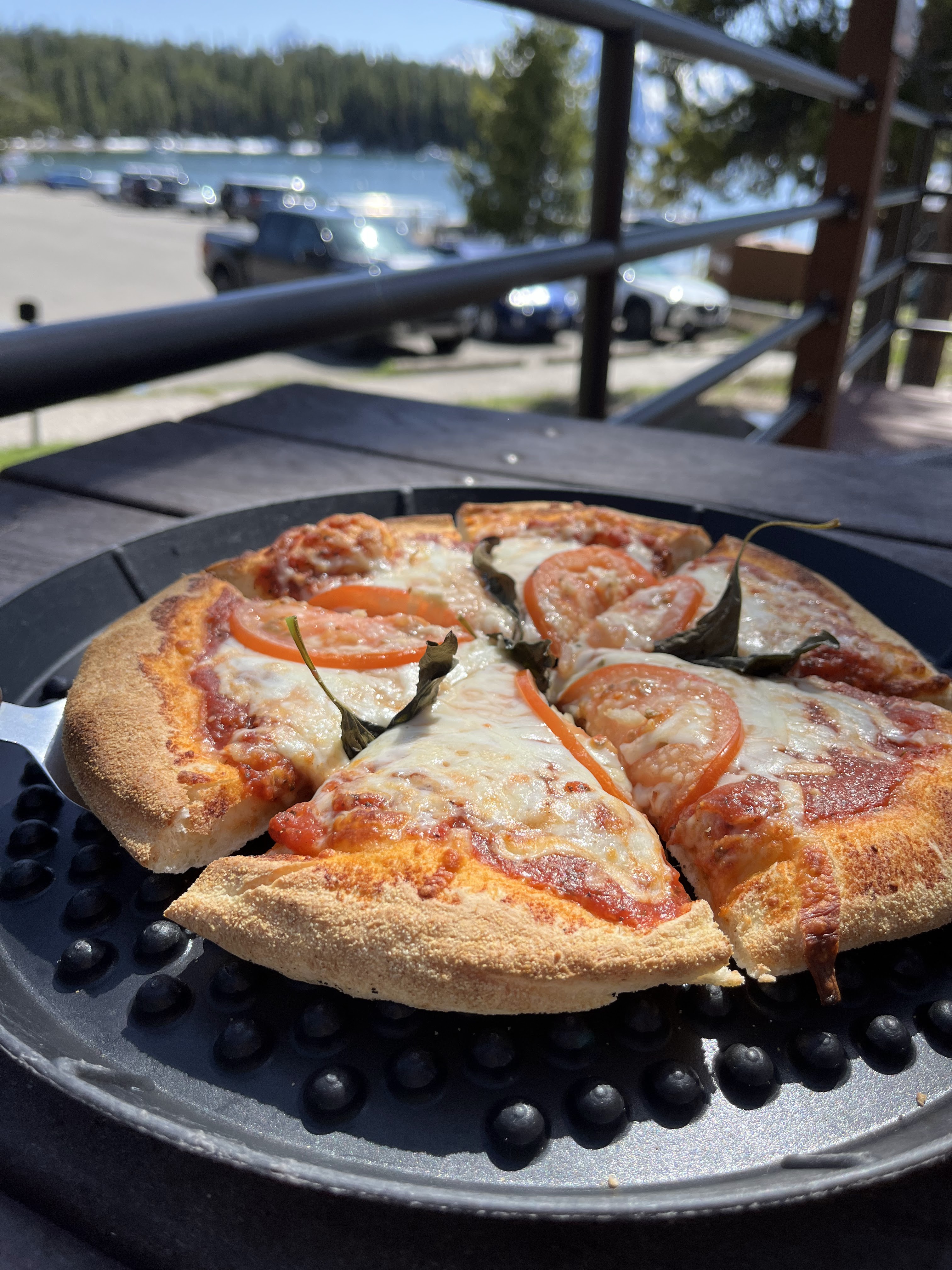 ארוחת צהרים עם נוף משגע של האגם וההרים ב Leek's Marina & Pizzeria.