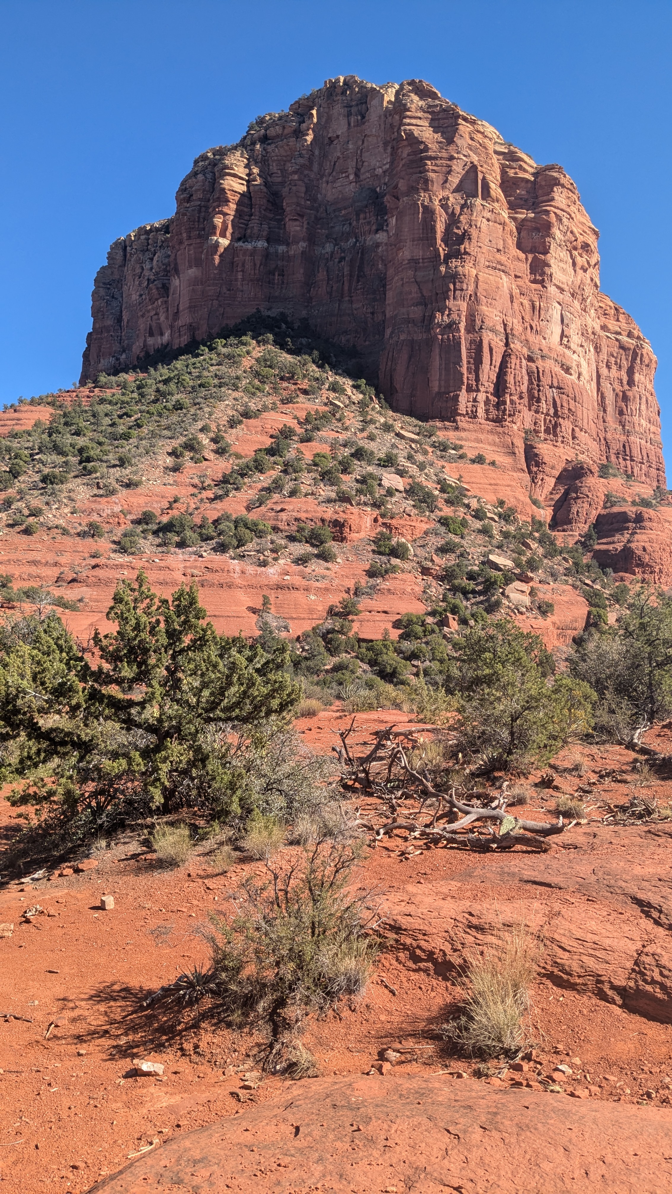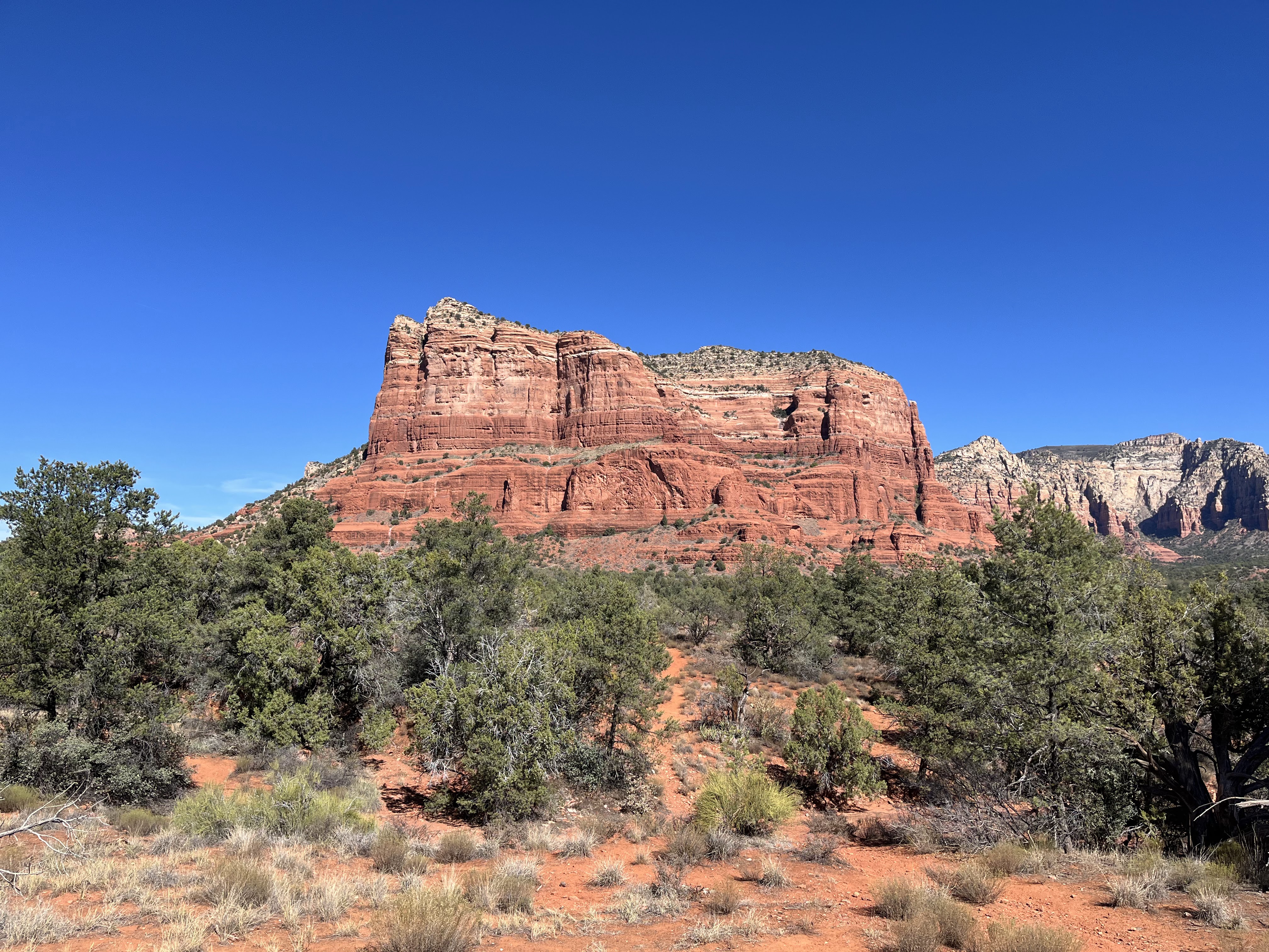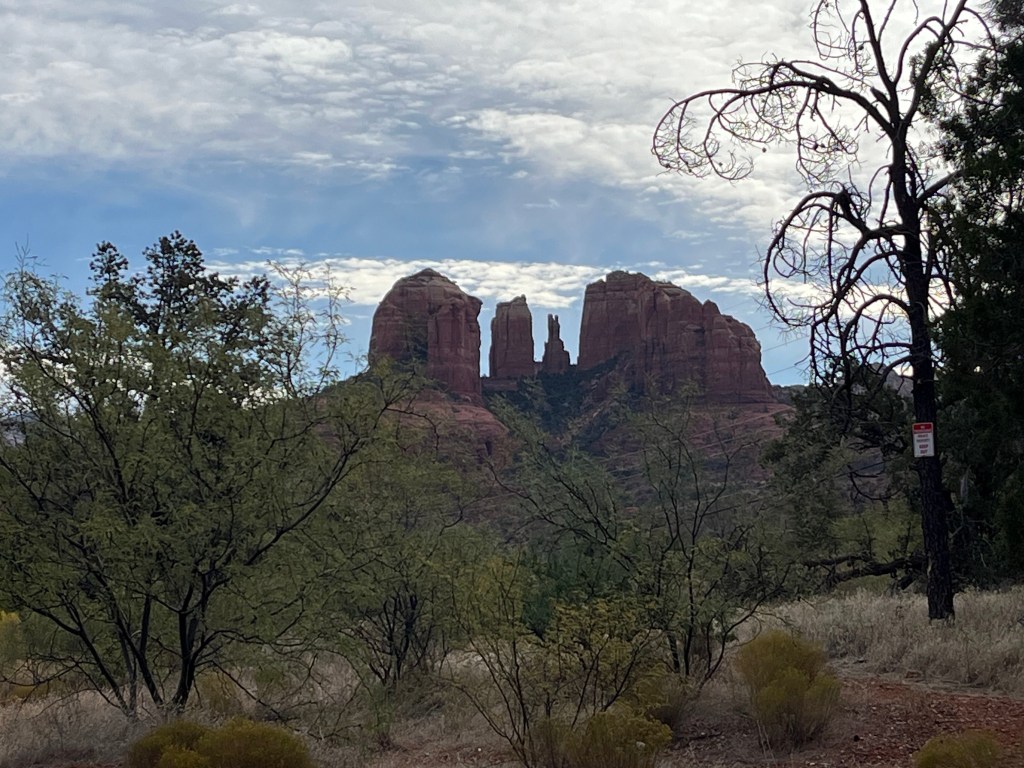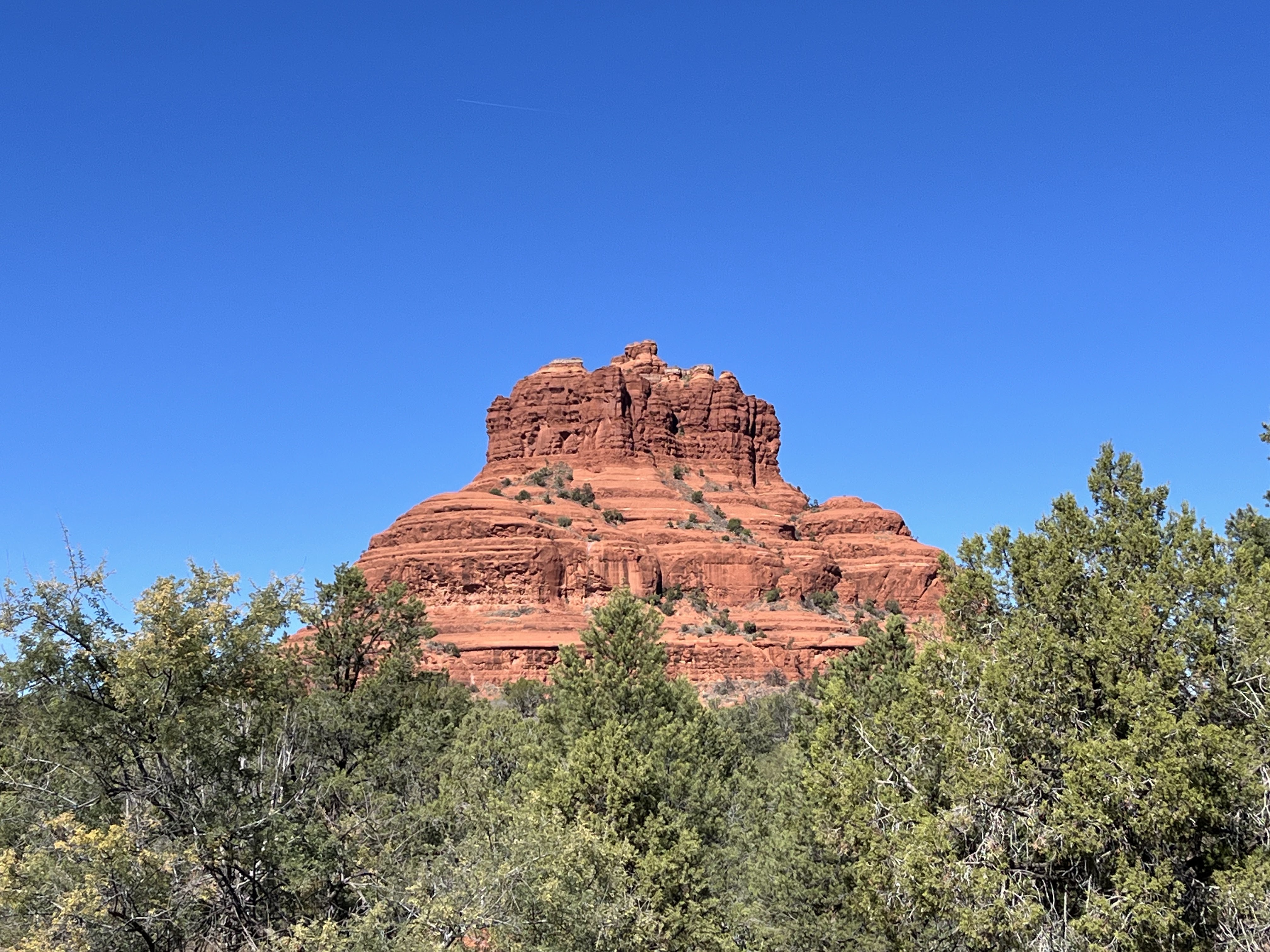 כשירדנו מהכביש המהיר I-17 הפעלנו את האפליקציה האהובה עלינו Guidealong כדי לקבל הסברים והמלצות על נקודות עצירה. ועשינו הפסקת צילום ראשונה בחניה של אחד ממסלולי ההליכה Bell Rock Pathway Trailhead Parking Lot כדי להתרשם משניים מההרים המרשימים שמדרום לסדונה Bell Rock, ו- Courthouse Butte. הנופים של ההרים האדומים יפיפיים, ואין שובע מהיופי.