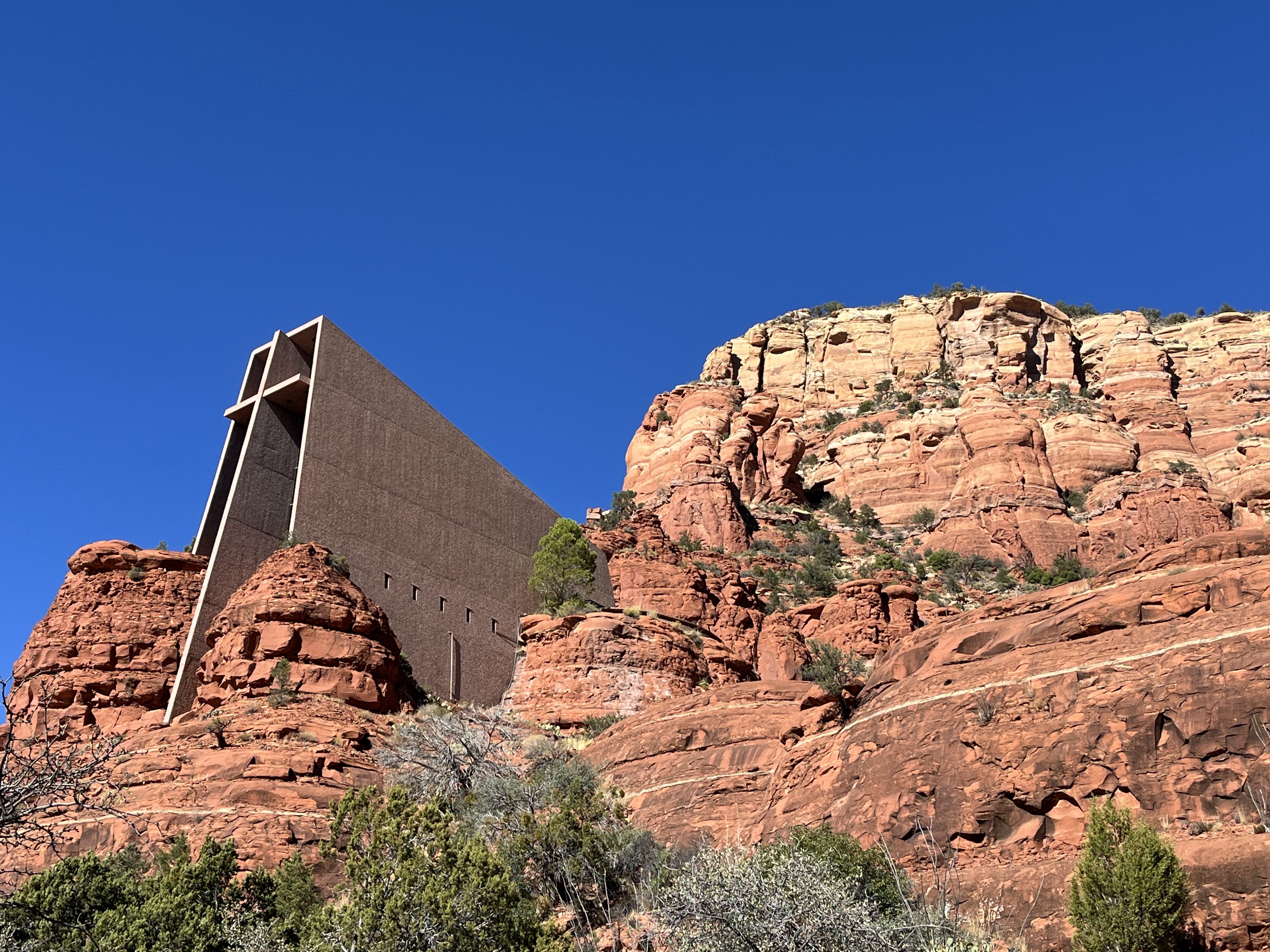 הנקודה הבאה שלנו לאורך כביש 179 היתה הכנסייה הפוטוגנית שעל ההר Chapel of the Holy Cross. הכנסייה פוטוגנית למדי, אבל פיצפונת ואין בה איזה בשורה מרגשת. לדעתי מספיק לצלם אותה מלמטה. אבל אם אתם רוצים להתרשם בעצמכם, קבלו טיפ חשוב: לא להתפתות לחנות בחניה התחתונה לפני שמנסים את השתיים הגבוהות יותר כדי לחסוך הליכה מיותרת. אנחנו חנינו כמובן בחניה התחתונה והצטערנו כל הדרך עד למעלה.