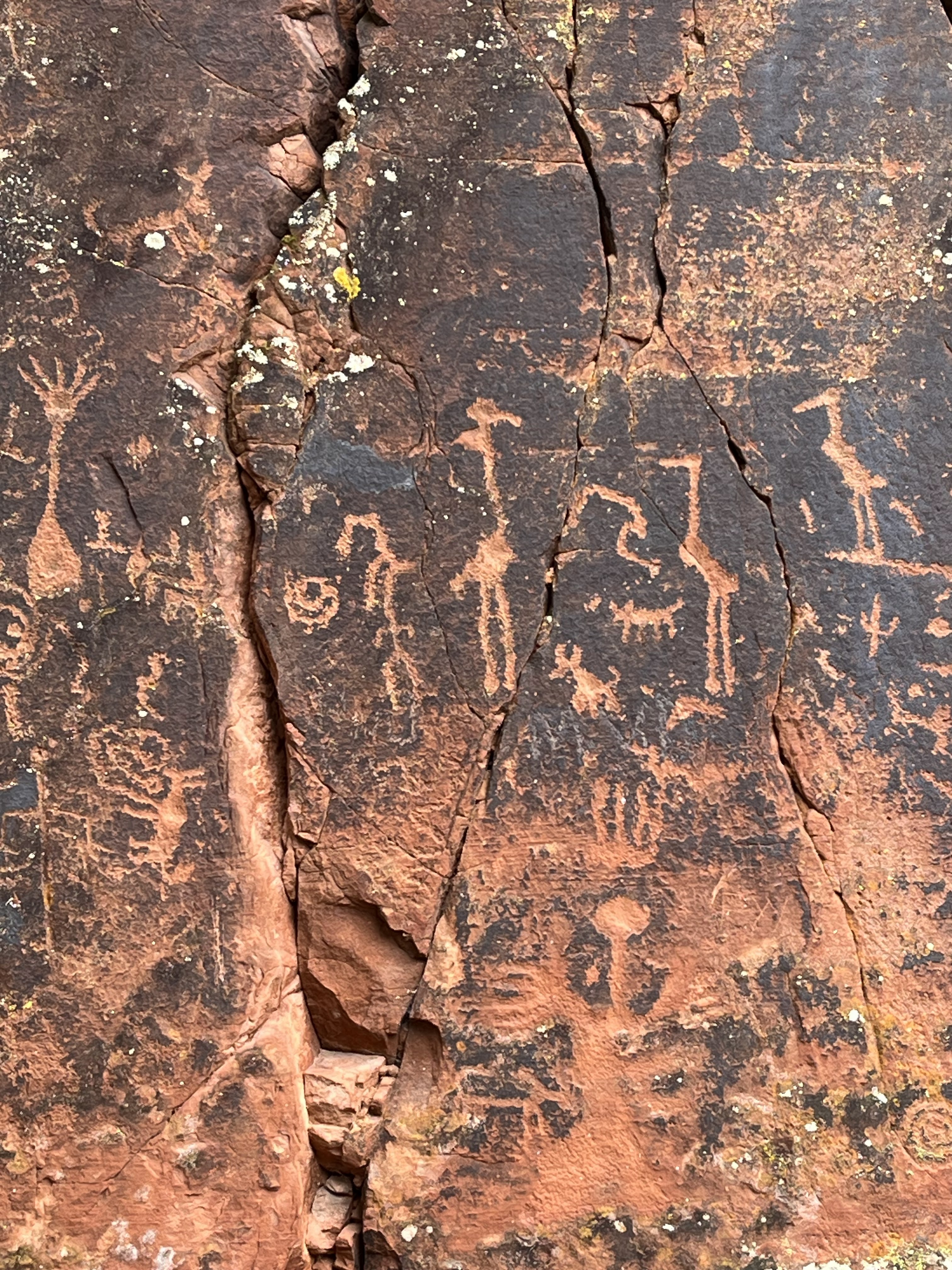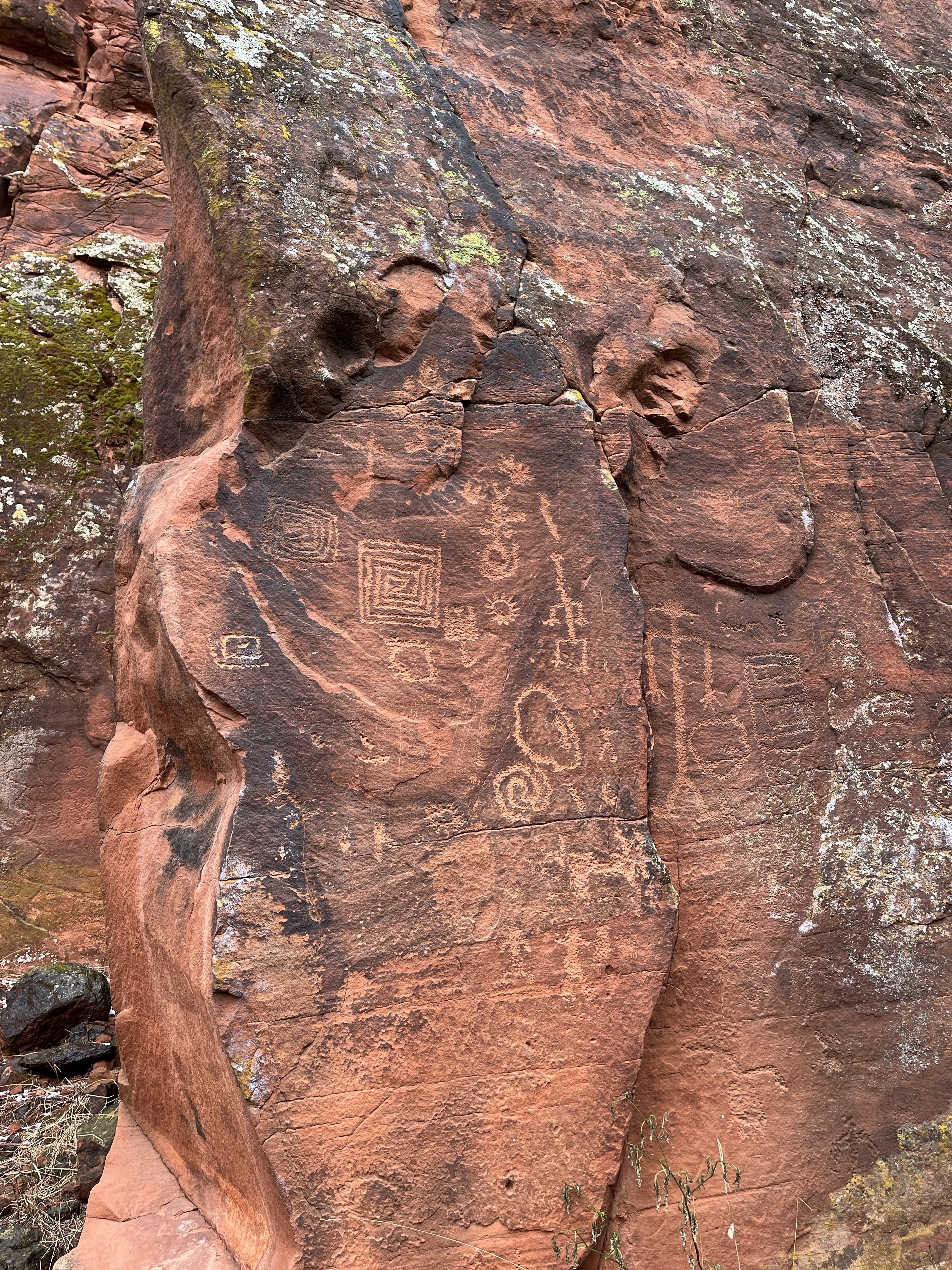 חזרנו קצת על עקבותינו, ונסענו ליעד ההיסטורי הבא שלנו – קיר פטרוגליפים Crane Petroglyph Heritage Site. פטרוגליפים הם ציורי קיר נאיבים שנעשו על ידי תרבויות עתיקות. יצא לנו לראות פטרוגליפים במערה ליד סנטה ברברה, באי הגדול בהוואי, בעמק האש שליד לאס ווגאס. ואם לא היה ברור, אני מאד מתרגשת מפטרוגליפים. לראות ציורי קיר שנעשו על ידי אנשים לפני 1000 שנה פשוט מטורף בעיני. והאתר הזה היה המוצלח והמעניין מכל אלו שראינו עד היום. החלק האחרון של הנסיעה הוא על כביש עפר, אבל במצב טוב, לא דורש 4X4. נרשמנו במרכז המבקרים הפיצפון, הלכנו מסלול לא ארוך עד האתר, ונדהמנו מכמות ואיכות הציורים. ליד קיר הציורים היה מדריך של רשות היערות שסיפר לנו על האתר, ועל שעון השמש החקלאי ששימש לקביעת זמני זריעה בהתאם למצב השמש. נהניתי מאד.
