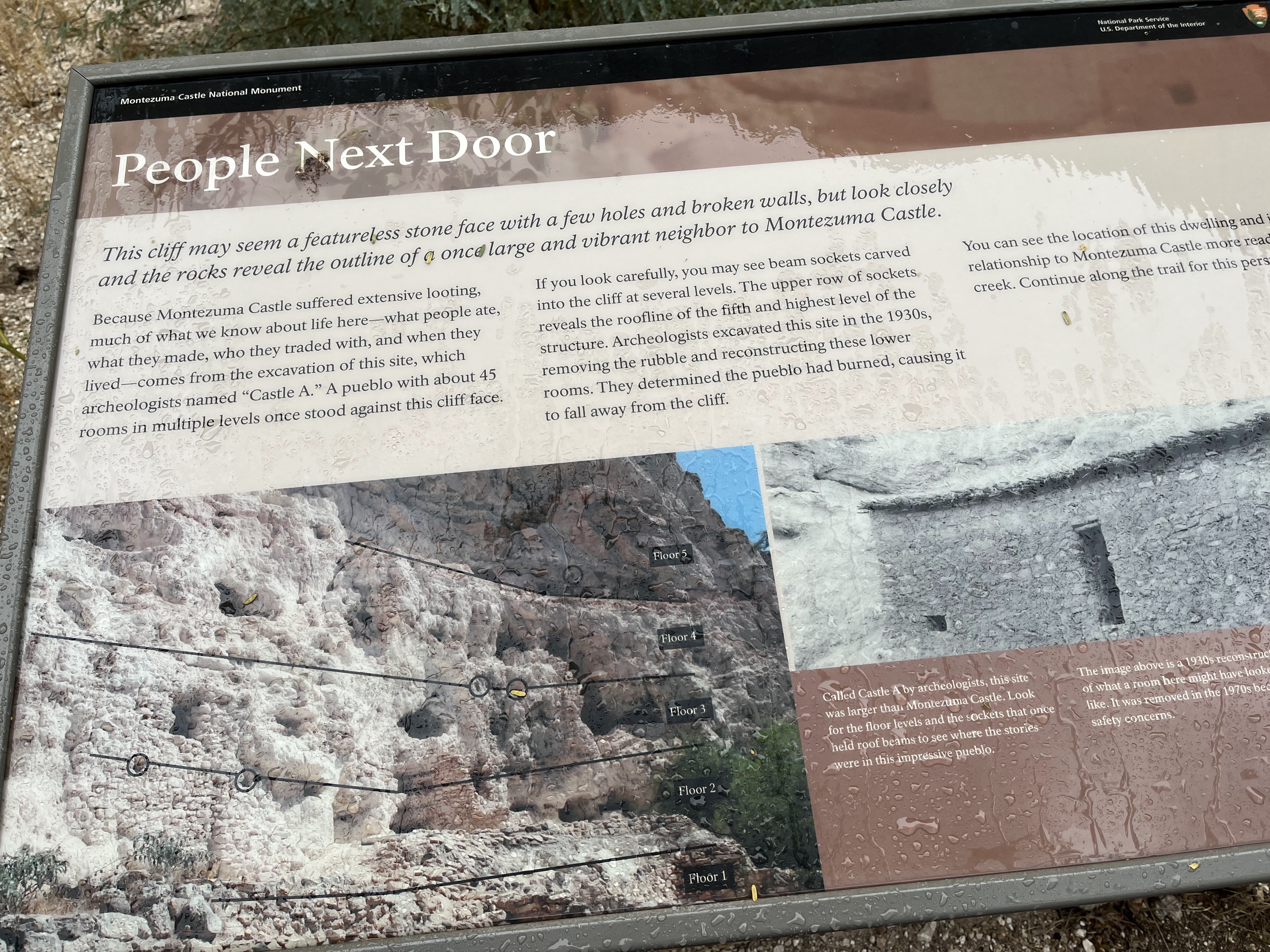 המשכנו בדרכנו, ובינתיים התחיל גשם שוטף אז עצרנו לארוחה מהירה ב-Sonic, מסעדת מזון מהיר ולא מאד איכותי. חיכינו שהגשם קצת ירגע, ואז נסענו ליעד האחרון בסיור התרבויות העתיקות שלנו Montezuma Castle National Monument, שממש לא קשור למונטזומה – השליט האצטקי, ובוודאי שאינו טירה, אלא מקבץ של יישובי מצוק cliff dwellings, בתים שנבנו במערות טבעיות על הקיר של המצוק. האתר משומר להפליא, ומרשים מאד. יש במקום גם דגם שמתאר את המבנה הפנימי והשימוש של החדרים השונים, ואפשר לקבל הסברים בלחיצת כפתור. הדגם גם הראה שהמעבר בין הקומות בבתים הרב קומתיים האלו היה בעזרת סולמות.