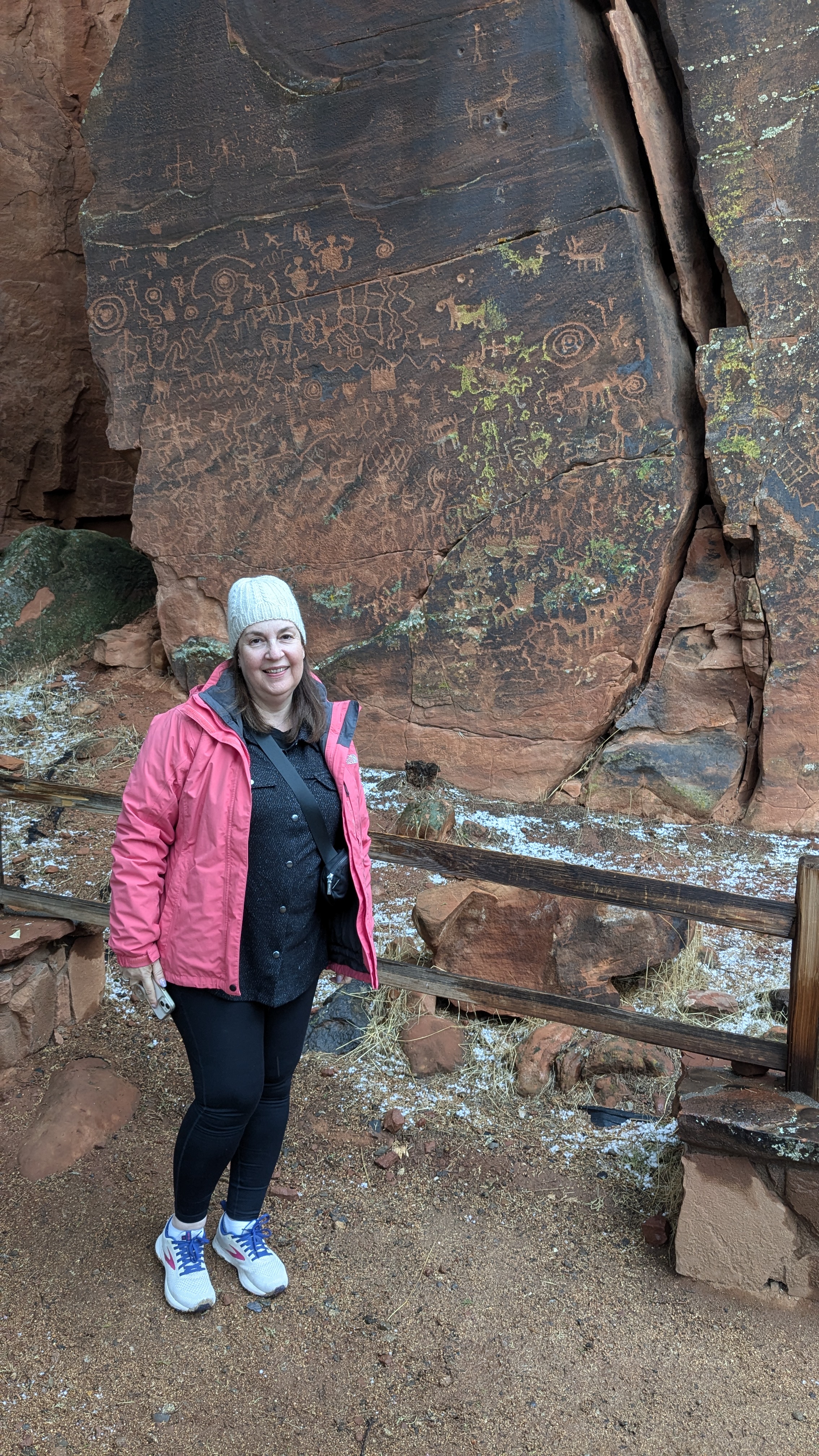 כן עשינו עצירה לביקור בפארק המדינה Red Rock State Park לסיור רגלי לא ארוך. הפארק הזה ידוע בשפע של מסלולים קלים ובעלי החיים שפוקדים אותו. בכניסה אמר לנו הבחור בקופה שיש סיור מודרך שמתחיל ממש תכף אז הצטרפנו. הסיור המודרך היה מעניין ממש, קיבלנו המון הסברים על החי והצומח המקומיים, והמדריכה גם הסבה את תשומת ליבנו למאובנים בסלע ופטרוגליף על אחד הסלעים. אבל, וזה אבל גדול, גם המדריכים וגם הקהל היו די קשישים והסיור התנהל באיטיות מוגזמת. ואת זה אני אומרת בתוך אחת שמאד איטית בעצמה. אז למרות שהתוכנית המקורית היתה לעשות כמה מסלולים קלים, הסתפקנו רק בזה של הסיור Smoke Trail.